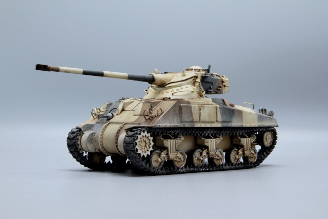 Красил Тамией, Ганзой, масло, химия от АK и AMMO MiG. Пытался изобразить камуфляж не идентифицированного Шермана египетской армии, 1950 года.