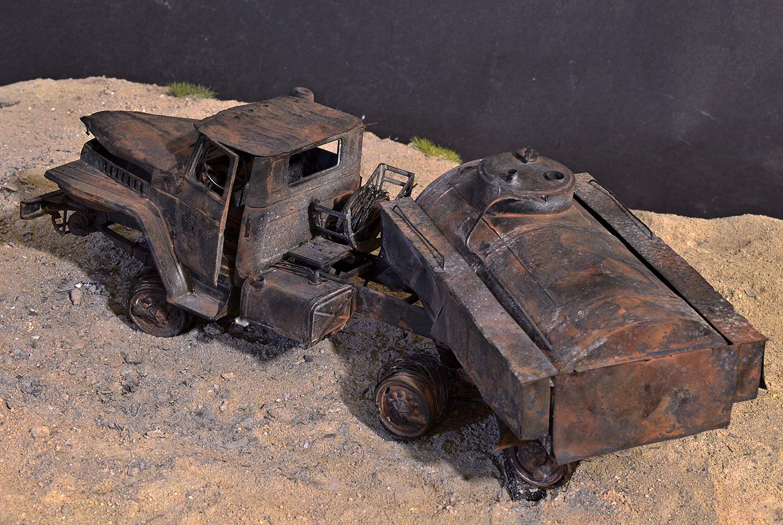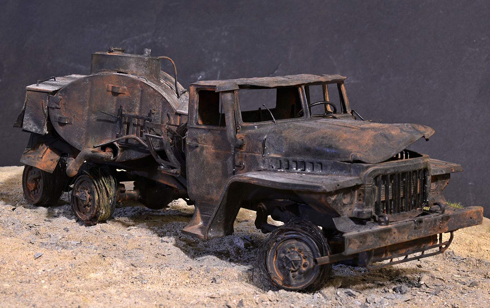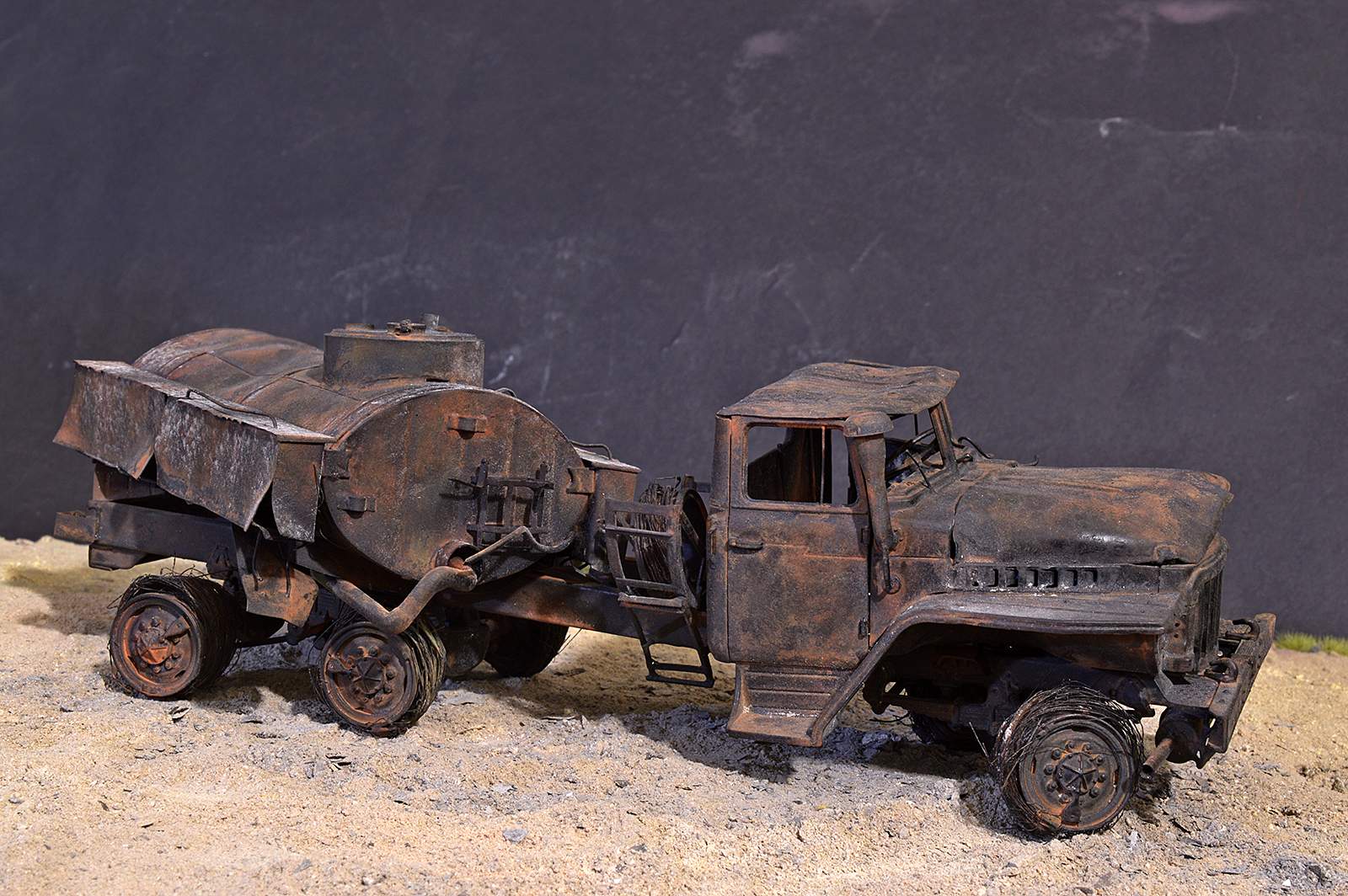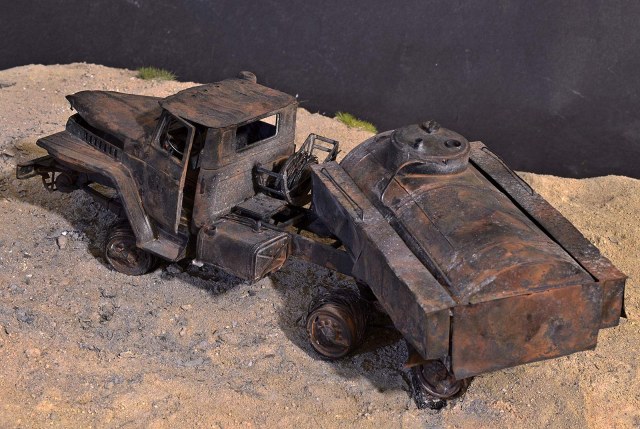 Вот собрал и… сжёг бензовоз. Так, в принципе, можно было бы и не выставлять отдельно. Но всё же модель получилась эксклюзивная в каком-то смыле. Топливозаправщиков в   35-м, да ещё на базе Урала никто из производителей не выпускает, а жаль… Поэтому я прикупил модель бензовоза от ICM в 72-м, вооружился фотографиями реального топливозаправщика и понеслось…