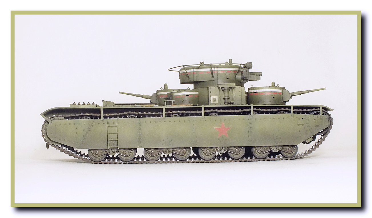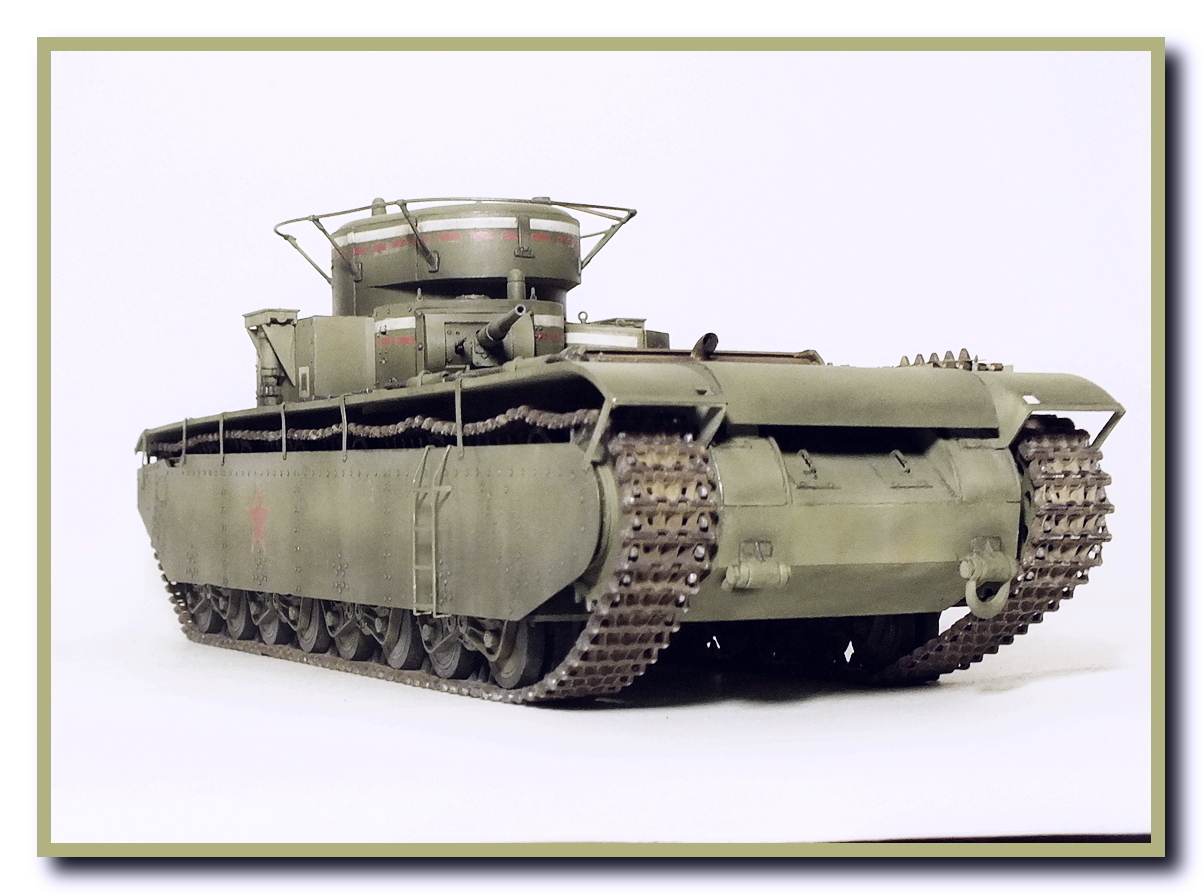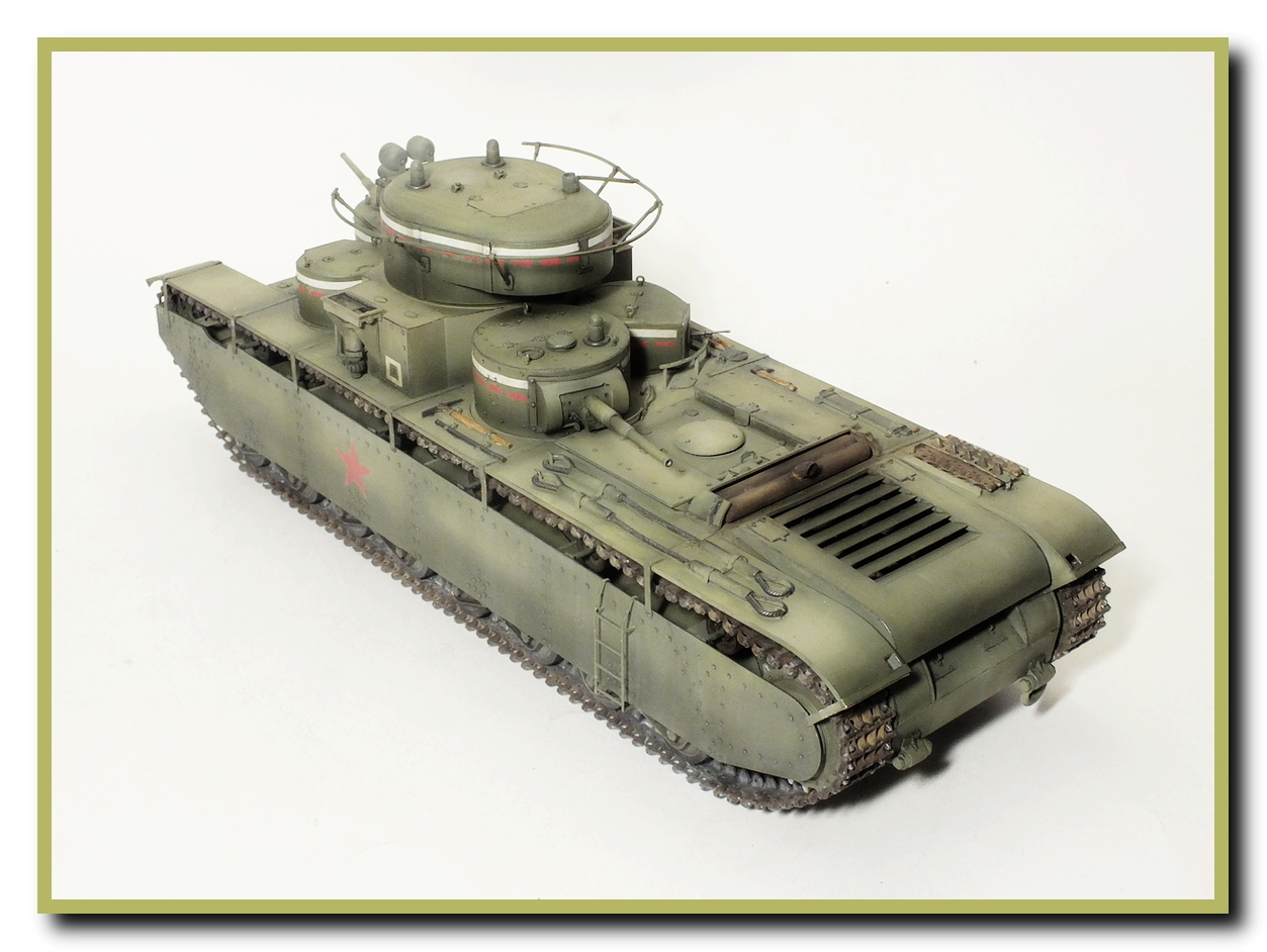 Приветствую всех,уважаемые Каропчане!Представляю очередную свою работу-модель танка Т-35 от известного производителя.Коробка была приобретена давно и наконец-то дождалась своего часа.Некоторые детали на литниках имеют небольшие швы от стыка пресс форм,но стыкуемость вполне себе хорошая.Также набор имеет четыре платы травления,что достаточно для стройки.А если бы еще и крепления шанца были,то было бы вообще прекрасно.Собирал модель чисто из коробки,без каких либо доработок.Использовались лишь дополнения такие как стволы пулеметов и пушек от Zedval,сигнал от того же производителя,а также траки от Friul model.Стволы пулеметов пришлось комбинировать с пластиковыми основаниями,что очень неудобно,благо есть тонкие и острые сверла для изготовления отверстий под стволы.Также обрезал штрих пунктирные декали,дабы придать им хоть какую-то масштабность.Сами декали довольно хлипкие,так,что приходилось их клеить и отдельными пунктирами,ибо целиковые рвутся,хотя это может быть и результат собственной криворукости.В наборе декалей отсутствует декаль с номером взвода,ее задувал по трафарету.