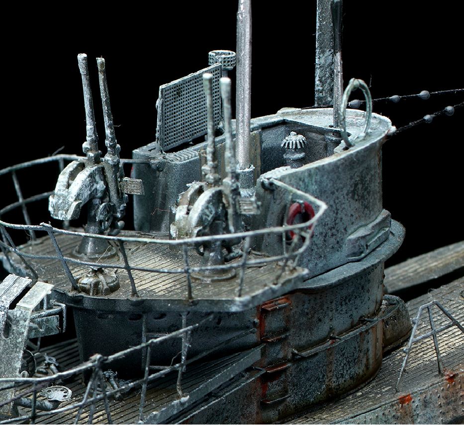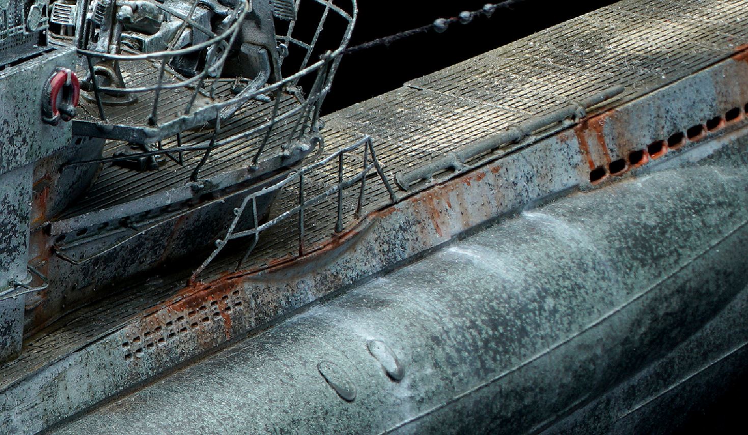 Стволы и механизмы зениток при походе обычно обслуживались, смазывались и закупоривались, щит и прицельные устройства 37мм зенитного автомата обычно складывались в подводном положении и такие эффекты как на корпусе там совсем не в тему, ган-метал на стволах смотрелся бы намного лучше и натуральнее.