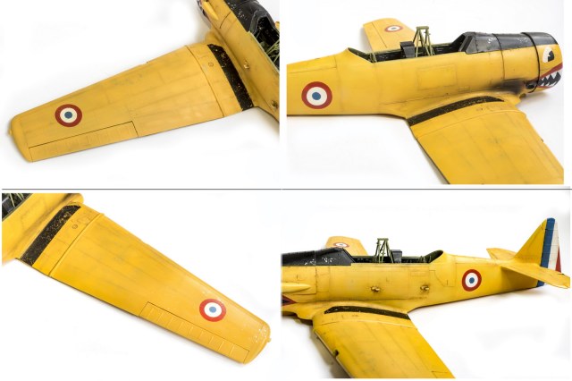 Так как двигатель практически не виден, то и работы немного. Добавил чуть травления, кое-где доработал и покрасил. После основной сборки фюзеляжа ( шпаклевка наше всё!) покрасил в жёлтый цвет, который нанёс 2 оттенка — основной и чуть светлее. Решил перевести декали но носовую часть забавную пасть. А она с одной стороны взяла и рассыпалась. С другой стороны всё прекрасно( почти, если не считать оного кусочка). Стал я внимательно смотреть на декали - уже не с восторгом, а с предубеждением. Первое — красный цвет не красный , а какой-то оранжево-кирпичный. Ладно, думаю Африка — выгорел цвет. НО такой цвет на всех 9 вариантах разных стран. Второе — синий цвет не синий, а голубой. Ну и белый весьма просвечивает. Хорошо, что одна декаль ещё не закрепилась, снял её и декали в помойку. А жаль....Взял я скотч и стал делать маски.