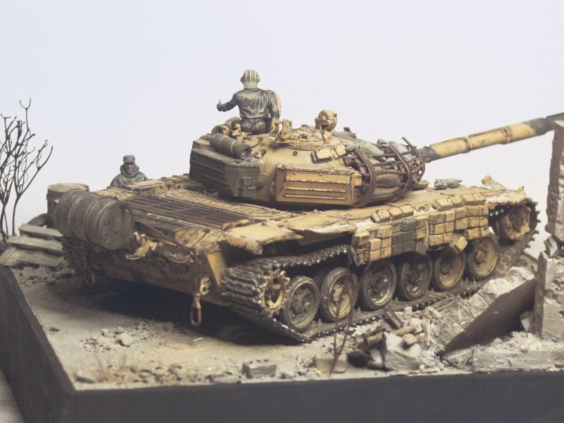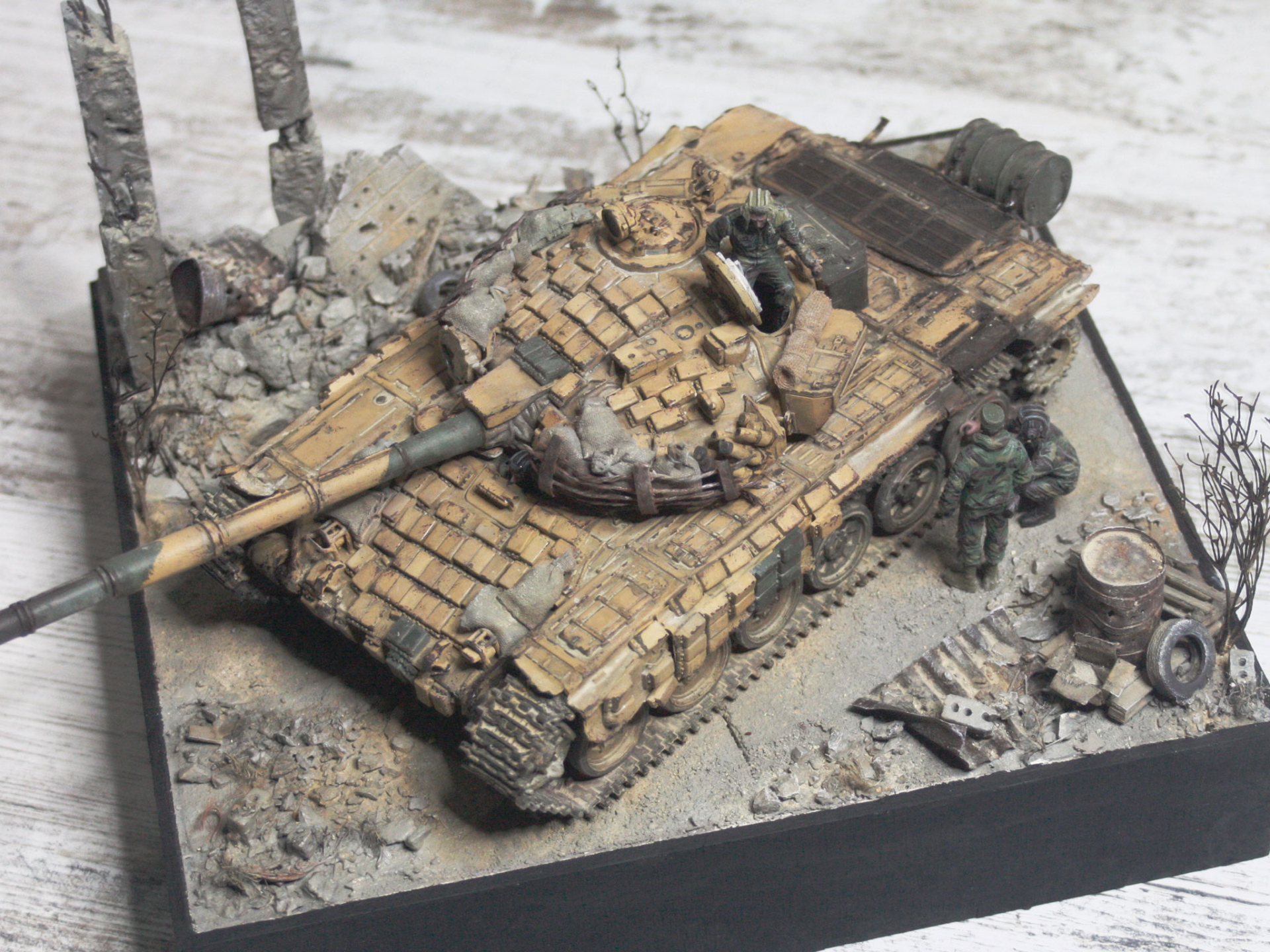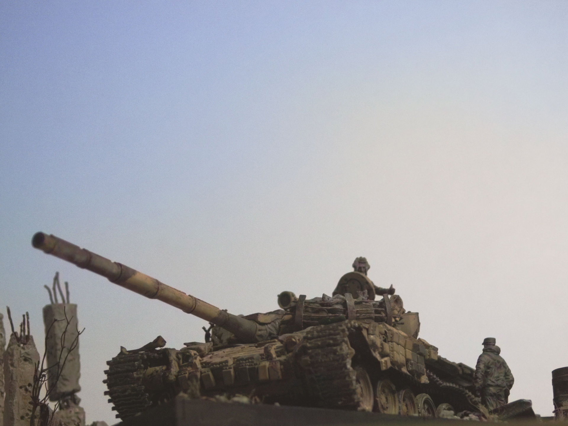В дальнейшем решил добавить элементы "полевого тюнинга" из мешков и арматуры (проволока, мешки из пластилина и пластыря). Добавил боевой побитости и урона, отпилил некоторые элементы и сделал помятые и пивной жести. Так же не обошлось без покупки аэрографа красок и т.д. Красил с модуляцией цвета и шейдингом, он немного потерялся так как добавлял цветового разнообразия с помощью кисточек. Лак, смывка маслом, чипинг акрил, фильтры художественное масло, пастель, матовый лак. Танк остался на неделю в одиночестве, позже решил добавить ему немного окружения в стиле боев в Сирии 2011 (алебастр, пакля, пивная жесть, бортики фанера 4-ка). Танкисты Miniart+акрил. Вот и весь процесс создания, остается не забрасывать данное благородное занятие. P.S. Не судите строго, косяков и неточностей конечно же море, перегрязнил, но будет старатся учесть это в дальнейшем! Спасибо, приятного просмотра!