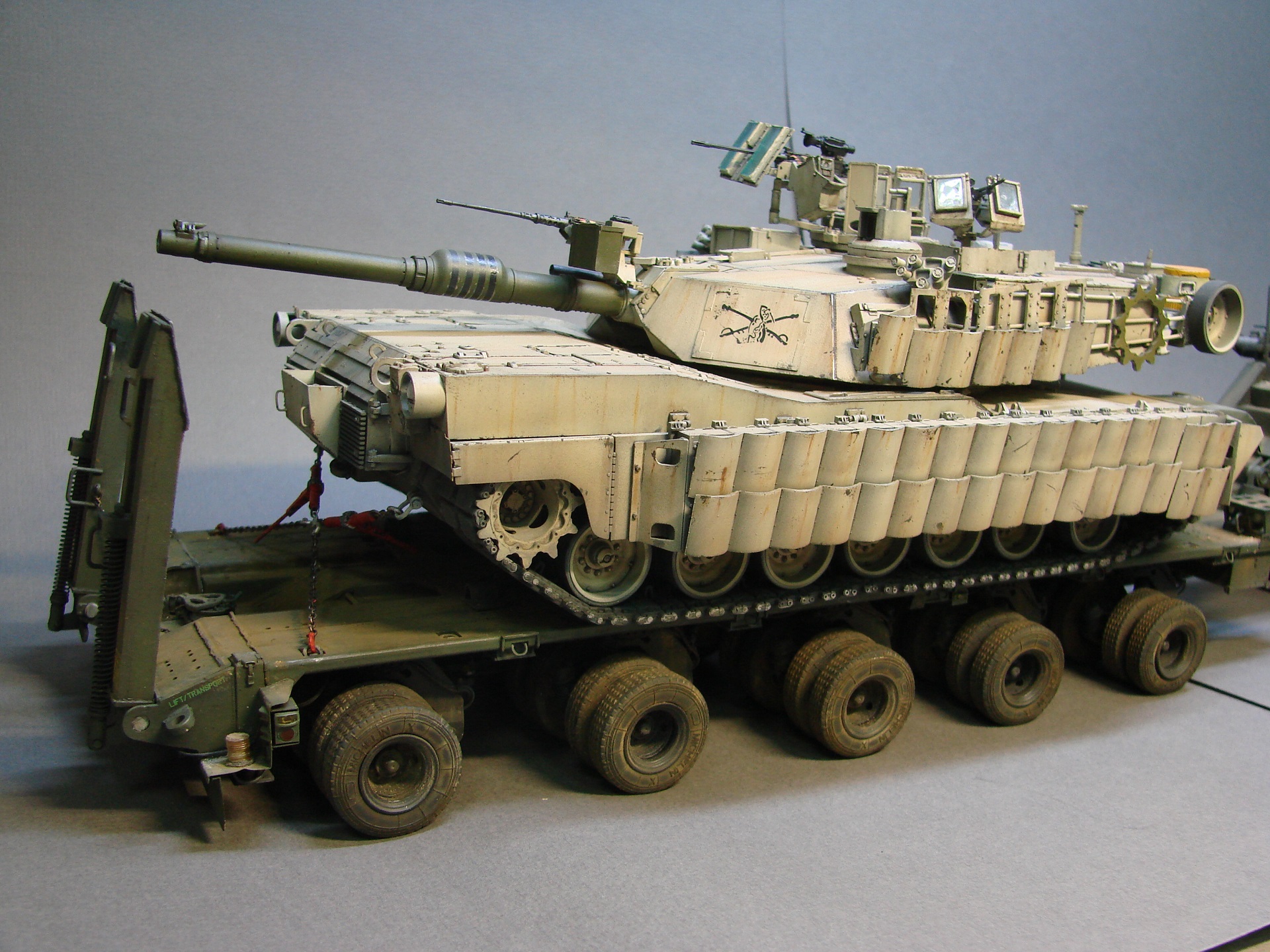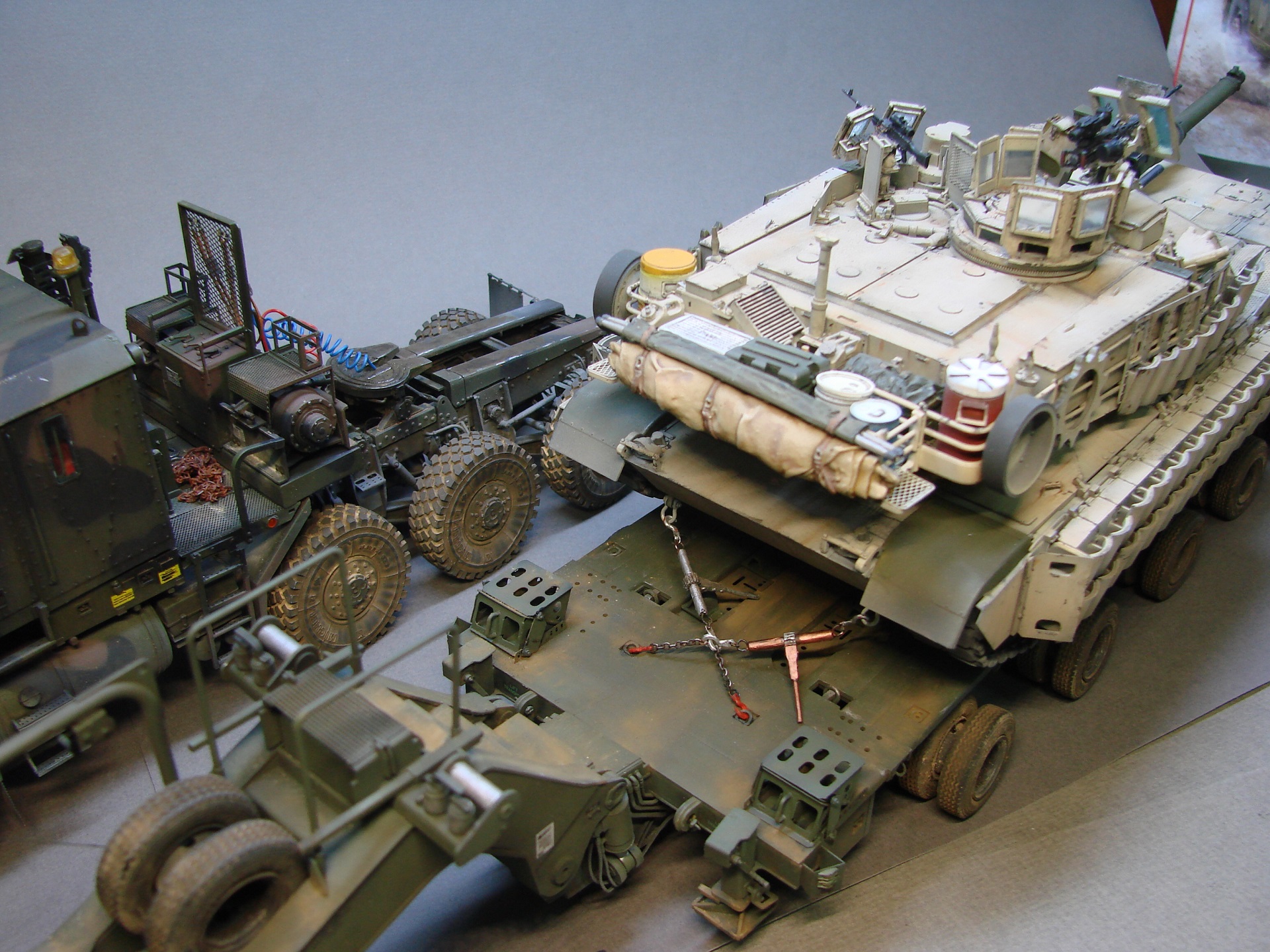 Доброго времени суток! Данную модель завершил еще в том году (2020 ) , но так как руки все ни как не доходили растянуть абрамса по тралу,фотографировать смысла не было. И так по модели, деталей в наборе просто тьма! от чего удовольствие в сборке только увеличивалось,но , этого показалось мало , решено было доработать проводку и гидравлику по максимуму, плюс был добавлен двигатель с колесами (смола) от REAL MODELS. проволоки и резиновых жгутов ушло энное количество)) Салон заполнил личными и не только вещами ,что в свою очередь оживило салон кабины, рацию установил от фирмы Stars , растяжки с крюками самодел сделанный по фото , фотографировать целиком этого дурочка оказалось не так то просто, по этому фото разделил на несколько частей, до кучи докинул не много процесса сборки.