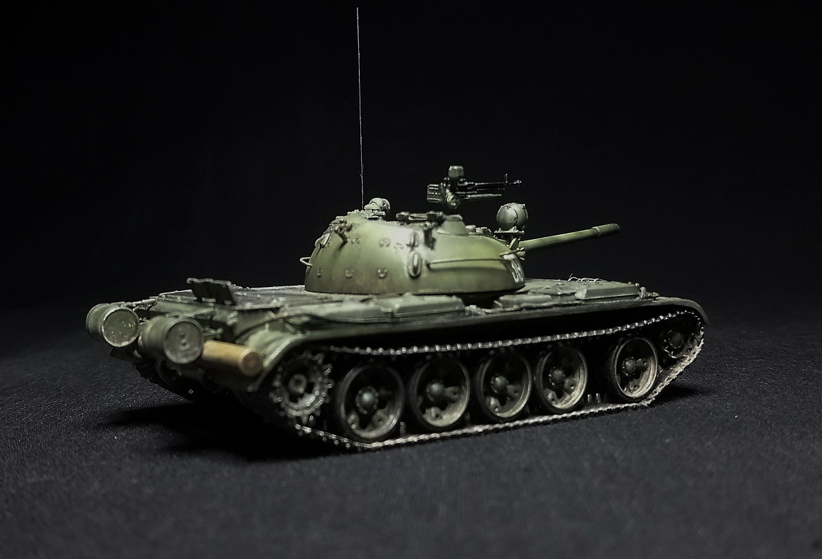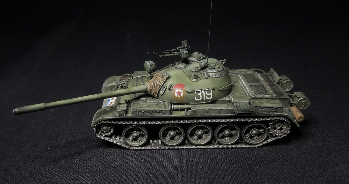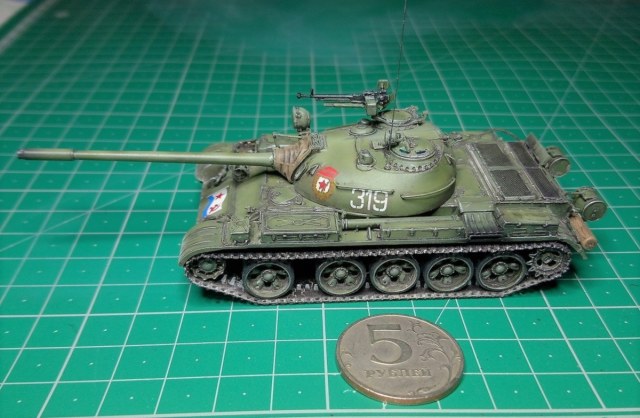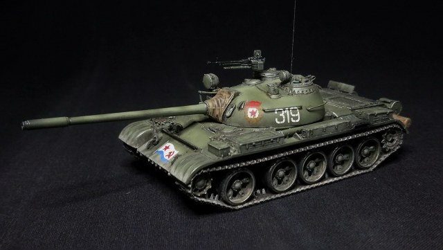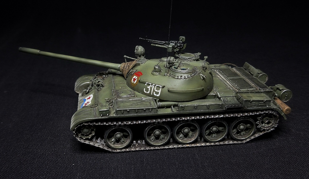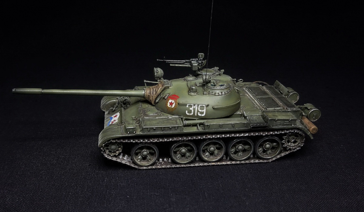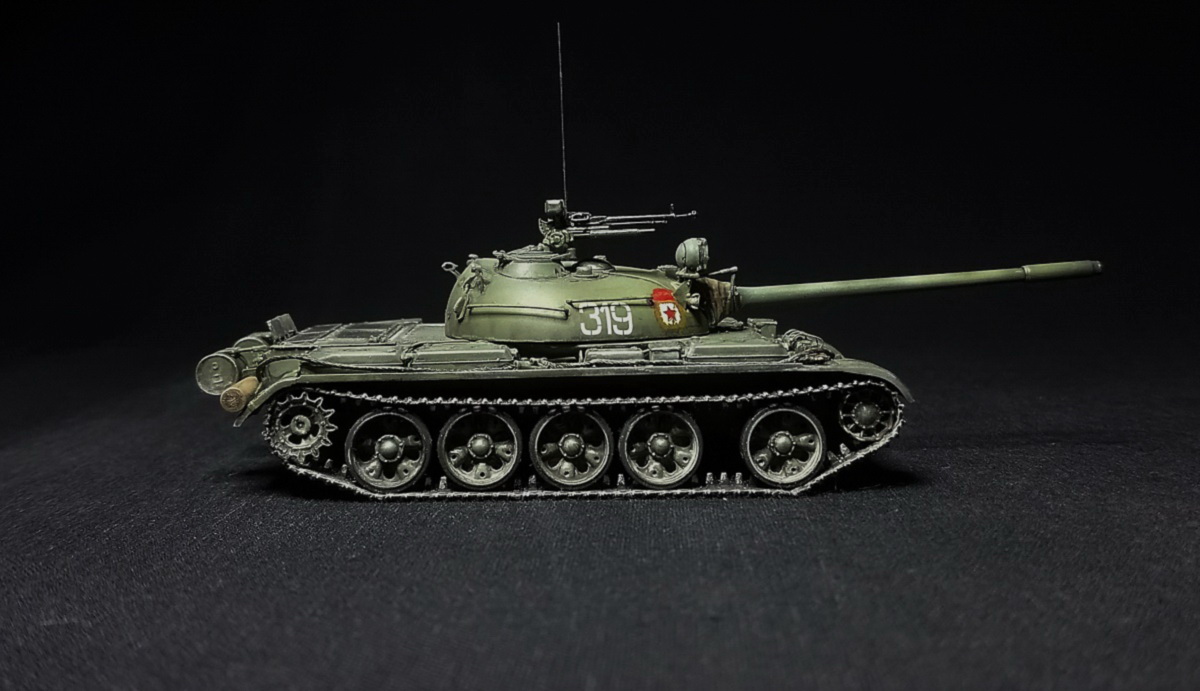 Экипаж – 4 чел. Боевая масса – 36,5 т. Броня (лоб) – 100 мм (башня) – 115-192 мм. Вооружение: помимо пушки два 7,62мм пулемета СГ-43,(350 патр.в каждом) один 12,7 мм зенитный пулемет ДШК.(200 патр). Двигатель, дизельный В-54 (520 л.с.) Скорость по шоссе 50 км/ч. Запас хода 350-400 км.