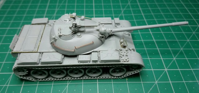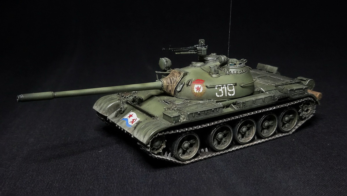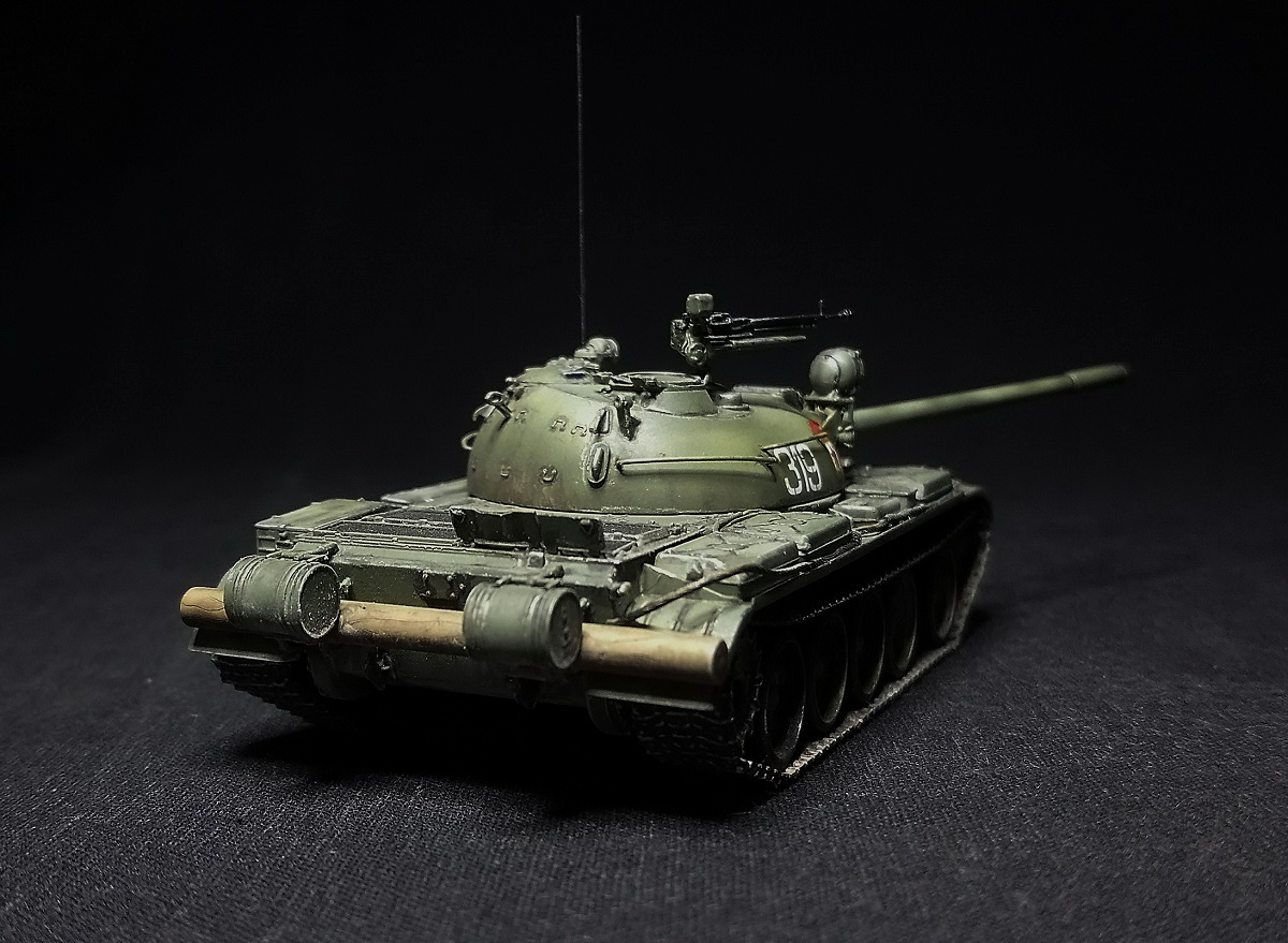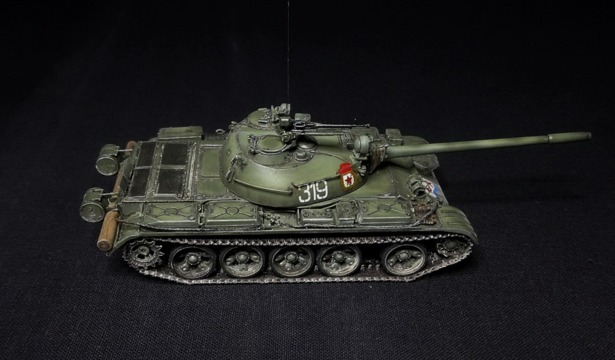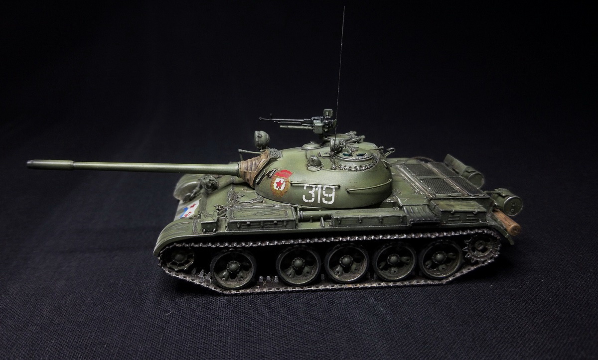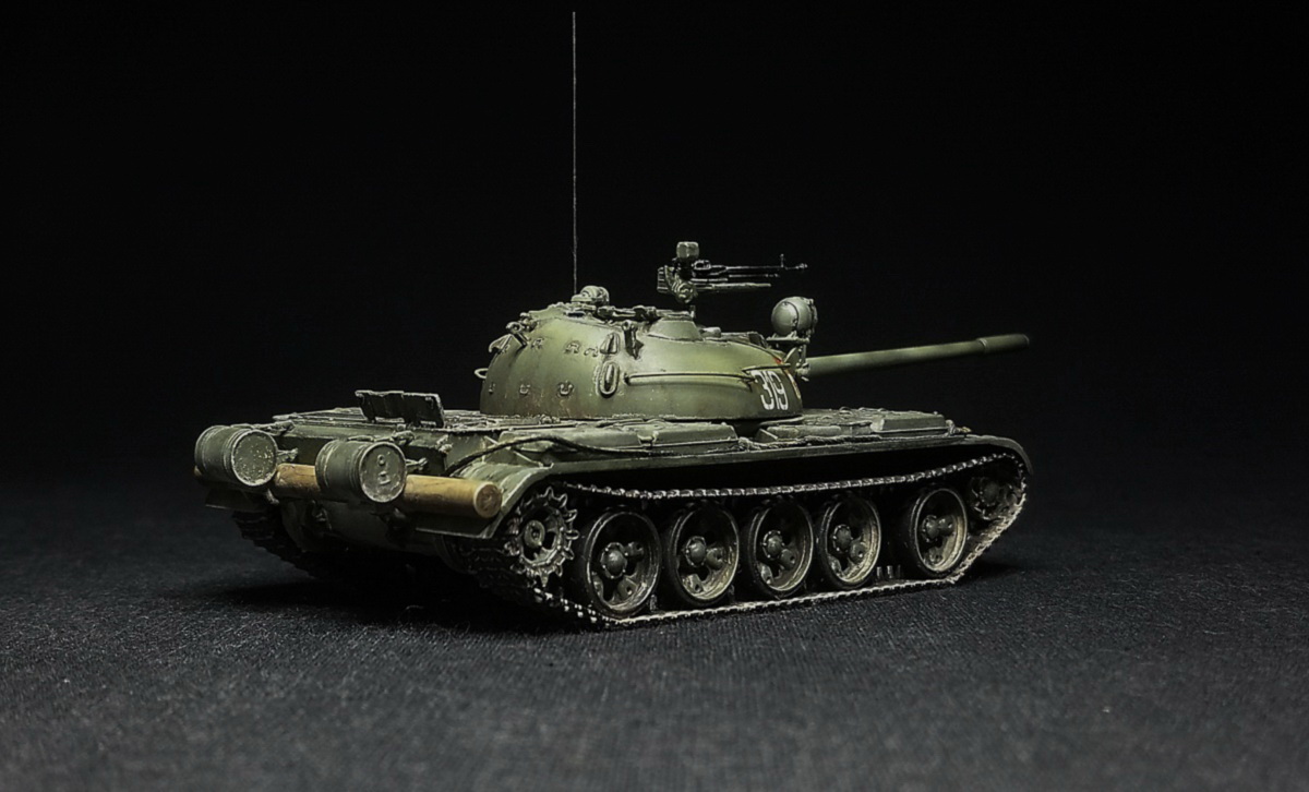 Экипаж – 4 чел. Боевая масса – 36,5 т. Броня (лоб) – 100 мм (башня) – 115-192 мм. Вооружение: помимо пушки два 7,62мм пулемета СГ-43,(350 патр.в каждом) один 12,7 мм зенитный пулемет ДШК.(200 патр). Двигатель, дизельный В-54 (520 л.с.) Скорость по шоссе 50 км/ч. Запас хода 350-400 км.