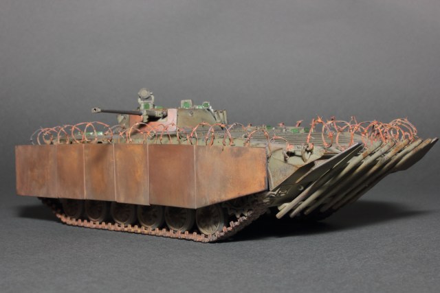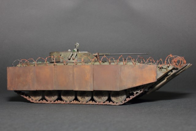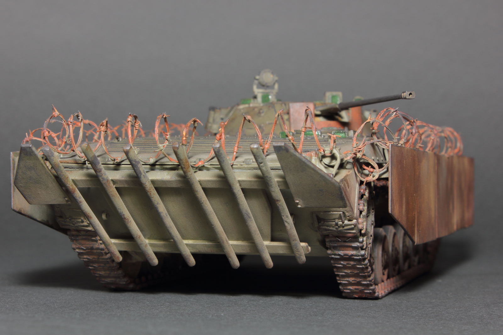 Колючку свил из медной проволоки, получилось немного грубовато и не масштабно, но мне нравится, выглядит неплохо вроде бы. Выточил уголки для экранов из всяких остатков от других наборов, сами экраны из вырезал из остатков пластиковых экранов от немецких 4-ок и штугов. Кое-где на модели заменил пластиковые петли и поручни на проволоку, закрыл надгусеничные полки пластиком снизу. Жуткий ствол заменил на металлический от "Model Gun" (впрочем, это было сделано тогда, когда цель была просто собрать БМП-2). Так как пластика для экранов не хватило на перед машины, пришлось немного импровизировать и использовать кусочки литников, в планах было навешать на них всяких цепей, но подходящих так и не нашёл.