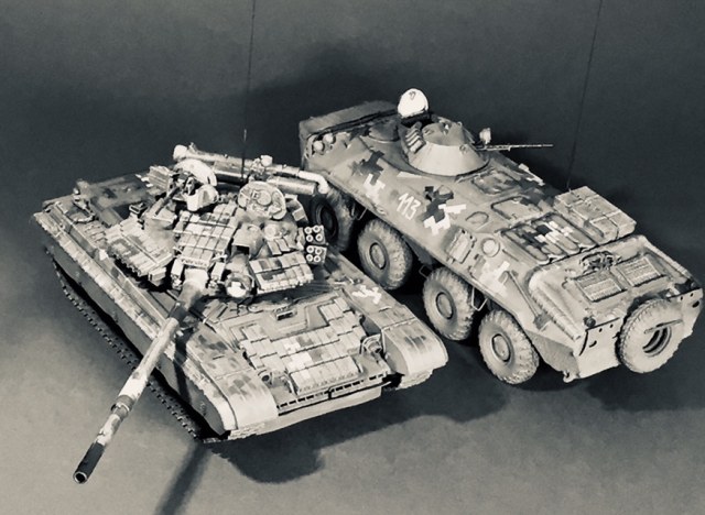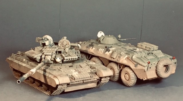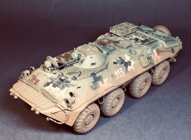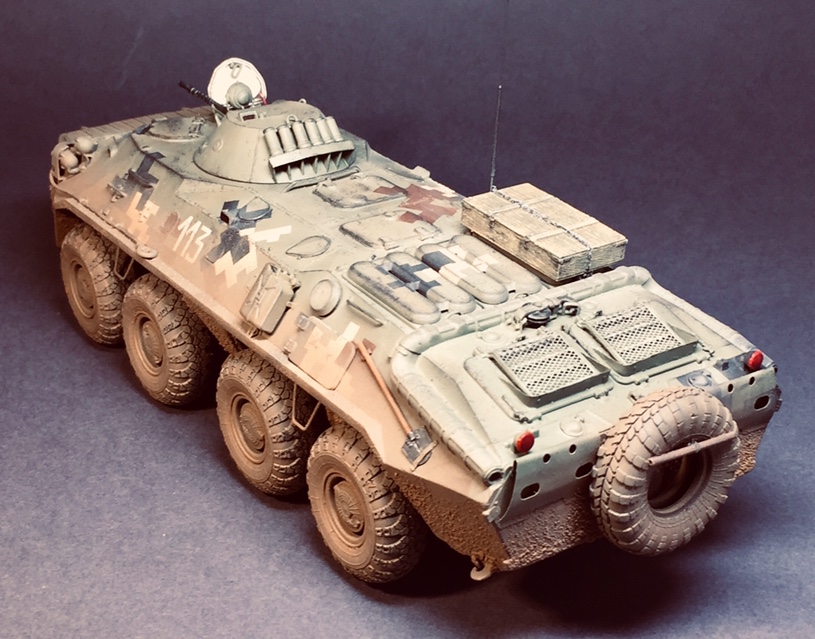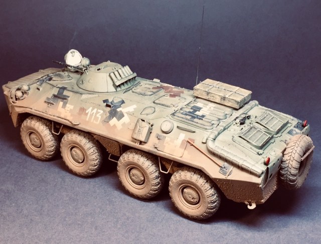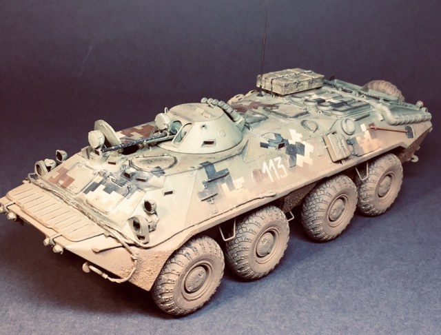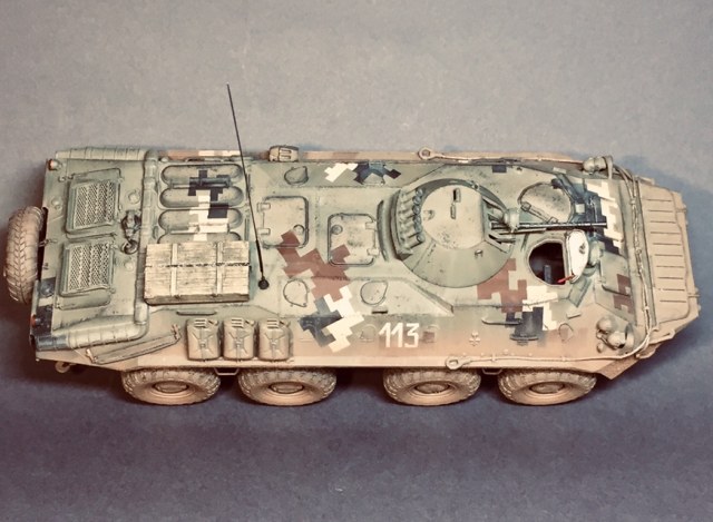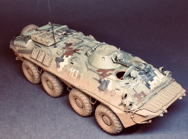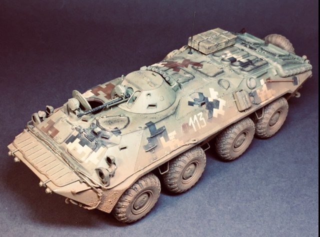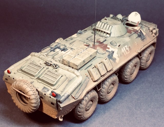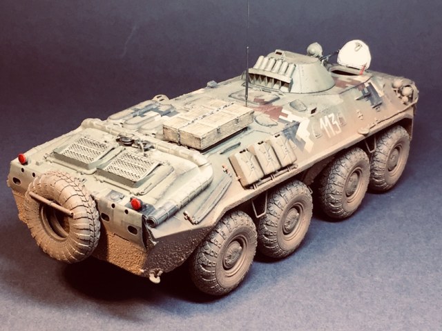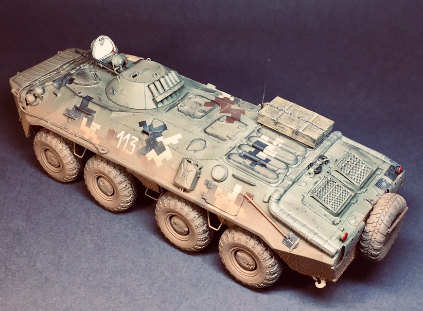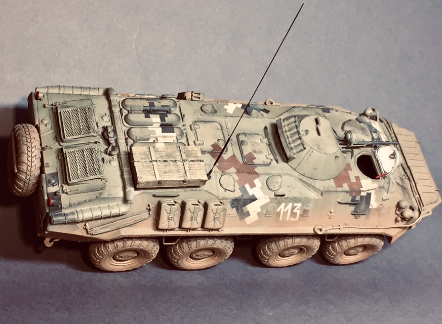 Представляю свою очередную поделку - практически «изкоробка» за исключением мелочей - проводка к фарам, поручни, антенна - это сделал сам , ящик - Миниарт, ствол КПВТ от RB , ствол ПКТ - смола, фирму не знаю. Модель в будущем пойдет на диораму, именно поэтому она именно так и загрязнена. Что по набору - в сборке проблем насколько помню не возникало, собирал его несколько лет назад но окрасил лишь сейчас. Если бы собирал сейчас то наверное многое бы делал по-другому. Что в наборе совсем не понравилось - тросы и колеса. Троссы оставил по опр.причине родные, о чём в принципе жалею - вроде мелочь а вид портит и очень. Вариант окраса - 93 омбр всу, но работа является в какой-то степени фантазией так как в 93 омбр бтр-70 отродясь не было.