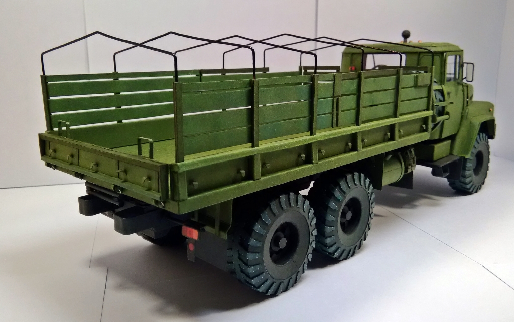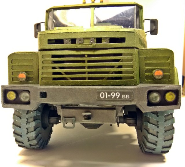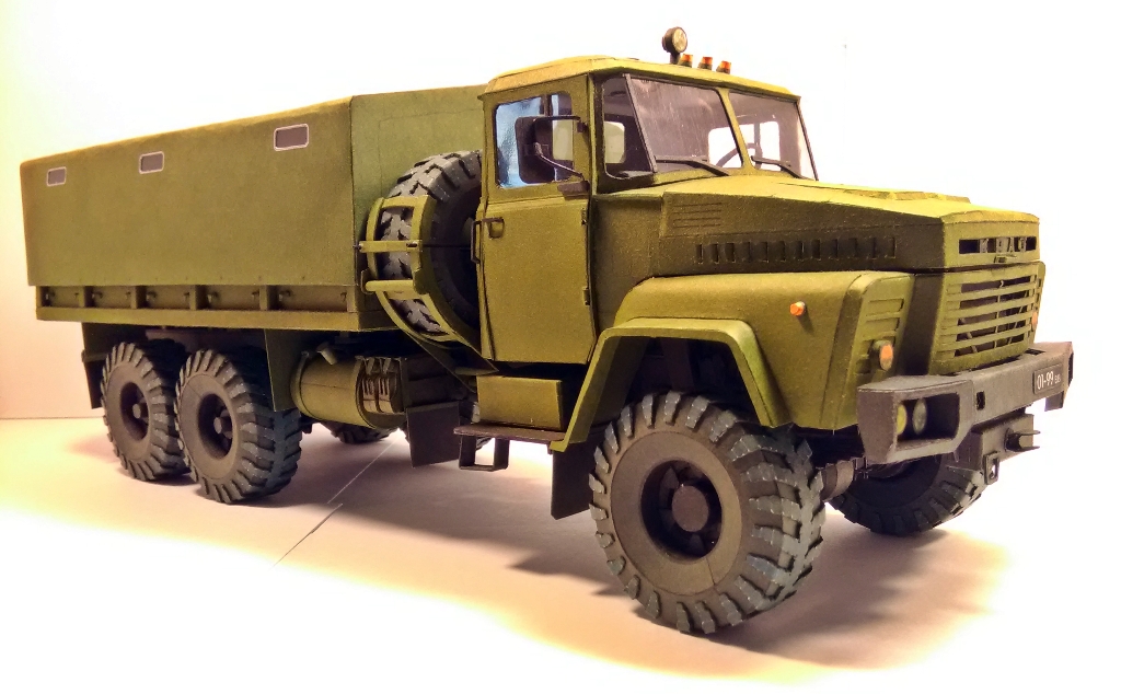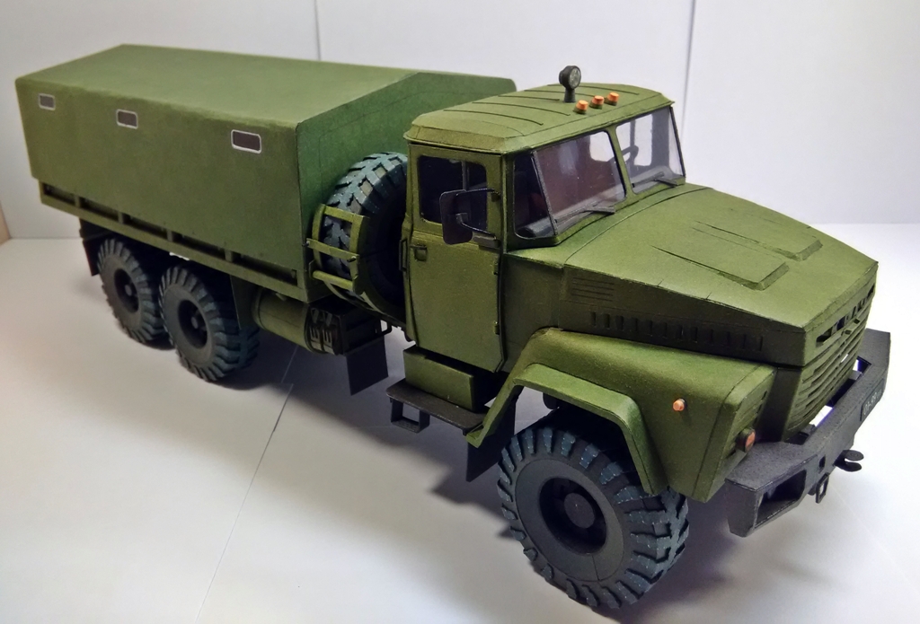Модель пере масштабирована из 1-32 в 1-25 по моей просьбе автором модели Виктором Суздалевым и выполнены доработки по кабине ,открывающиеся двери ,элементы штамповки. Собирается хорошо . Размер 35см.