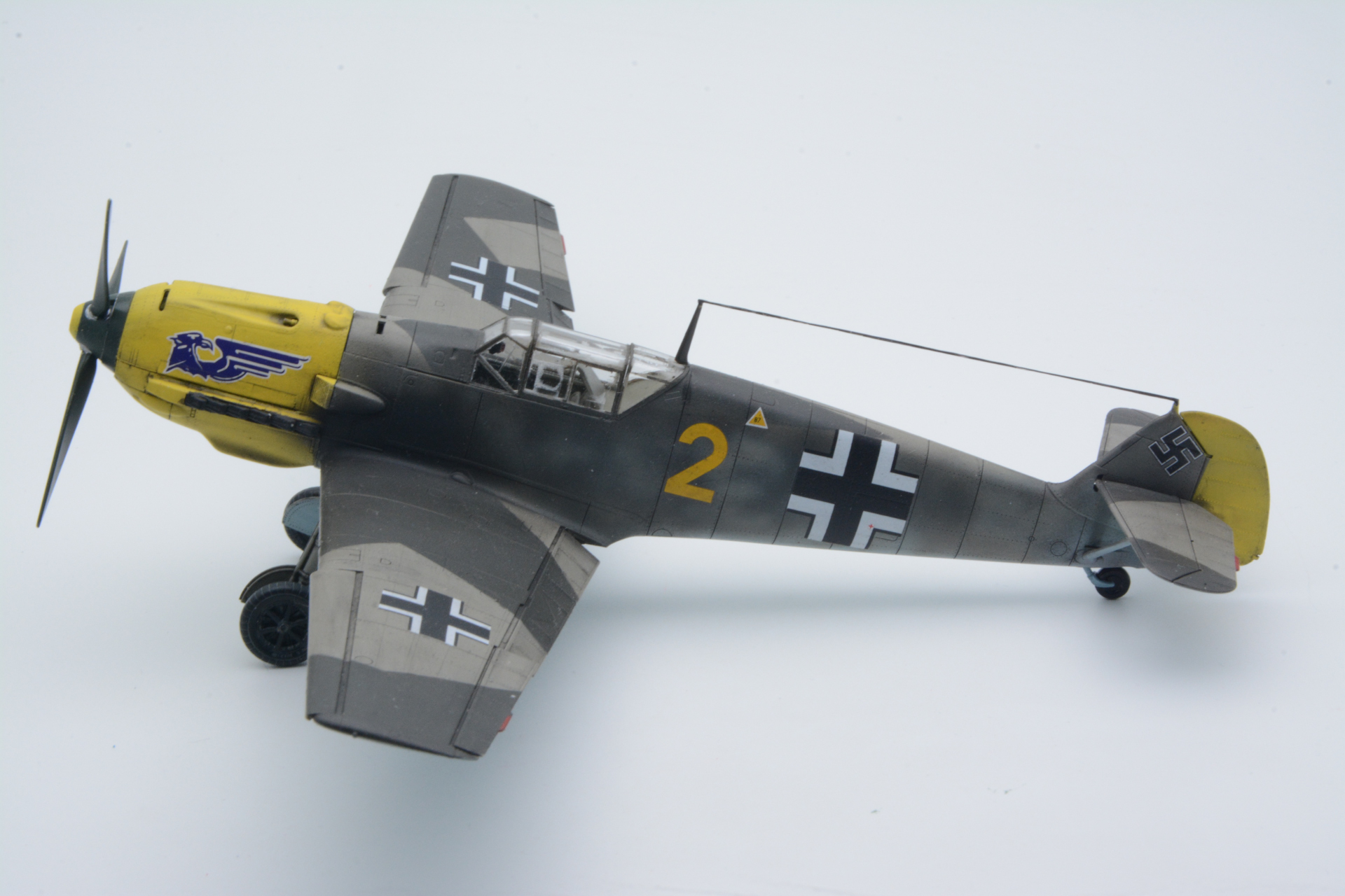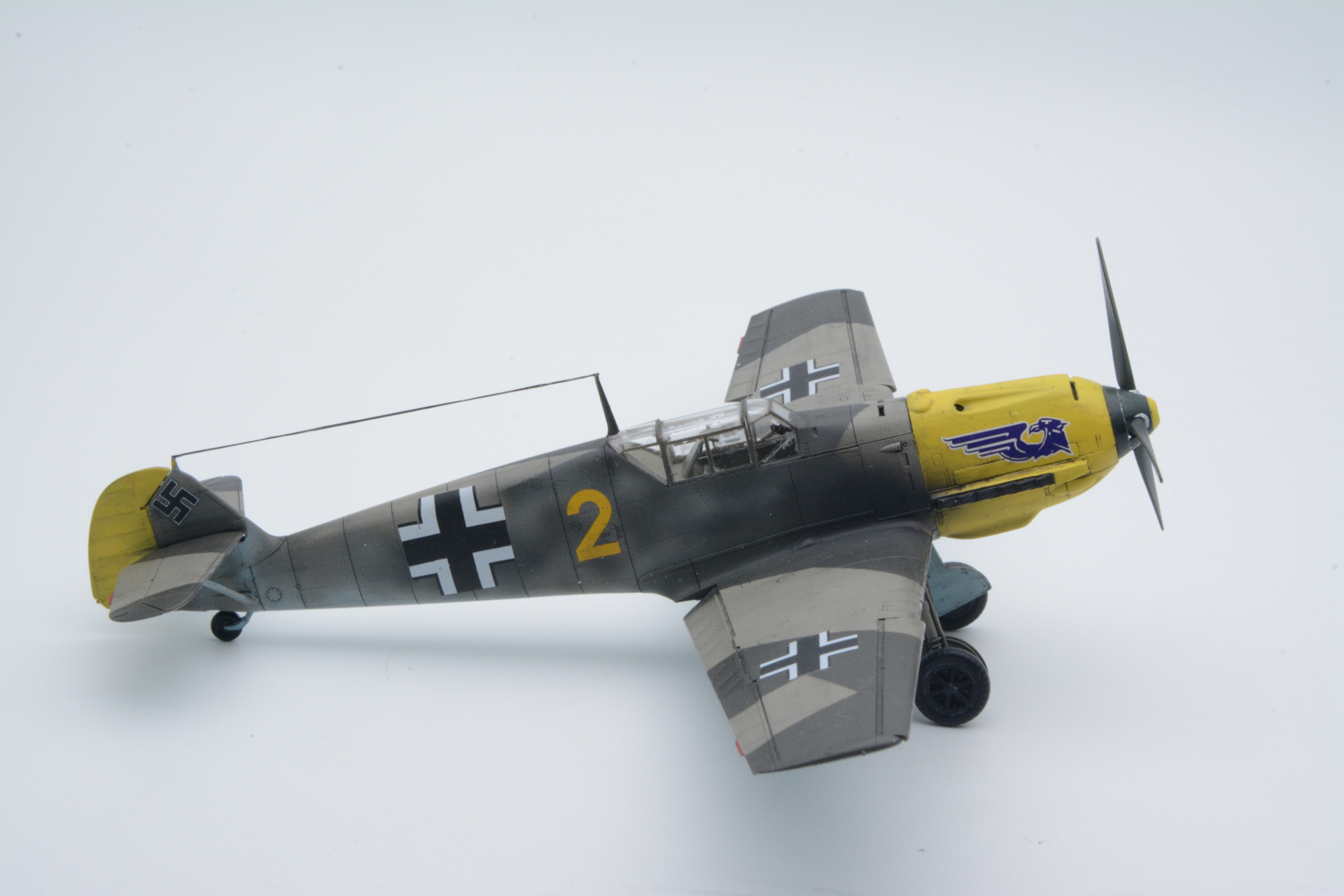 Вот и закончился долгострой длившийся аж с нового года. (ссылочка на стройку) Подарок подаренный от АДМ оказался моделью от фирмы Eduard Weekend Edition Me 109 E-1. Сборка из коробки в стиле положил в коробку клей, кусачки и надфиль, закрыл потряс и готово. Все косяки и неровности это исключительно криворукость автора. Модель была покрашена, затонирована тонировкой от тамии, добавлены фильтр и потеки грязи от АК на стойки шасси. Закончился долгострой неудачно, сняв маски с фонаря выяснилось что лак просочился под них и испортил остекление, да и к тому же отвалилась броне спинка в кабине. Но выложить все равно решил хотя бы в песок что бы почитать отзывы и может какие советы.
