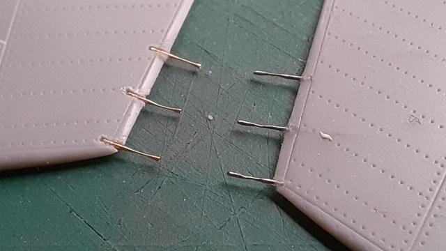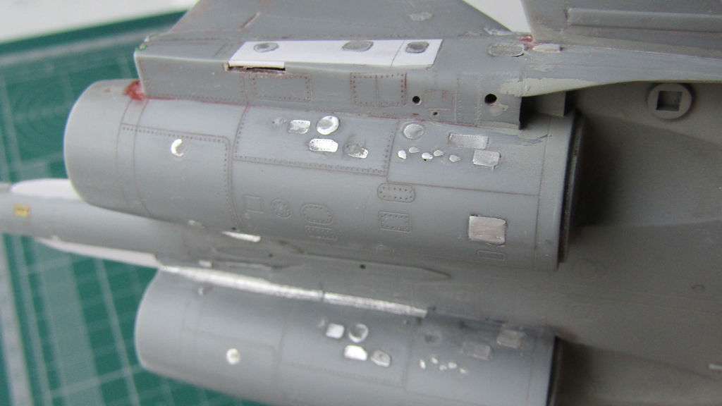 Далее. В процессе стачивания кромок на килях увлекся, в результате чего углы на законцовках скруглились. Не долго думая срезал пилотки и вырезал заново из пластиковой карты. По этой же причине заменил подбалочные гребни. Горизонтальные длинные антенны(?) под пилотками — из гитарной струны. Уже после того, как кили были приклеены, пришла в голову светлая мысль нанести на них клепку (напомню, что сначала хотел собрать просто «из коробку», без доработок, но потом что-то щелкнуло…). Если на наружных сторонах еще более-менее получалось, то на внутренних было уже не так удобно, так что не везде вышло ровно. На ПФГ заострил концы, добавил углубления — имитацию винтов, а после того, как эти грузы во второй раз случайно отломились — рассверлил и вставил штифты. Подточил антеннки на килях, а ту что над РН, наоборот, сделал побольше — для масштабности. Сверху килей семь заметных винтов трапециевидной антенны. На антенне системы РЭБ (на левом киле посередине) добавил три маленькие продольные полоски для придания более достоверной формы. Габаритный огонь выдавил из пластика. «Якорь» (антенна системы автоматической посадки) от «Микродизайна», лучи должны быть длиннее, но не придумал как исправить, оставил так. На линиях, имитирующих границы рулей направления, с правых сторон, расширил участок, где передняя кромка идет вертикально (внизу). Плюс совсем легкая имитация узлов подвески. Из жестянки вырезал направляющие обтекателя привода стабилизатора (так что ли), заново сделал воздухозаборники в основании килей. Правый меньше, на левом горизонтальная перегородка посередине. Сначала пробовал скрутить их из алюминиевого скотча и проклеить циакрином. Стенки получились масштабно тонкими, но форма не держалась — случайное касание и конструкция сразу мялась. В итоге выточил из куска литника. Окантовка из того же скотча. Также добавил маленький воздухозаборник по правому борту под консолью перед флапероном. Между килями, перед капотами двигателей, сделал маленькие обтекатели (из пластиковой карты), правый меньше. Створки турбостартеров и крышки лючков на капотах — из жестянки. По фотографиям уточнил расположение лючков на килях, сделал в нужных местах.