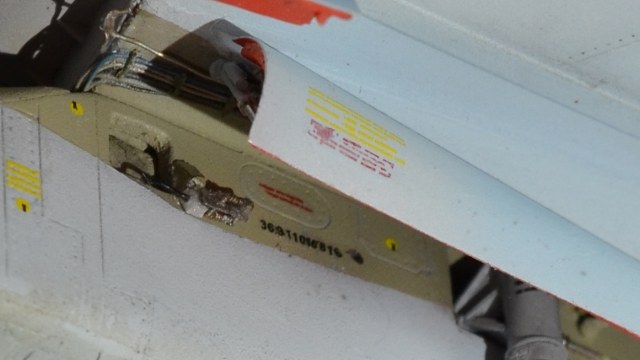 Вообще, по лючкам отдельная история. Решил сделать недостающие. В первую очередь те, что под килями — визуально они довольно-таки различимы, но на модели они вообще отсутствовали. Сначала пробовал прорезать. Результат не устроил, как-то криво все вышло. Хотел заделать, но шпаклевка не помогла — после усадки все равно остались видны старые следы, а если делать больше слой, то получалась «лепешка», которая была бы видна после покраски. В итоге вырезал весь этот фрагмент целиком и вставил новый из пластиковой карты. Теперь решил вырезать сами крышки из жестянки. Также поступил с теми лючками, что на мотогондолах, килях, хвостовой балке и за носовым обтекателем. Получилось заметно лучше, плюс можно было сделать имитацию винтов. Осталось только решить как аккуратно вырезать посадочные углубления на корпусе, т. к. просто приклеить крышки нельзя — выглядели бы, словно бронеплиты… Если с круглыми лючками особых проблем не возникло — просто сверла подходящего диаметра, то с остальными получилось так себе: работал мини-стамеской и все равно оставались зазоры, пришлось использовать шпаклевку. Потом еще слой грунтовки сверху, и многие лючки в итоге просто потерялись. Вернулся к тому же, с чего и начинал — нужно было прорезать. Не стал. Можно было бы попробовать просто нарисовать карандашом, но это еще и трафареты вырезать, и в нужное место с ними подлезть, как-то их там закрепить, грифель нужного оттенка подобрать, следить, чтобы рука не дрогнула, чтобы грязь не развести… В общем, мороки слишком много, оставил как есть. На хвостовой балке в первую очередь был заменен ласт — старый оказался недостаточно узким, плюс, если смотреть сверху, неправильной формы. Выточил из склеенной вдвое пластиковой карты. Добавил лючки, блоки постановки помех, механизм открытия/закрытия крышки контейнера тормозного парашюта; кончик крышки заменил на более острый. Вдоль балки наклеил ленты-накладки из алюминиевого скотча. Сопла использовал от «Amigo Models». Сначала попытался сам нарезать створки, но получилось совсем ни о чем. О приобретении не жалею. Красил металликами от «Pacific-88», просто синим, плюс, ради эксперимента, купил пудреницу. Жене понравилось, мне не особо — все равно как-то блекло вышло, не заиграли оттенки, как хотелось бы. Буду экспериментировать дальше. В следующий раз другие металлики попробую. Ниши шасси. У«Trumpeter’a» они очень-очень сильно упрощены. Перед тем, как склеить половинки корпуса, сделал стенки ниш основных опор. По-хорошему, нужно было еще и развернуть сами ниши на нужный угол, но тогда не обратил внимания на этот момент. Далее имитация рельефа на стенках с помощью алюминиевого скотча. Затем покрасил в светло-серый, после чего проложил некоторое подобие магистралей и проводов. Тут всё по мотивам. Сымитировать всю эту «паутину» в 72-м, думаю, нереально. Только самое основное, что хорошо заметно на фотографиях.За выемкой под колесо прорезал окошко, за окошком попытался сделать непонятный мне механизм с пружинками. Передняя ниша на модели совсем пустая и неправильной формы. Можно было поставить неиспользуемую деталь из наборов «Звезды» и обвешивать уже ее, но половинки корпуса уже были склеены, пришлось облагораживать то, что есть. Поступал по тому же принципу: изучал фото, прорабатывая то, что казалось по силам. Створки ниш пришлось делать зано