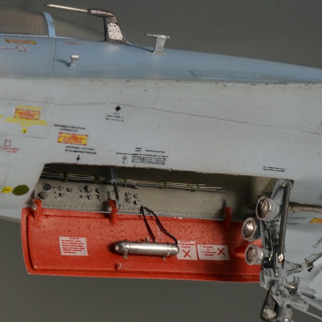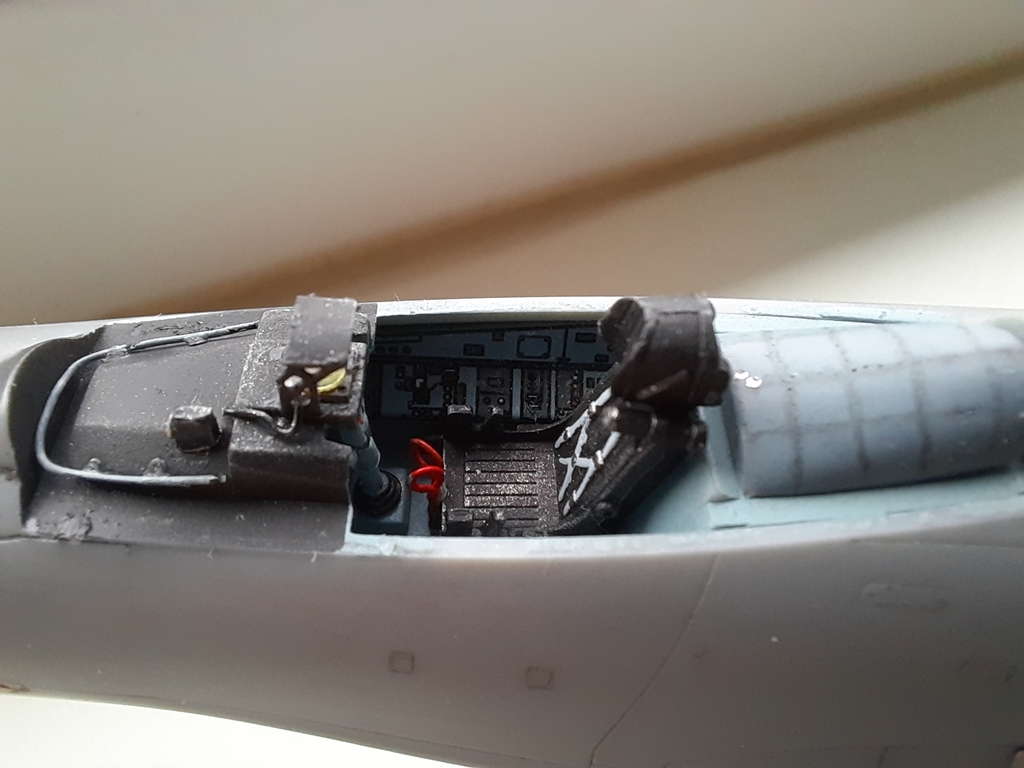 Кабину не стал прорабатывать. Изначально планировался вариант с закрытым фонарем, который к тому же оказался толстым - мало что было бы видно. Внес лишь небольшие улучшения: катапультные ручки (из проволоки), рама ИЛС («Микродизайн»); для проекционного устройства выбил кружок из прозрачного пластика и окунул в подкрашенную желтым «Футуру». Фотоконтрольный прибор вышел короче, чем надо — ориентировался сначала на одно фото, а там, как оказалось, не было задней части — заметил уже позже на других снимках. Не нашел качественных фото кабины под передней частью фонаря, где защитный чехол бежевого цвета. А на фото прототипа там вообще темный участок. Решил, что накидка отсутствует и приклеил стекло. Но потом пригляделся и понял, что чехол на месте, просто он черного цвета. Переделывать было уже поздно. Доработал кожух, под которым находится механизм подъема фонаря: наростил заднюю часть, нарисовал «сетку», добавил трубку-скобку, что сразу за подголовником.