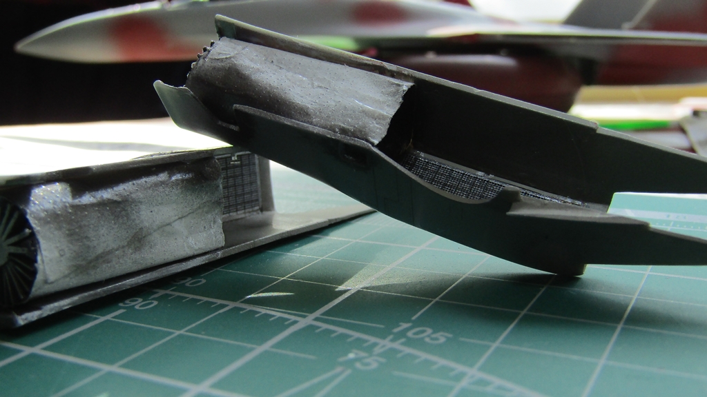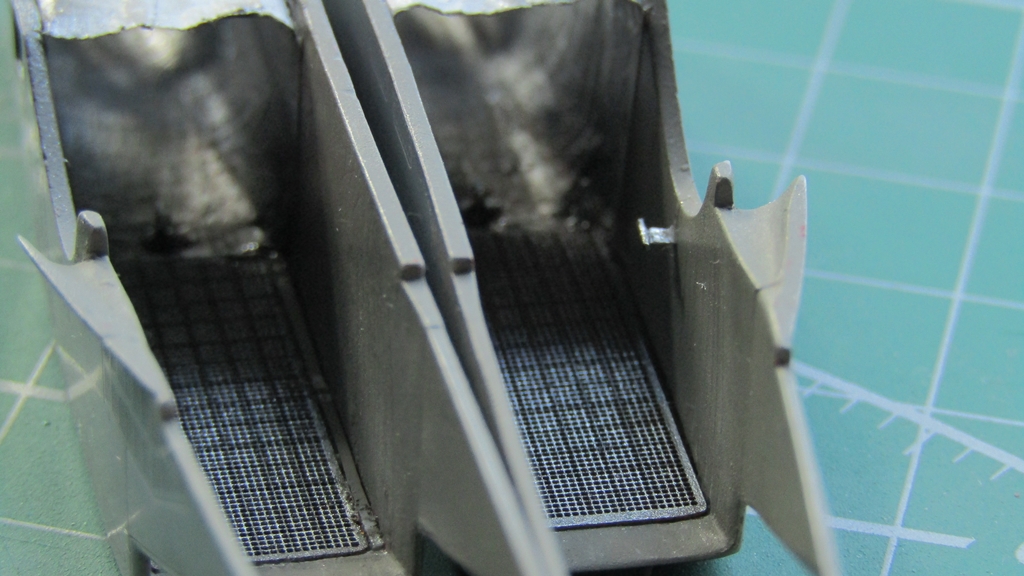 Следующей задачей поставил проработать каналы воздухозаборников. Подъемная решетка — травление от «Микродизайн». Правда, использовал только одну половинку, ту, что в мелкую сеточку. Вторая часть послужила в качестве трафарета — задул двумя оттенками металликов, чтобы получился эффект решетки поверх сеточки. Добавил самодельных датчиков, плюс по бокам следы от подъема/опускания этого механизма. Створки подпитки тоже от «Микродизайн». В стояночном положении закрыты, равно как и защитная сетка опущена без давления в гидросистеме. Перфорацию накалывал тонкой иголкой. На ранних сериях «узор» крупнее: 8 групп по 3,4 или 5 рядов, по 11 или 12 отверстий в каждом. Сымитировал, как смог))