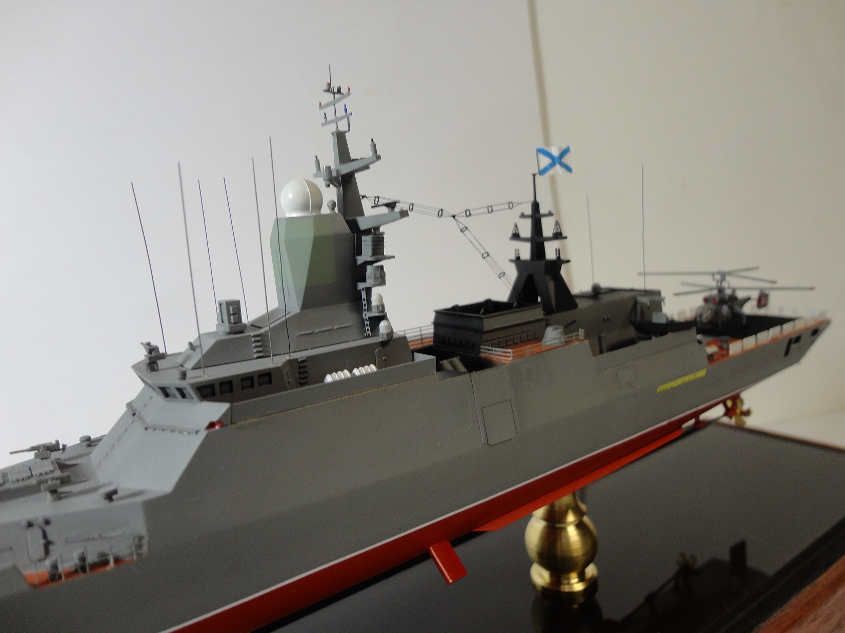 Хорошая и аккуратная работа!!! Мои поздравления!!!)) А я считаю, что как раз таки к подарку и особенно людям в теме нужно отнестись более критически. Никогда отражатели бортовых огней не красятся в цвета огней а только в чёрный и многие допускают такие ошибки. Антенна Фрегата тоже шаровая. На флоте не видел мандаринового цвета палуб (или что-то подобное) а вместе с тем и такого же цвета люков и киповых планок. Очень бросается в глаза.......
