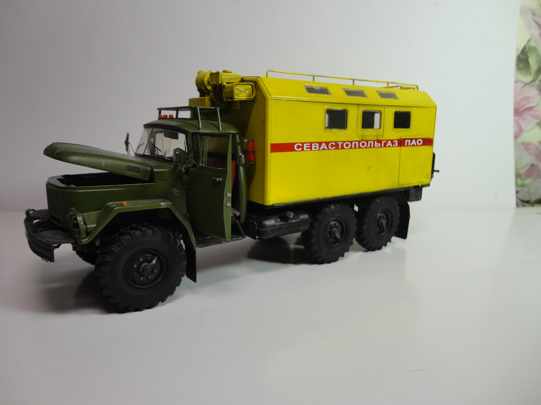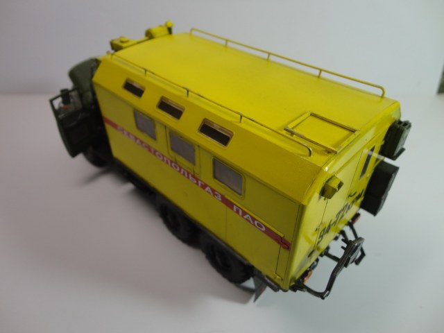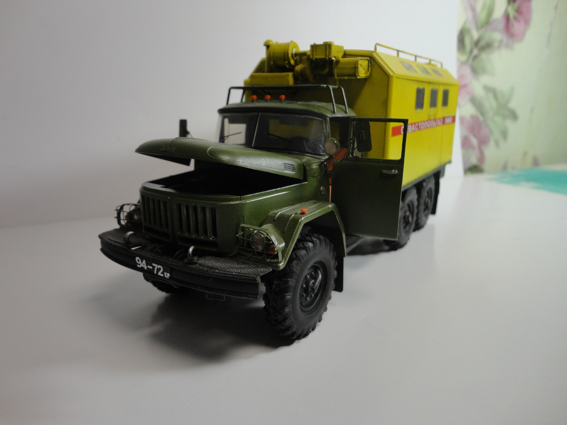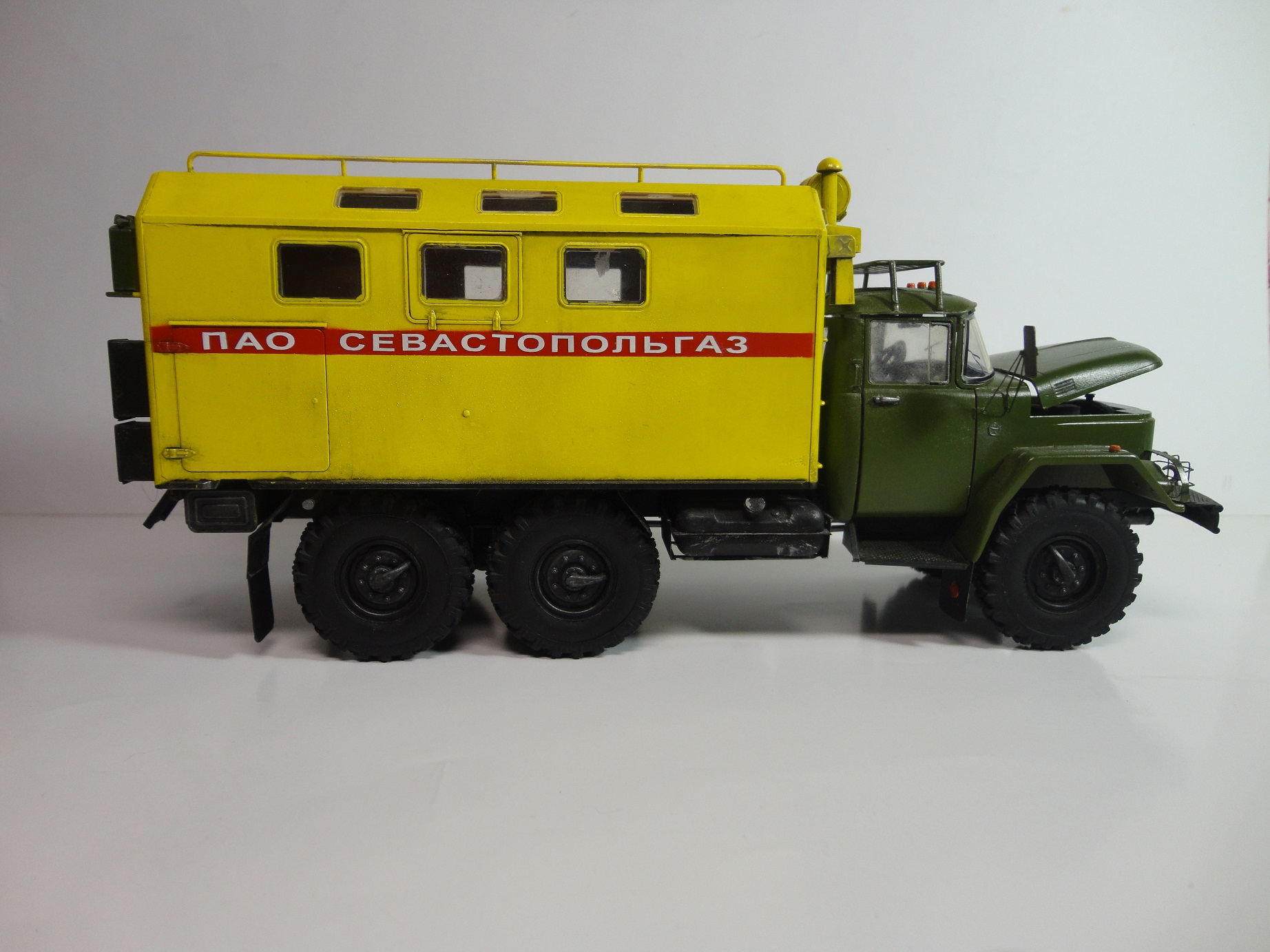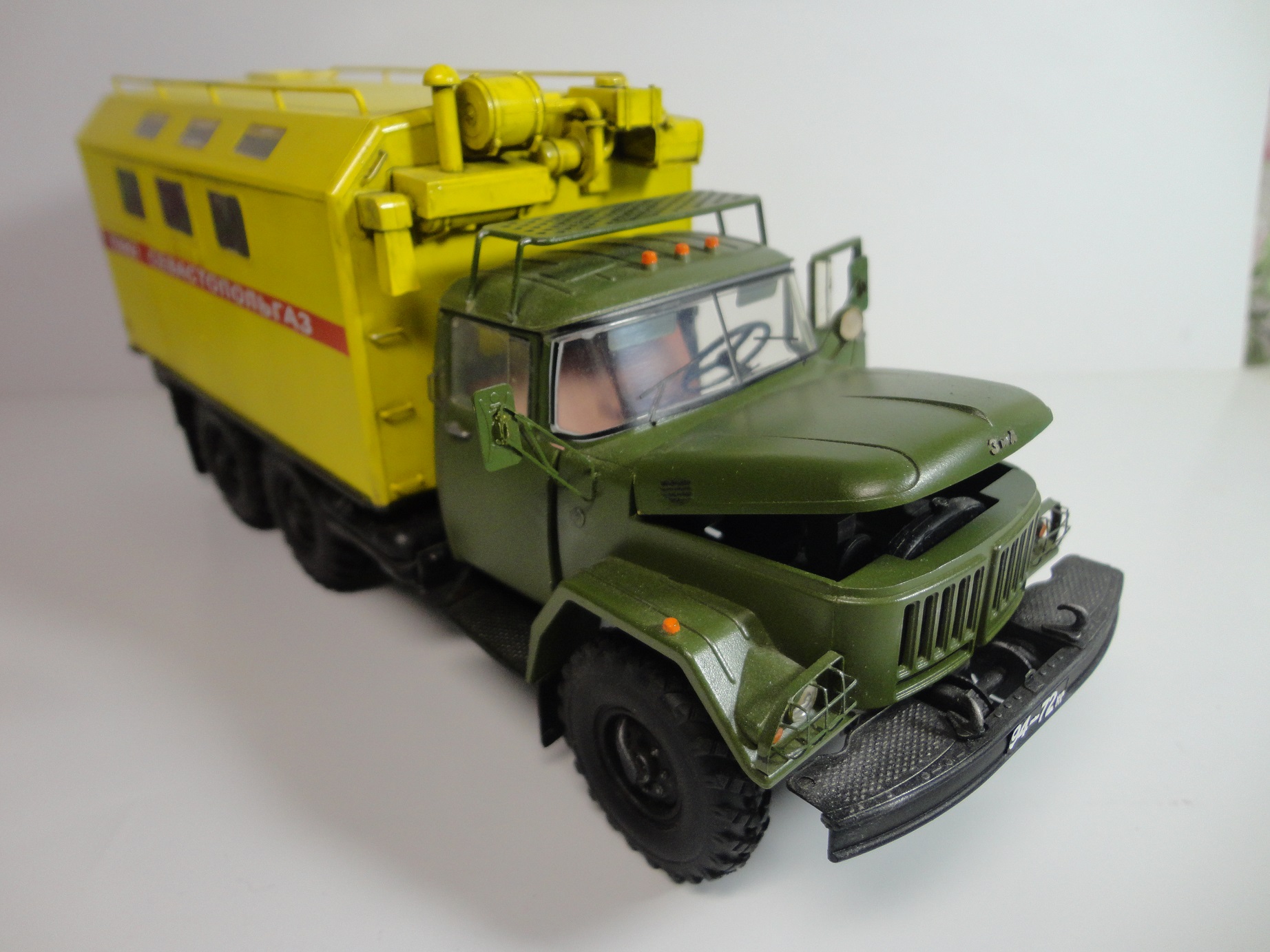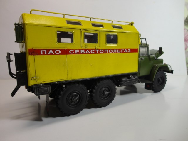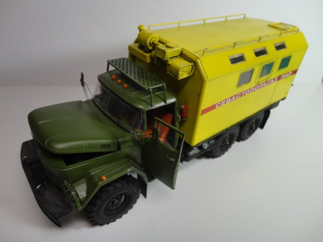 Всем доброго времени суток! Уважаемые коллеги, позвольте представить вам модель легенды советского автопрома, грузовика ЗиЛ-131 КШМ или КУНГ. (Кузов Универсальный Нормальных Габаритов).Рассказывать историю этой "легенды", думаю смысла нет... Все и так всё знают. (Кто не знает посмотрите в Ю-тюбе цикл док.фильмов "Автомобили в погонах", там всё есть...) Итак немного о себе и о самой модели.. Это моя "проба пера" в "автопроме", сам я всю жизнь занимался исключительно корабельной темой! И как то "соскакивать" с неё не хотел, но интерес к автомобилям взял верх. (Сам в прошлом дальнобойщик)... Сама модель попала ко мне уже собранной, и с элементами фототравления. но не окрашенной!! Причем собрана она была на Суперклее!!! Добротно!! Пришлось отправить её в "плавание" в уайтспирите для смывок...И мнут через 10-15 она вся развалилась! Затем промыл ее в спирте, и как говорится "Погнали наши городских"...Новая сборка и окраска красками "Ганзе" Смывка-масло, немного "сухой" кисти..ну как бы всё! Смотрите,швыряйте "табуретки", критикуйте! P.S. В галерею не прошусь, пусть в "прихожей" поживёт! И ещё один маленький секретик.. На самом деле модель делала одна моя очаровательная знакомая, а я как мог помогал, так что труд совместный! С уважением, Андрей.