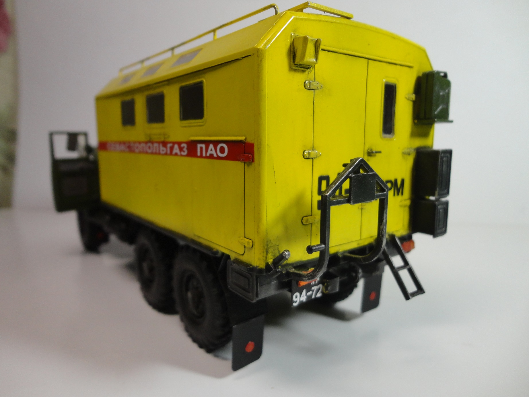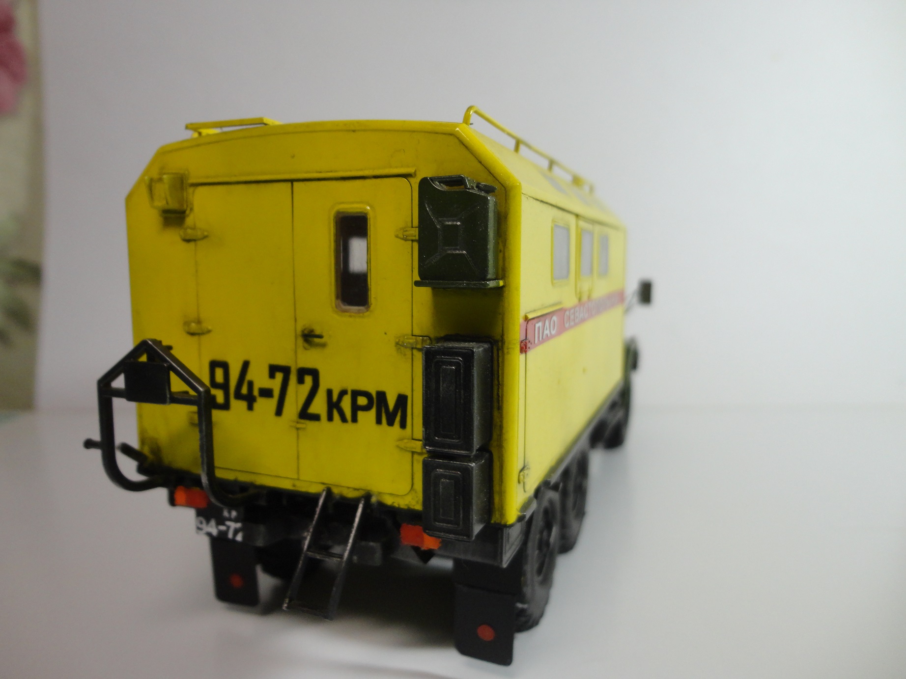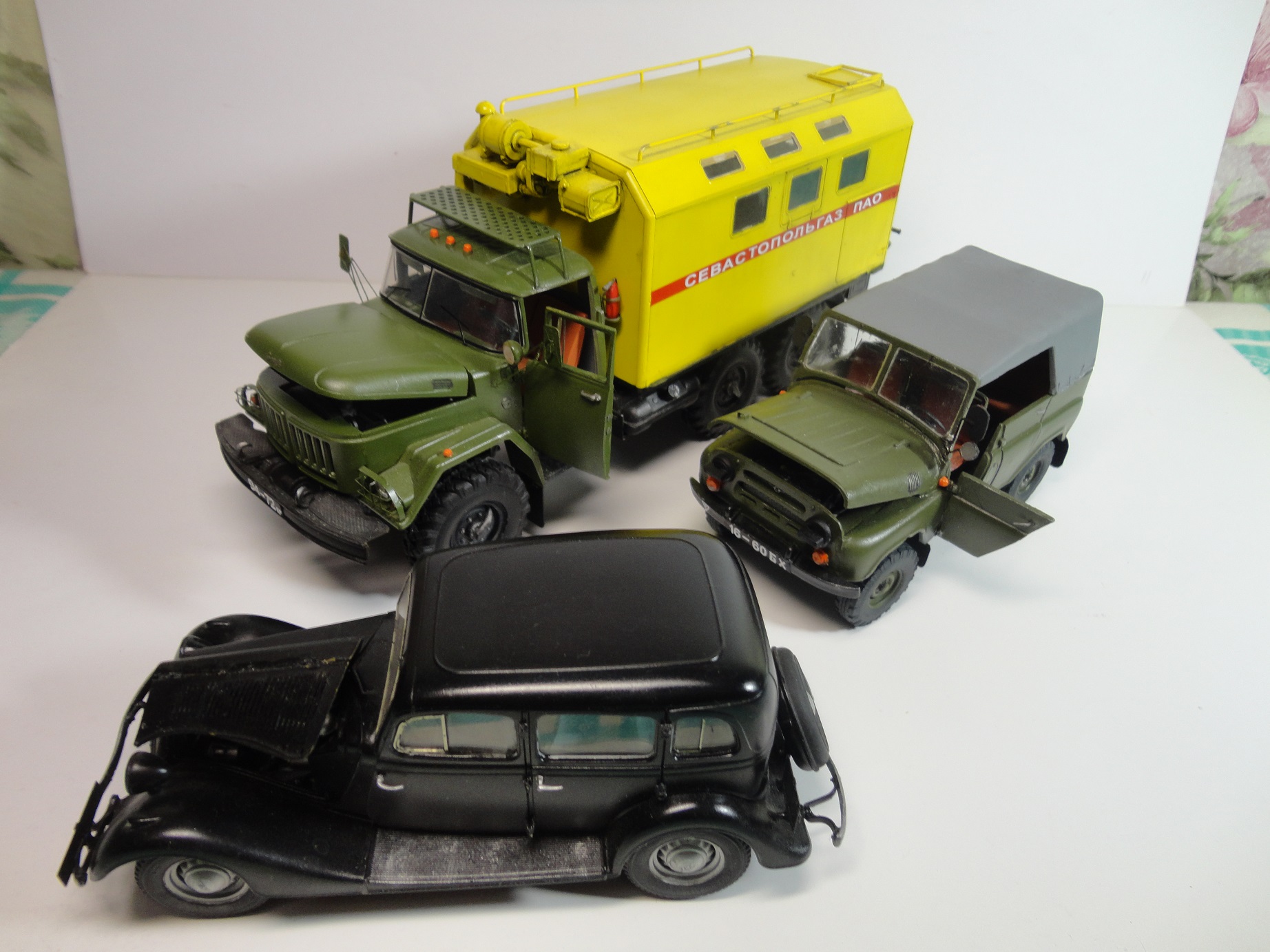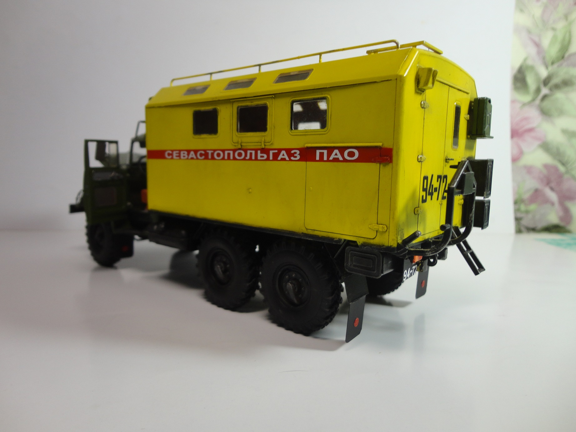 Всем доброго времени суток! Уважаемые коллеги, позвольте представить вам модель легенды советского автопрома, грузовика ЗиЛ-131 КШМ или КУНГ. (Кузов Универсальный Нормальных Габаритов).Рассказывать историю этой "легенды", думаю смысла нет... Все и так всё знают. (Кто не знает посмотрите в Ю-тюбе цикл док.фильмов "Автомобили в погонах", там всё есть...) Итак немного о себе и о самой модели.. Это моя "проба пера" в "автопроме", сам я всю жизнь занимался исключительно корабельной темой! И как то "соскакивать" с неё не хотел, но интерес к автомобилям взял верх. (Сам в прошлом дальнобойщик)... Сама модель попала ко мне уже собранной, и с элементами фототравления. но не окрашенной!! Причем собрана она была на Суперклее!!! Добротно!! Пришлось отправить её в "плавание" в уайтспирите для смывок...И мнут через 10-15 она вся развалилась! Затем промыл ее в спирте, и как говорится "Погнали наши городских"...Новая сборка и окраска красками "Ганзе" Смывка-масло, немного "сухой" кисти..ну как бы всё! Смотрите,швыряйте "табуретки", критикуйте! P.S. В галерею не прошусь, пусть в "прихожей" поживёт! И ещё один маленький секретик.. На самом деле модель делала одна моя очаровательная знакомая, а я как мог помогал, так что труд совместный! С уважением, Андрей.