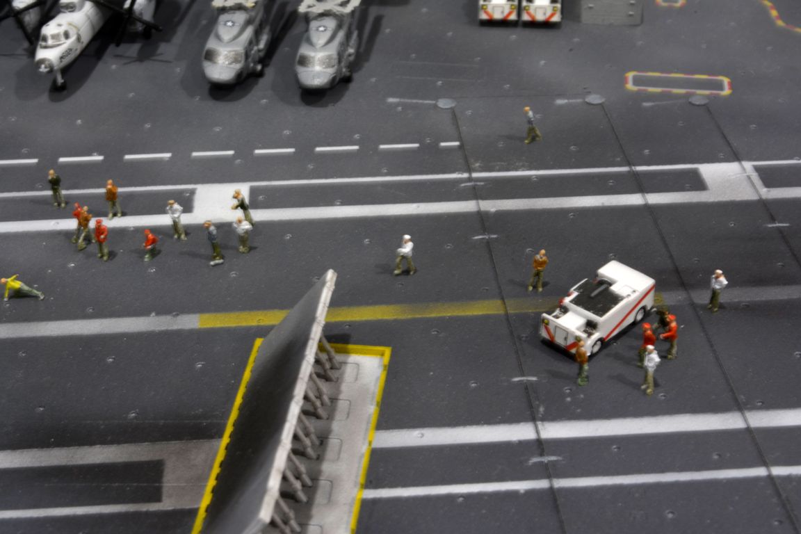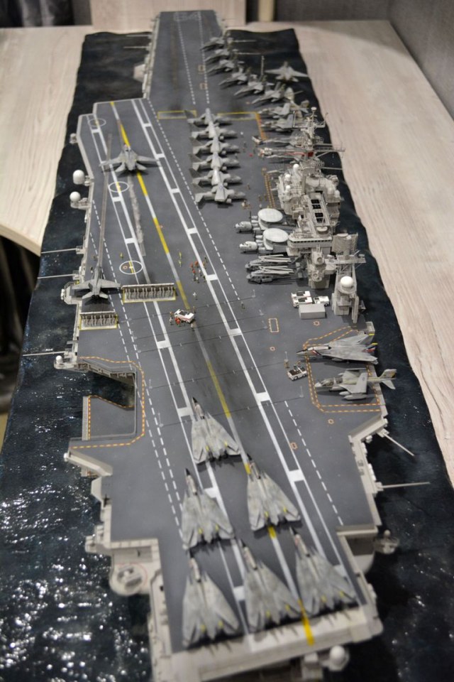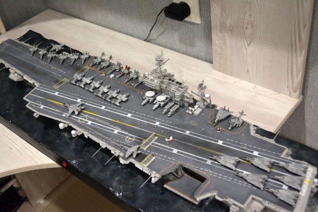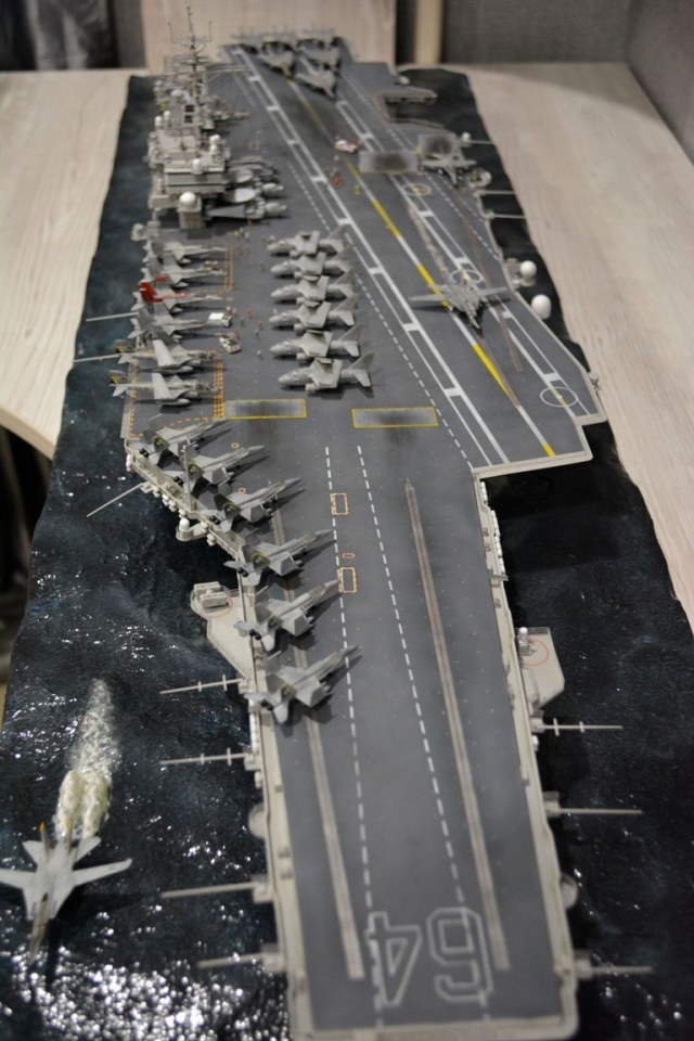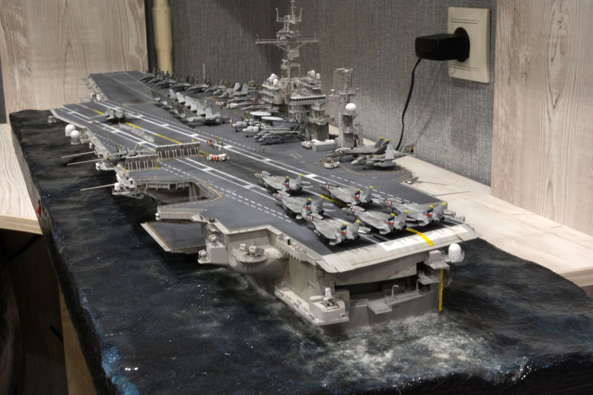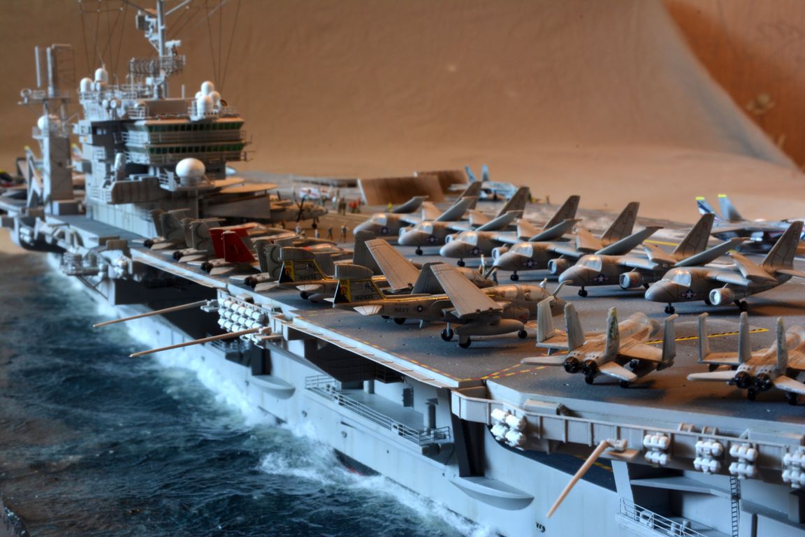 От себя полностью сделал внутренний ангар, делал по фотографиям, 3д рендерам (крайне не точные) и просто по наитию, так что в этом плане на копийность не претендую. К моделе был докуплен большой набор травления от эдуарда - он очень оживил корабль. Кроме того были дополнительно докуплены хренова туча наборов авиации, тех что были в наборе хватило только на ангар. Самое интересно их практически и не видно - но мы то знаем что они там есть :) Ну а все остальные разместились на верхней палубе. Насчет экипажа, это дешевая копия из смолы от наших китайских собратьев :) Но если особо не всматриваться (лиц вы там не увидите), то со своей задачей они справились и придали палубе немного жизни.