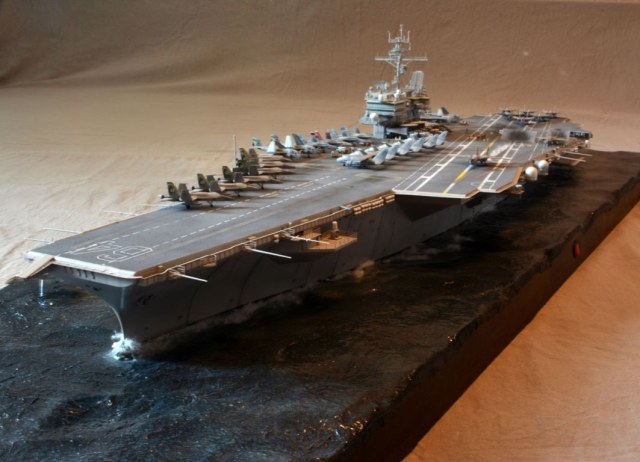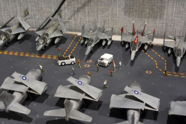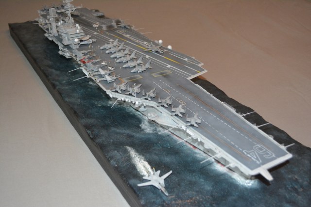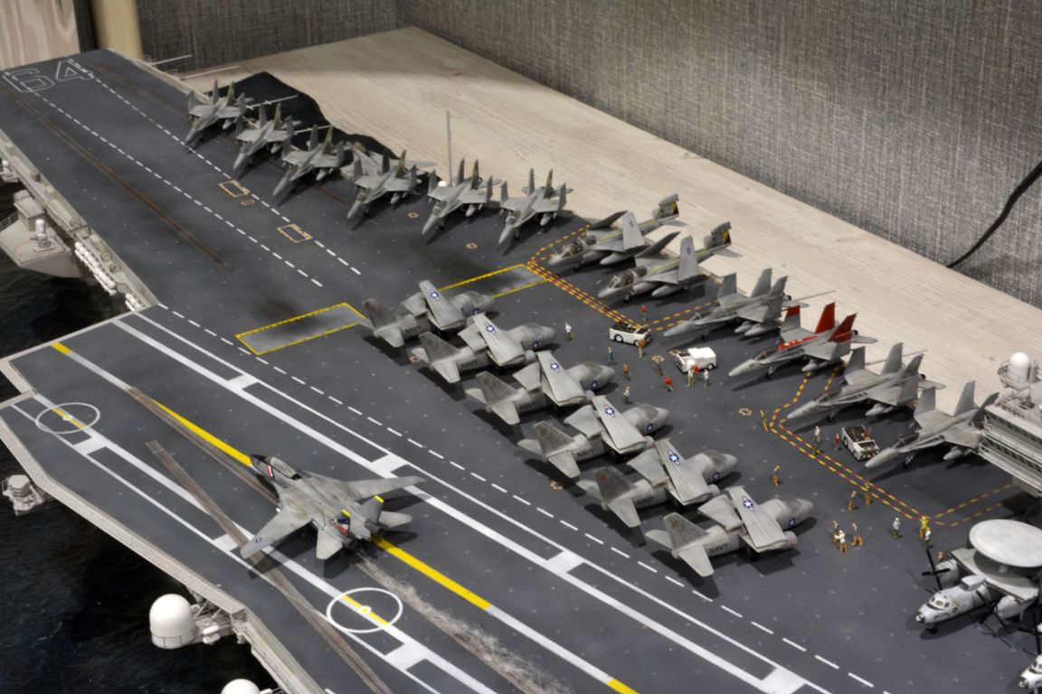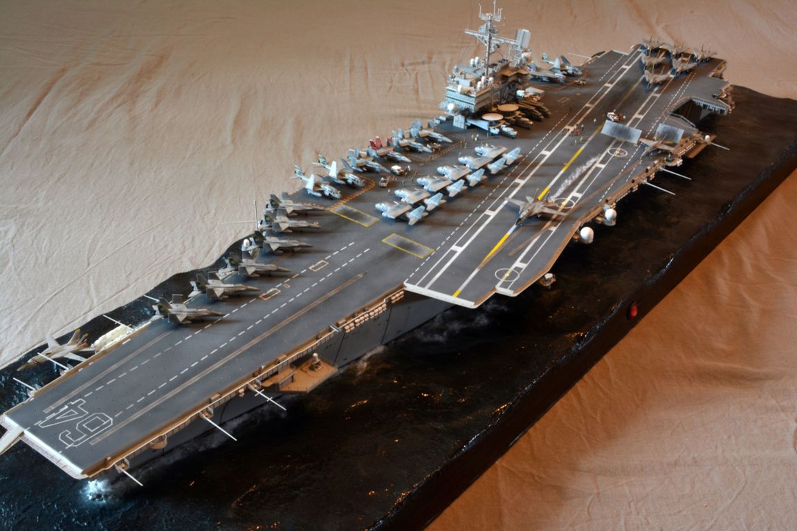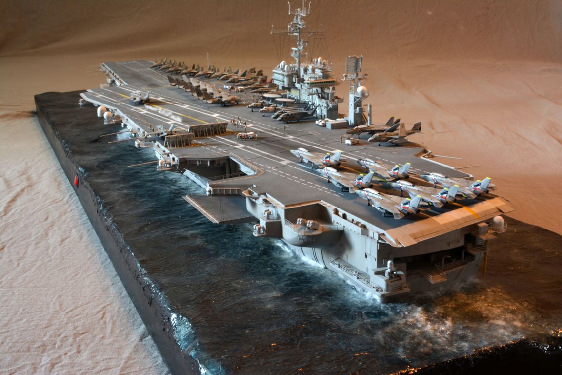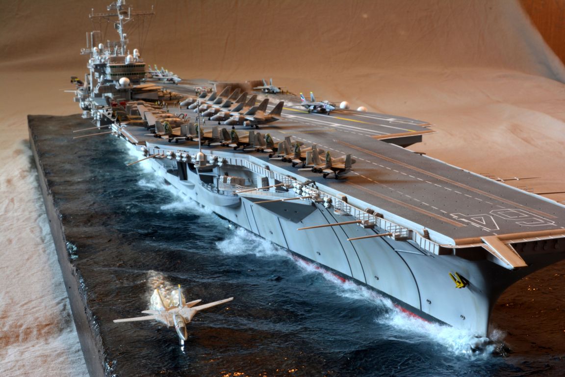 От себя полностью сделал внутренний ангар, делал по фотографиям, 3д рендерам (крайне не точные) и просто по наитию, так что в этом плане на копийность не претендую. К моделе был докуплен большой набор травления от эдуарда - он очень оживил корабль. Кроме того были дополнительно докуплены хренова туча наборов авиации, тех что были в наборе хватило только на ангар. Самое интересно их практически и не видно - но мы то знаем что они там есть :) Ну а все остальные разместились на верхней палубе. Насчет экипажа, это дешевая копия из смолы от наших китайских собратьев :) Но если особо не всматриваться (лиц вы там не увидите), то со своей задачей они справились и придали палубе немного жизни.