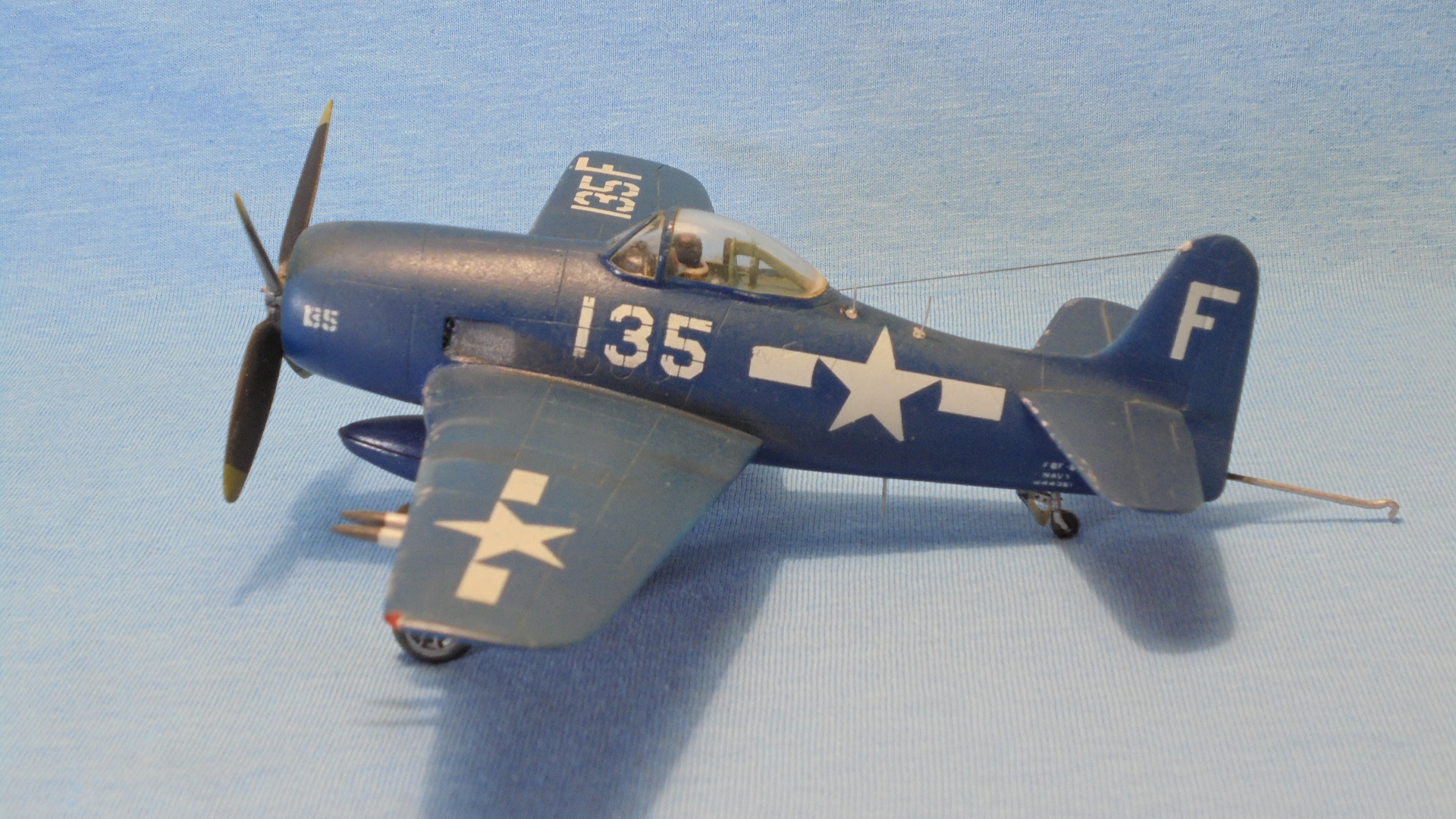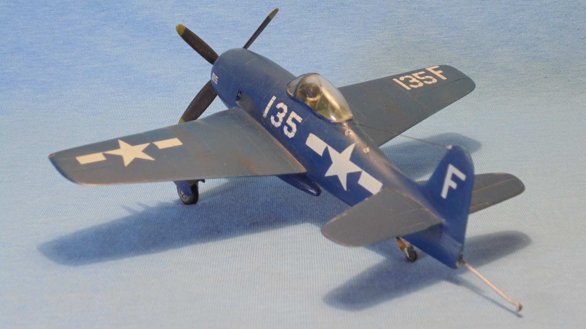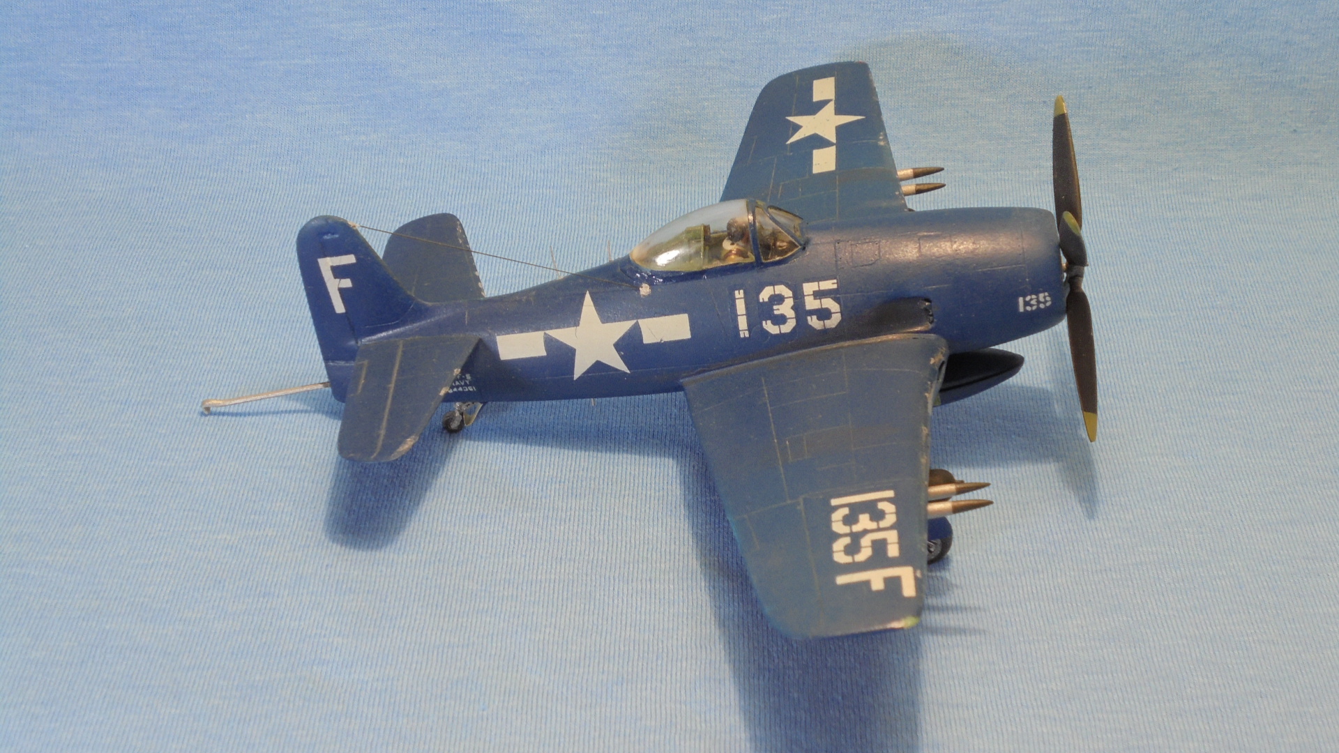 Добрый вечер. Американский палубный истребитель периода Второй мировой войны. Создан в 1943—1944 годах фирмой Grumman по заказу ВМС США на лёгкий палубный истребитель для действия на малых и средних высотах, предназначенный для замены устаревавшего истребителя F6F.Модель собирал в начале 2000 уже не помню чей фирмы и инструкции не сохранилось . По сборке была нарезана расшивка по схеме из журнала "КР" сделаны АНО,выхлопные патрубки из мед иглы. Красил нитро красками.Декали толи родные или нет сказать не могу.В модель уже за столько лет в елась пыль отмыл как смог. Приятного просмотра.