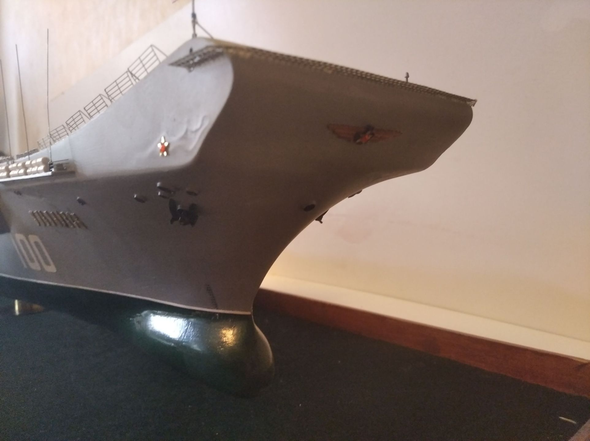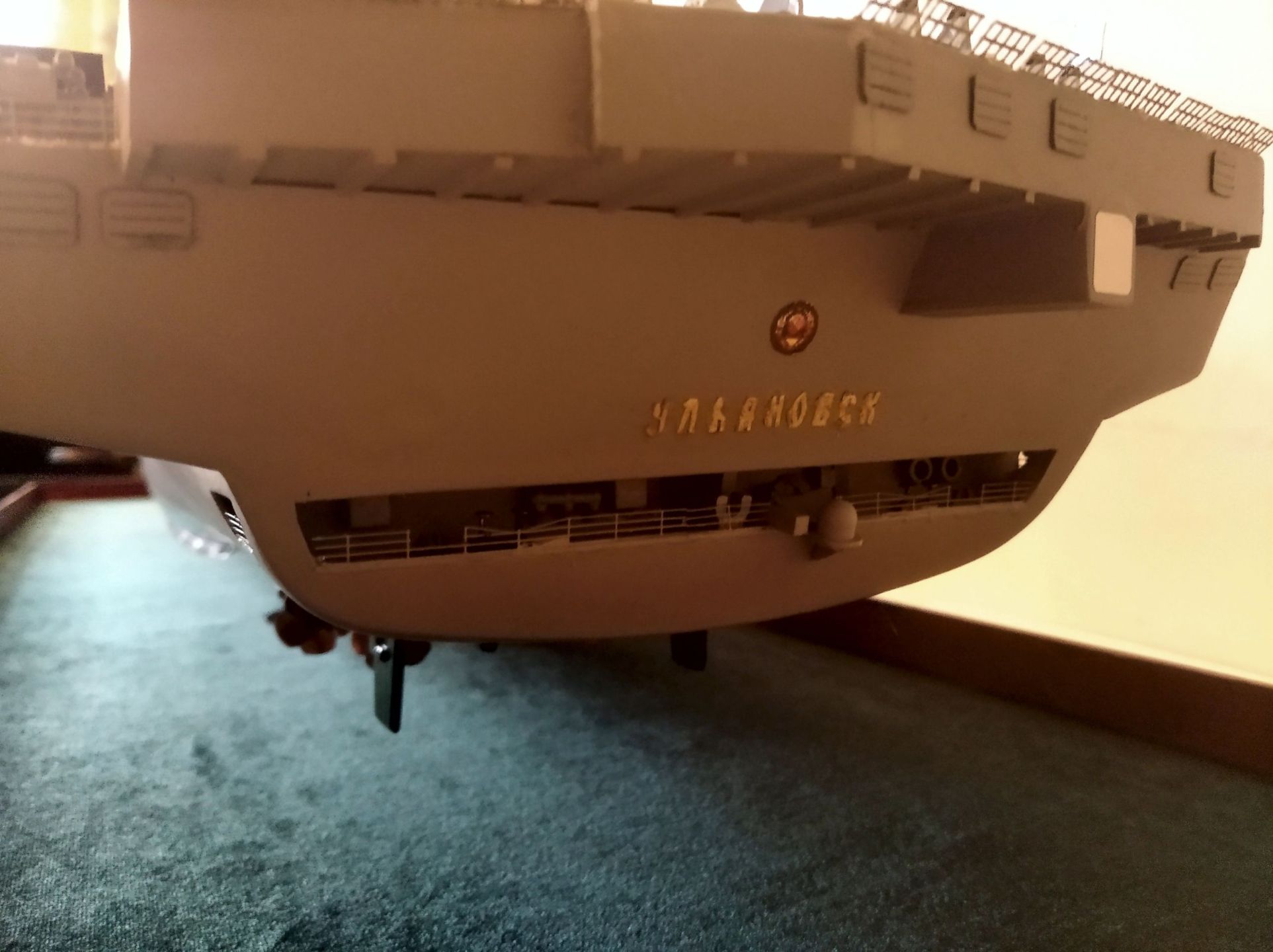 Очень сложно оценить модель недостроенного и не существующего корабля! Кстати надстройка даже не была изготовлена и даже чертежей конструкции я не видел ( как и верхнего носового блока). Спонсоны так же не были установлены. К началу утилизации были сформированны 19 зональных блоков. Об оборудованн на открытых частях, как и о вооружении, говорить не приходится. Но СМЕЛО!