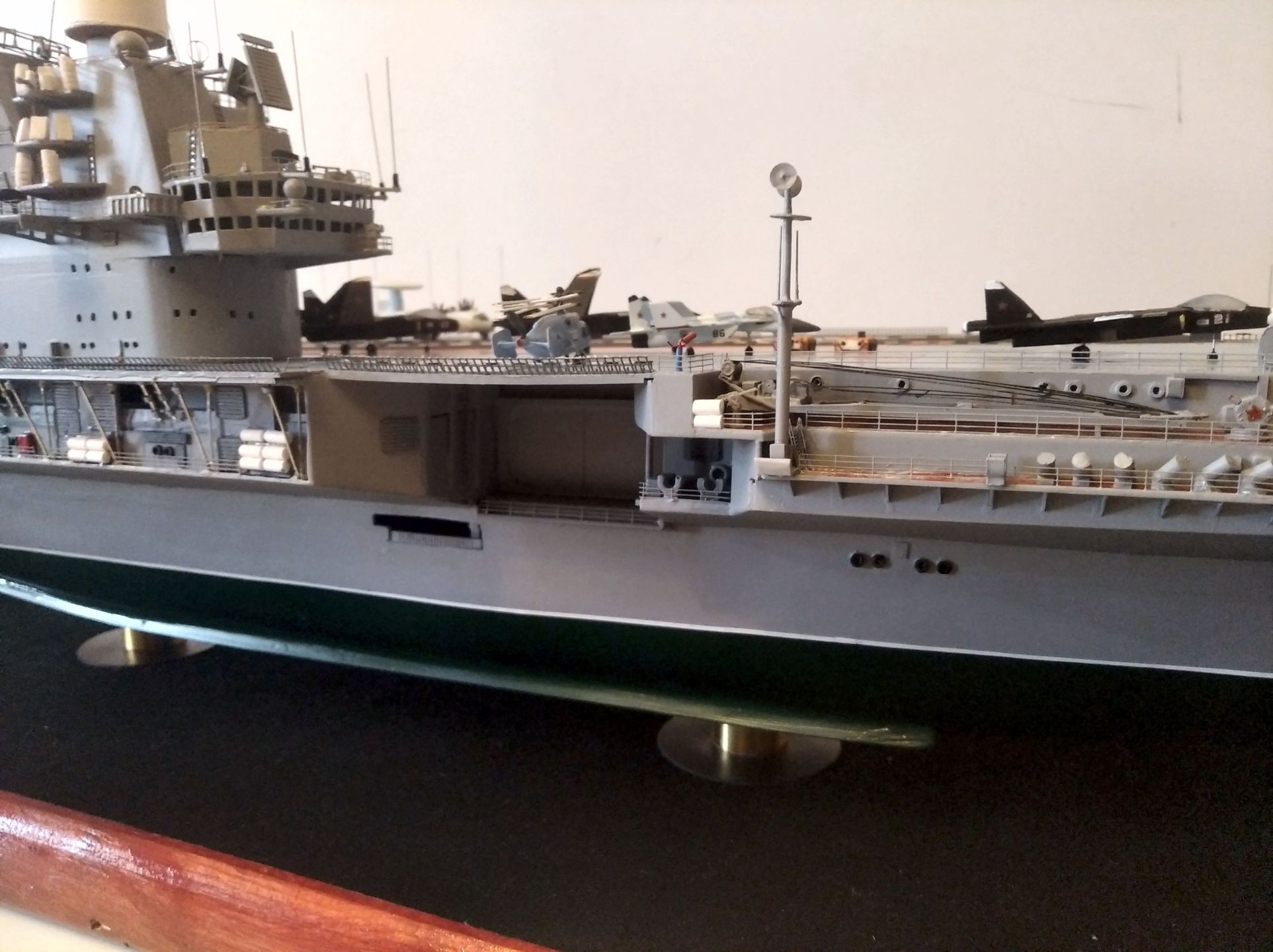 Представленная модель выполнена в варианте замысла с перспективной авиагруппой. Изменения относительно первоначального облика корабля заключаются в замене радиоэлектронного комплекса (РЛК) «Марс-Пассат» на более новый «Форум», для антенн которого была переделана форма надстройки с перепланировкой части помещений. Это можно предположить из того, что уже на проекте 1143.6 планировалась установка перспективного «Форума»