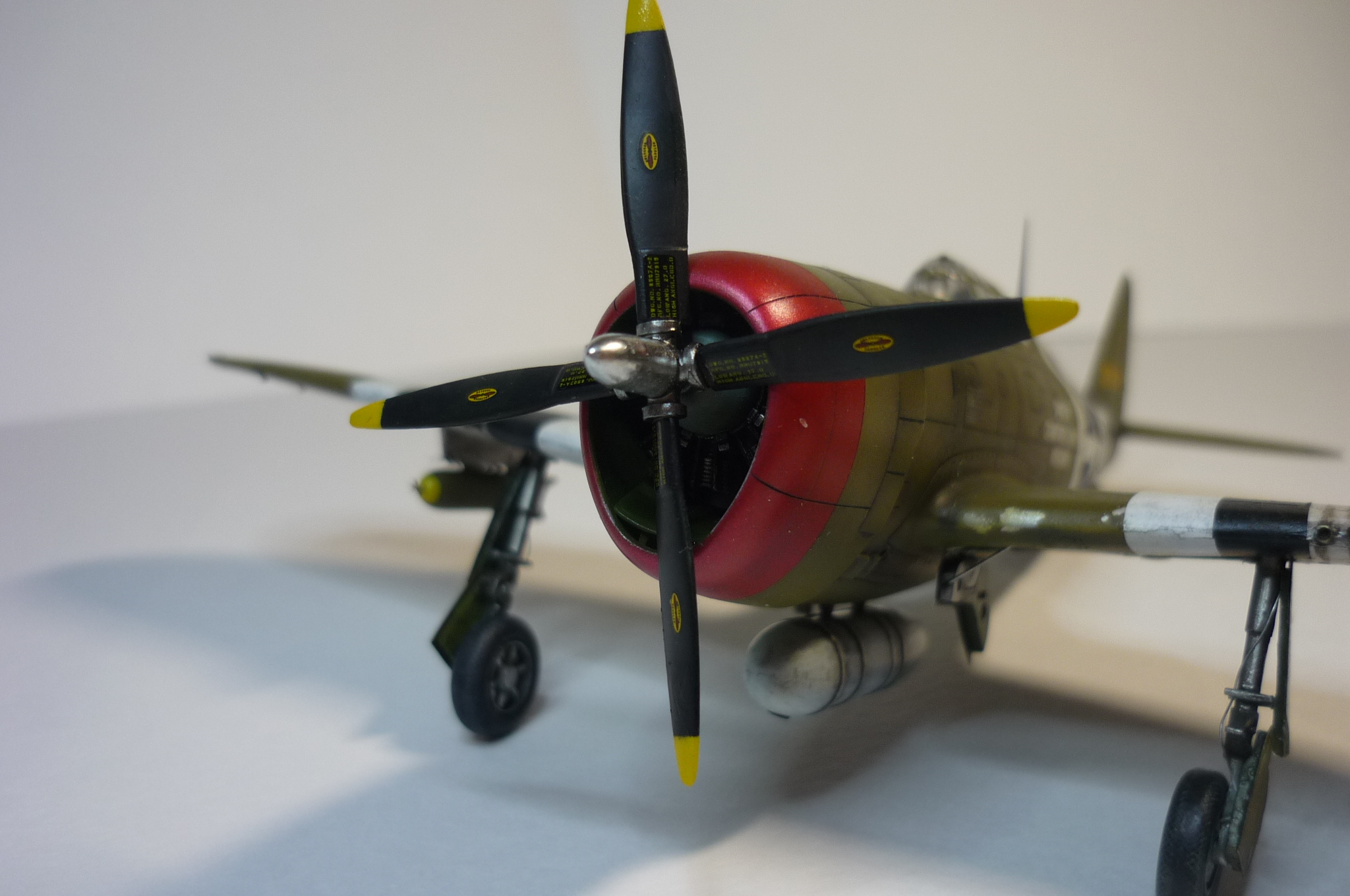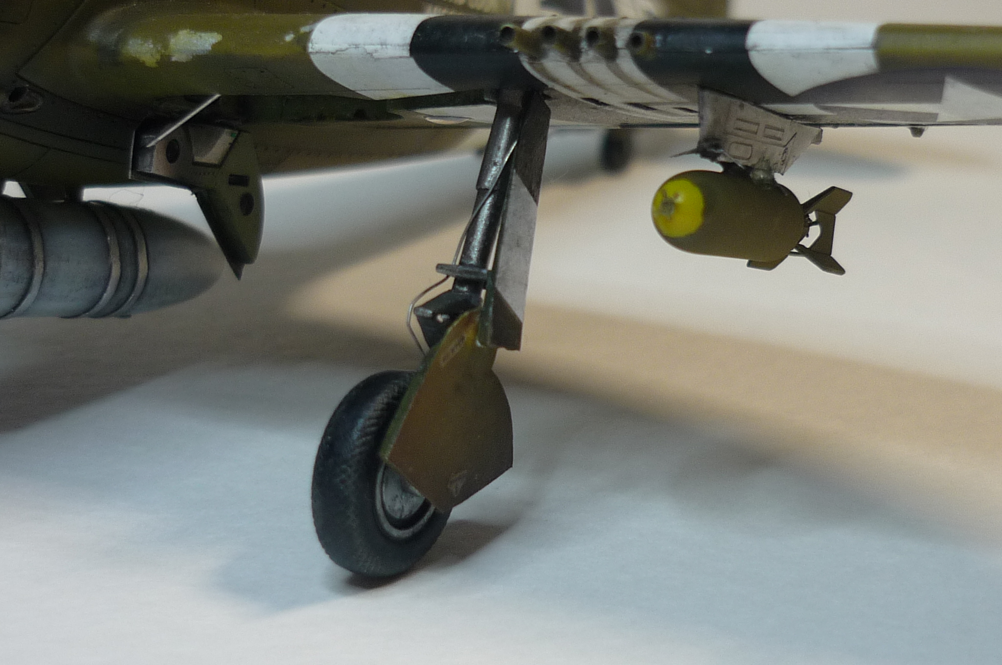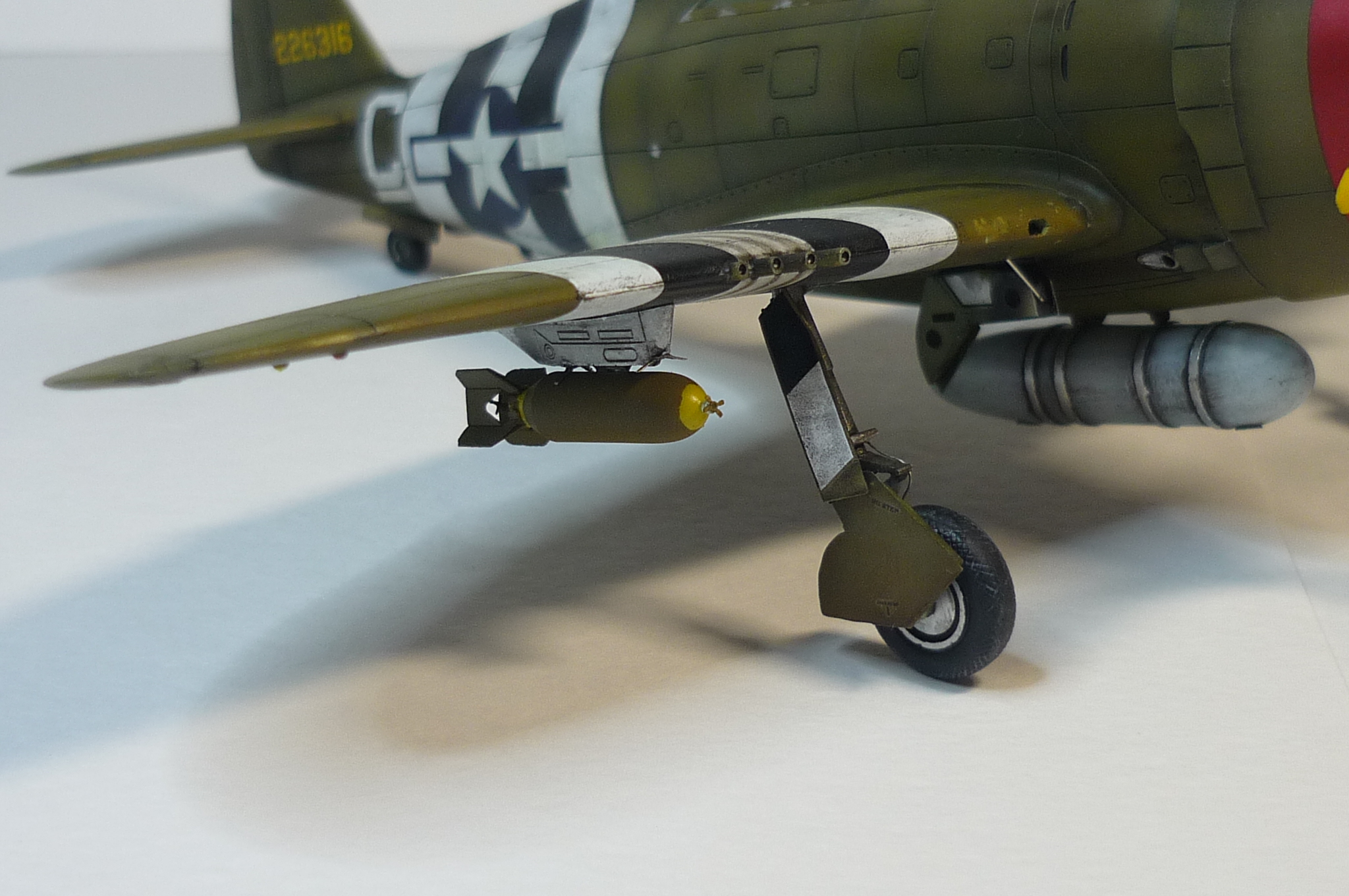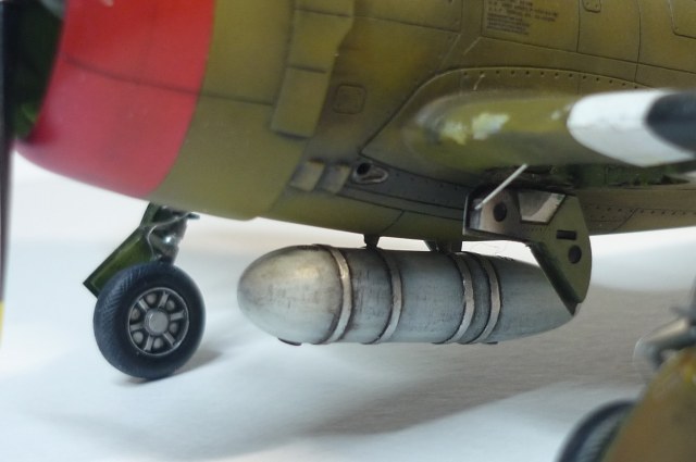 давно подобного бреда не видел (олив драб снизу), малиновый металлик на капоте тоже доставляет, основные косяки как были - так и остались (узкий обтекатель турбины, перегородка под капотом кривовата, ниши в клеточку, диски колес), расшивка все та же косячная - на пузе вообще не в дугу (похожа не ранние В/С без пуза). бомбы видно, что лучше родных... но не хватает желтого кольца сзади и сделанные держатели спереди почему-то не держат бомбу, а в свободном полете