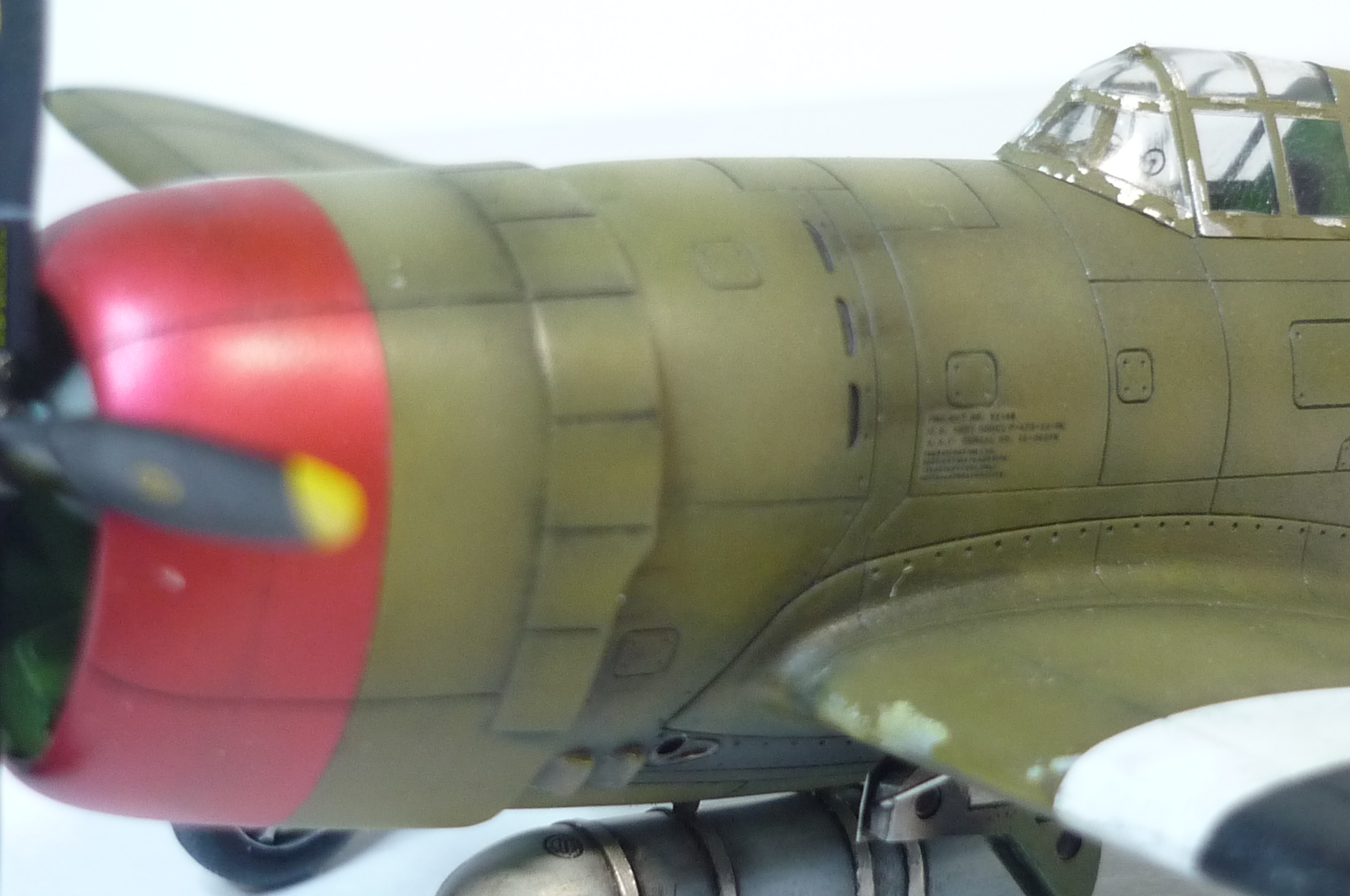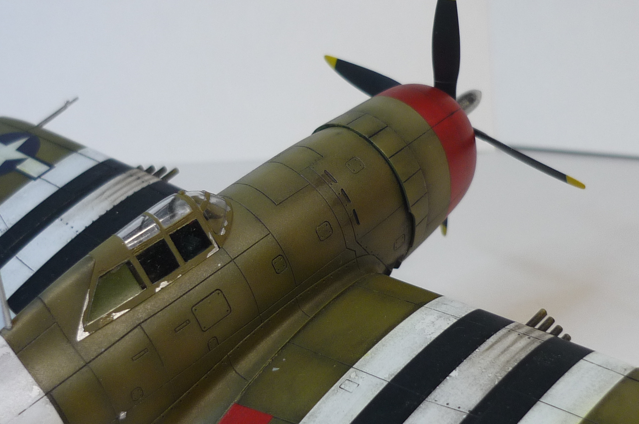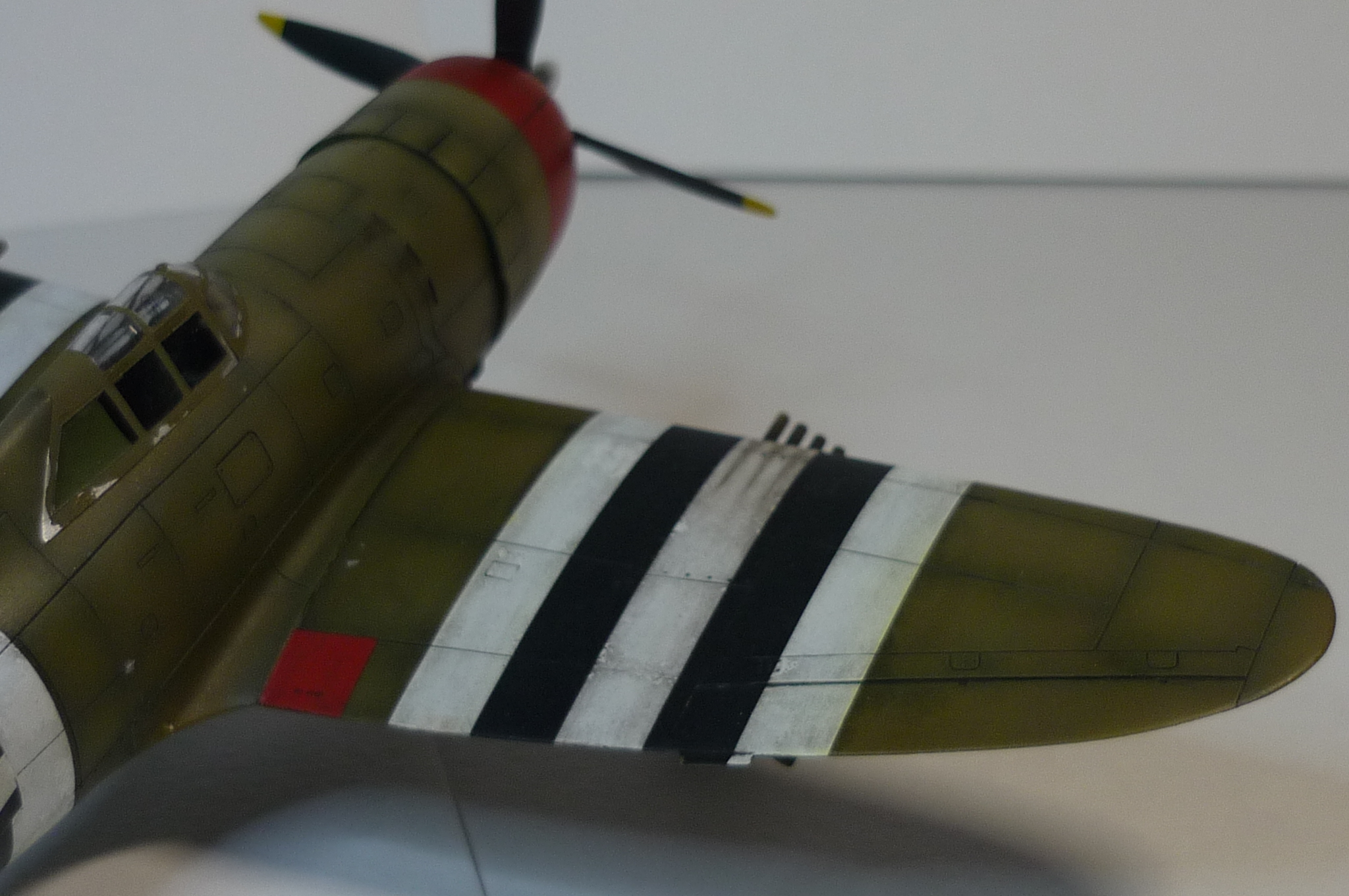 из фото не следует, что он был окрашен вопреки другим - снизу должен быть "нейтрал грей" (на что как бы намекает и цвет подвесных баков с фото прототипа), ну и красный должен быть красным, а не малиновым металликом а-ля тюнинговый Ниссан ZT-R. и если уж на цветное фото ориентироваться, то он пятнистый там (закрашены полосы вторжения сверху). впрочем и такой был (с полосами сверху), до перекраски. так что это только касательно отсылки к цвету. извините за критику, но я просто в теме, а в описании многое не отвечает наблюдаемому и насколько мне понравился Р-38 - настолько не зашел этот Р-47