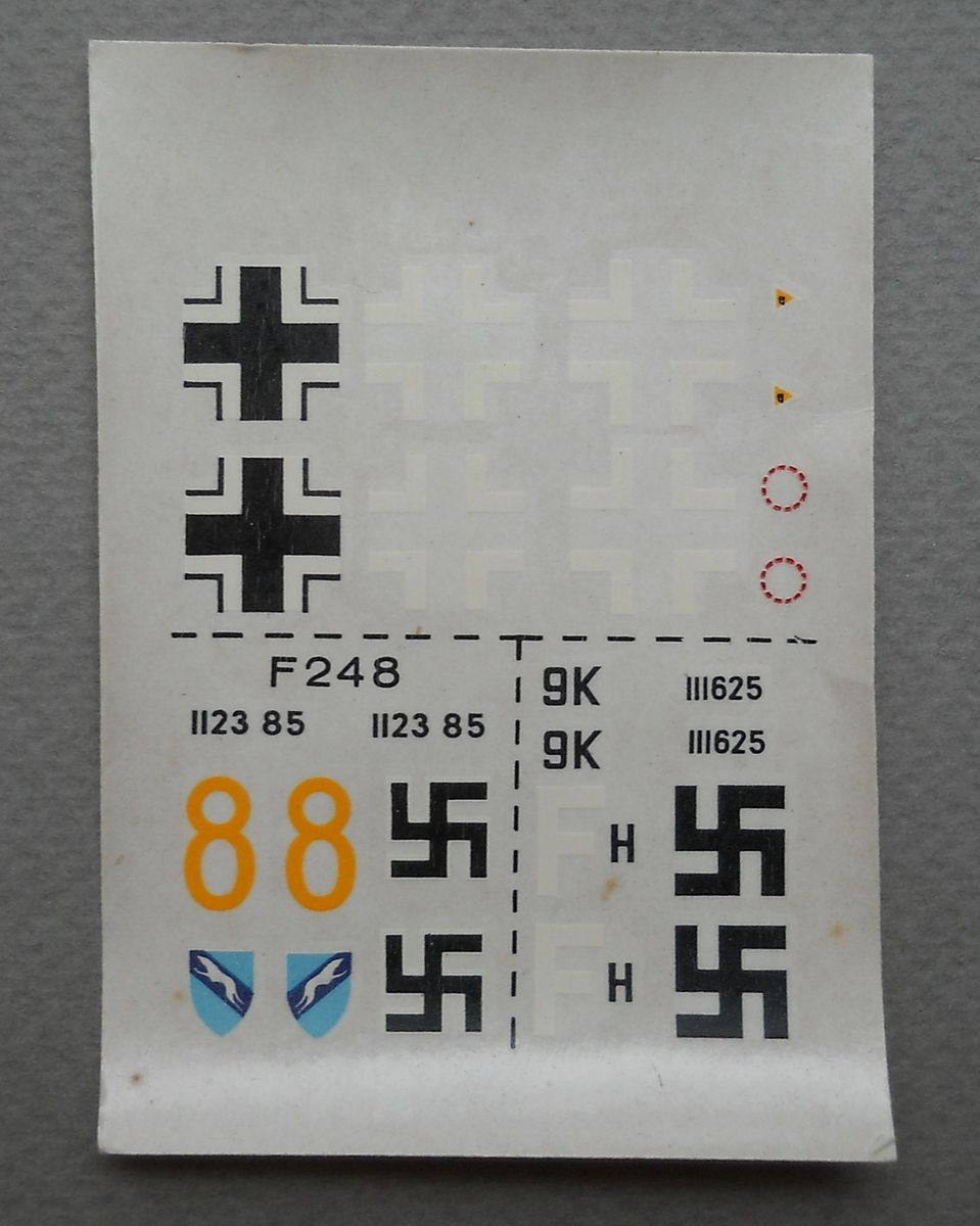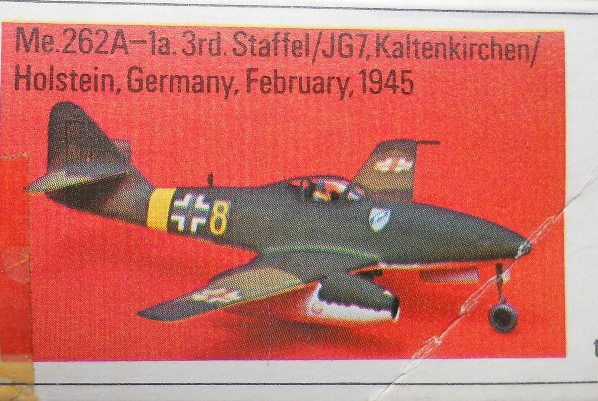 Модель от фирмы Frog в масштабе 1/72 (арт. F248, так называемая «красная серия», выпускался с 1972 по 1977 год, а в перепаковке от Matchbox в 1996 году). Набор предлагает собрать нам Me-262A, он упакован в коробку с лицевым бокс-артом и инструкцией по окраске на обратной стороне. Упаковка помялась и пожелтела от возраста. Внутри четыре литника из серого пластика и фонарь. Литьё неплохого качества для того периода. Часть деталей отлетела с литников за эти годы. Декаль на два варианта самолёта выглядит потрёпанной временем. В комплектацию входит подставка.