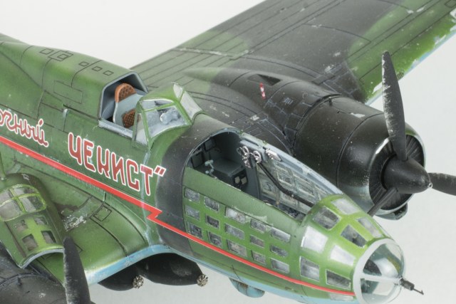 Хорошо получился чекист, нравится модель. Оригинальная возможность у модели показать двигатели, открыть фонарь кабины штурмана не трансформирую при этом модель. Классная возможность и сделано и показано хорошо. Боевой такой Ил получился. Все в этой модели хорошо, за исключением глубокой расшивки...