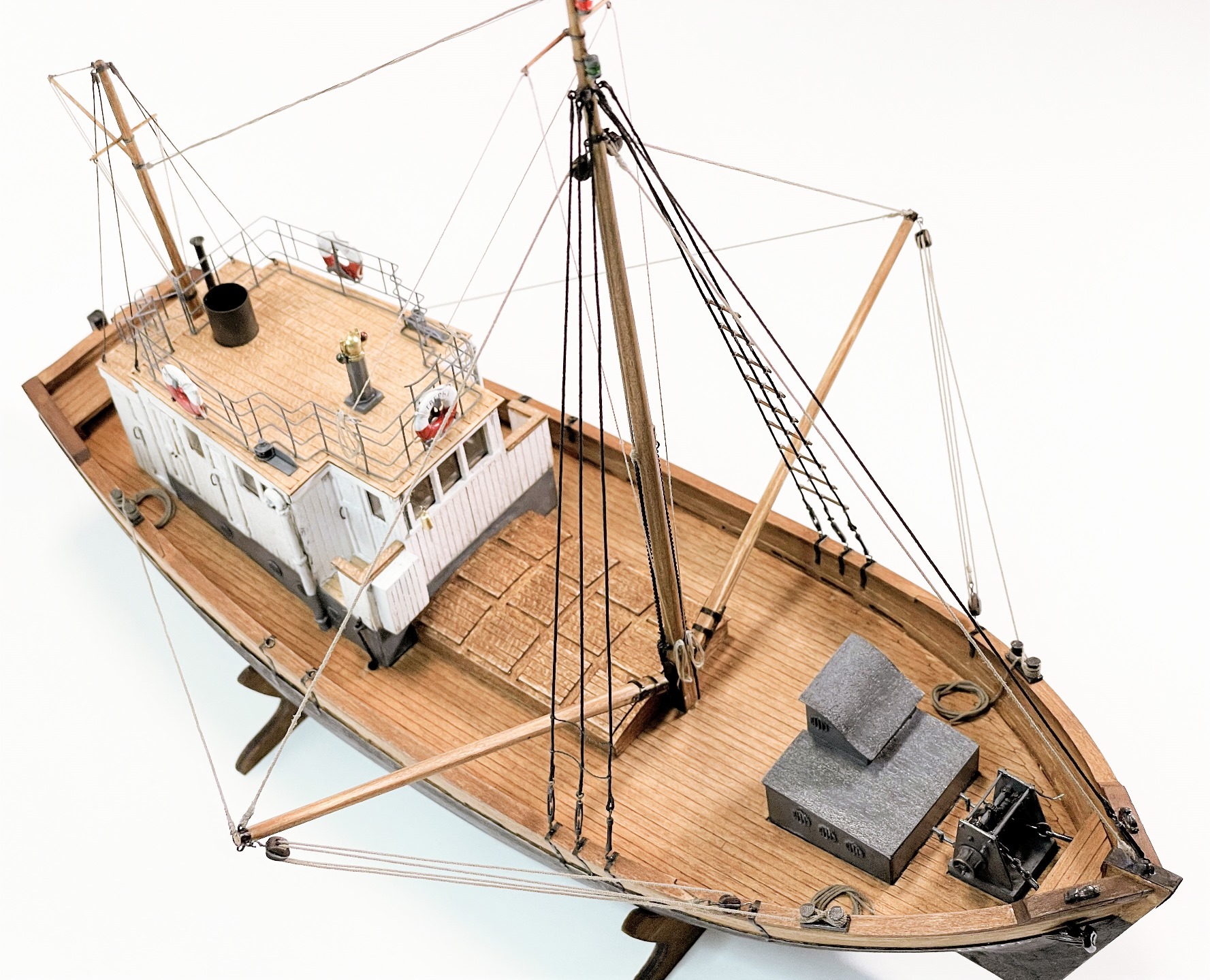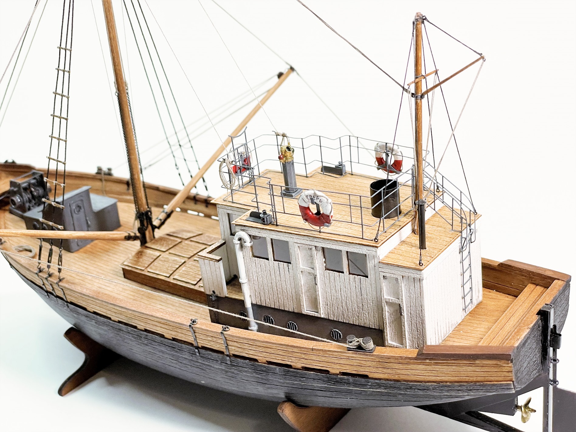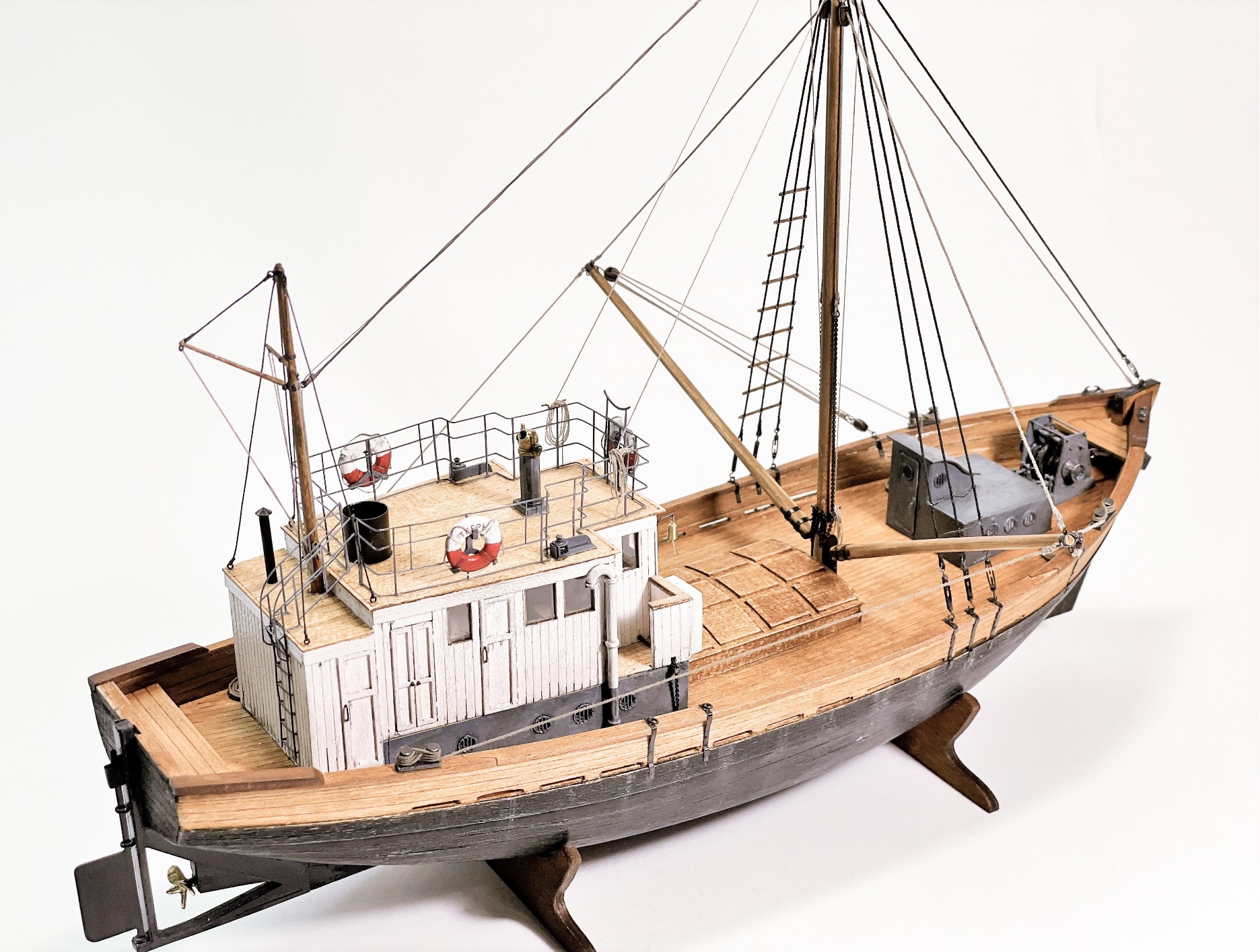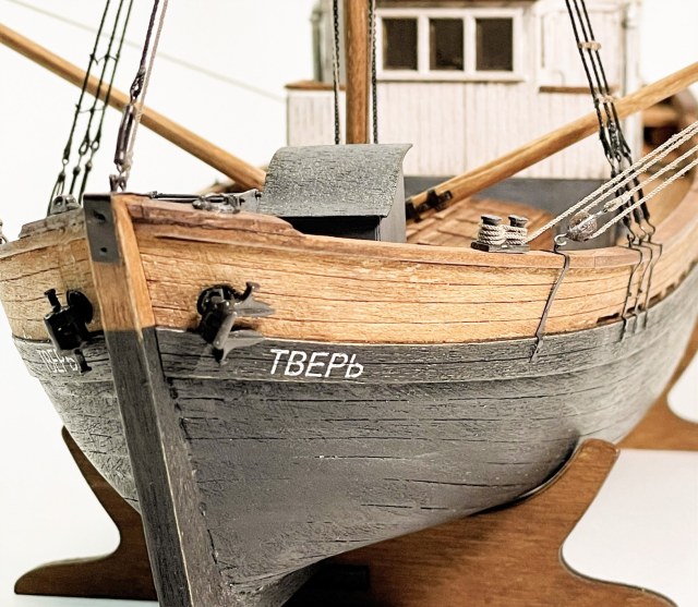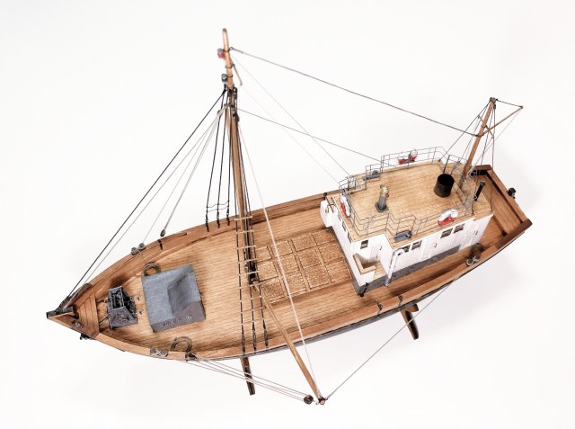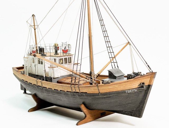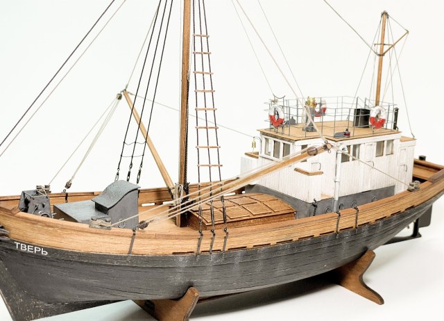 Модель очень понравилась! КЛАИССИКА ЖАНРА!!! Ушатинг нижней части корпуса, норм без излишеств!!! Сам давно присматриваюсь к данному баркасу! Но производитель видимо, очень экономит(но не в цене на Кит) а на мелочевке, и на качестве древесины (скорее всего это даже не дерево а прессованная стружка из КНР) , как видно на фото материал очень пористый, прожилистый, лохматый и щербатый. Вы сделали столько дополнений, к (голому сырому), КИТу!!! Моё уважение!!! Само по себе оснащения(корабельное, погрузочно-спусковое-тралловое) и так не блещет разнообразием, так приходится и еще и самим дополнять!!! Из придирств, палуба в один цвет с фальшь-бортом (надо было фальшь-борт заморить более тёмным, и трюмную-надстройку, и сами люки)С Уважением!!