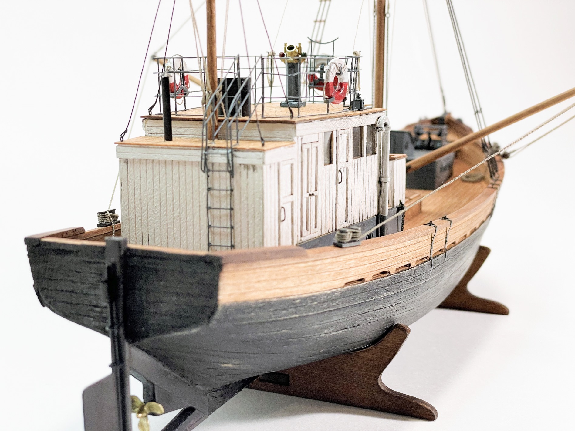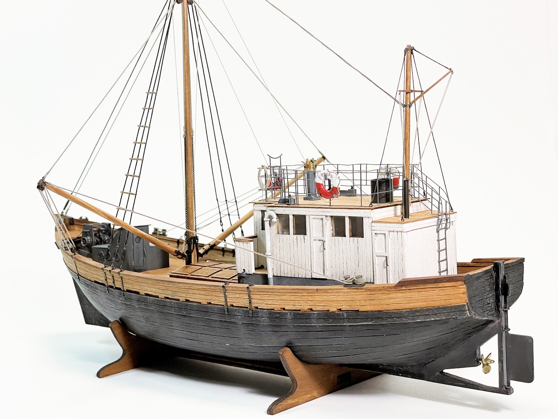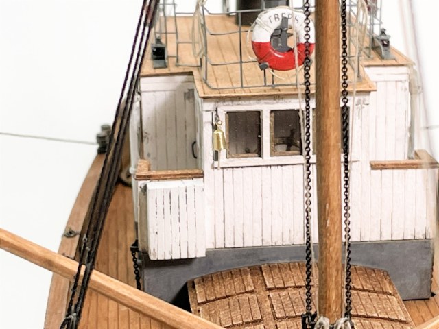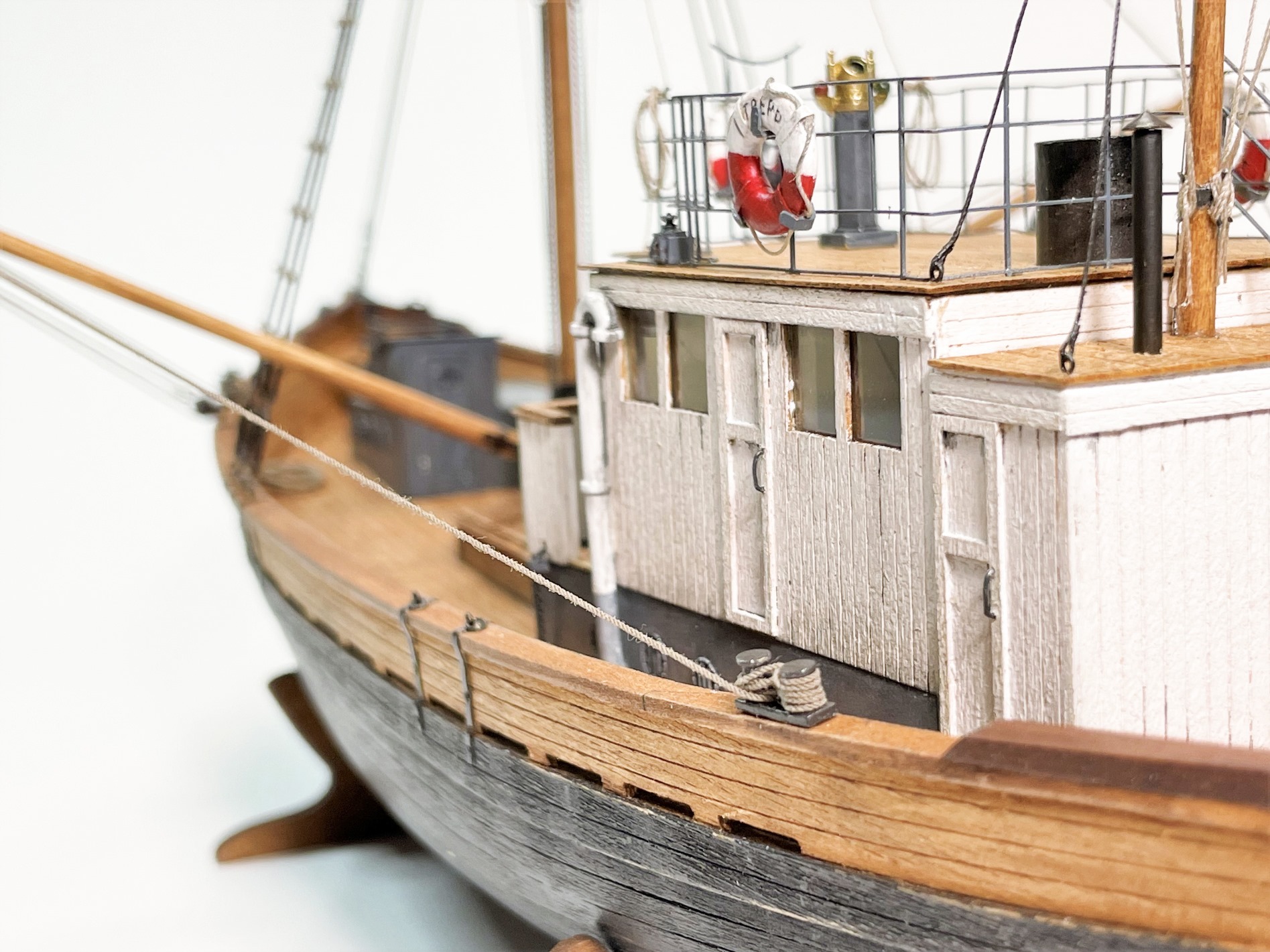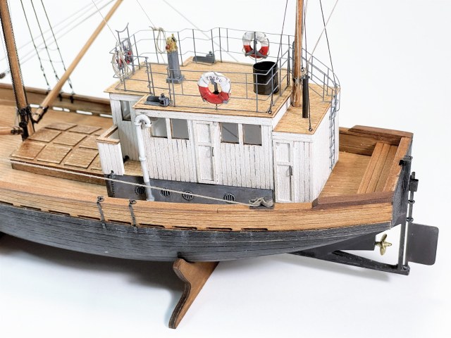 Модель очень понравилась! КЛАИССИКА ЖАНРА!!! Ушатинг нижней части корпуса, норм без излишеств!!! Сам давно присматриваюсь к данному баркасу! Но производитель видимо, очень экономит(но не в цене на Кит) а на мелочевке, и на качестве древесины (скорее всего это даже не дерево а прессованная стружка из КНР) , как видно на фото материал очень пористый, прожилистый, лохматый и щербатый. Вы сделали столько дополнений, к (голому сырому), КИТу!!! Моё уважение!!! Само по себе оснащения(корабельное, погрузочно-спусковое-тралловое) и так не блещет разнообразием, так приходится и еще и самим дополнять!!! Из придирств, палуба в один цвет с фальшь-бортом (надо было фальшь-борт заморить более тёмным, и трюмную-надстройку, и сами люки)С Уважением!!
