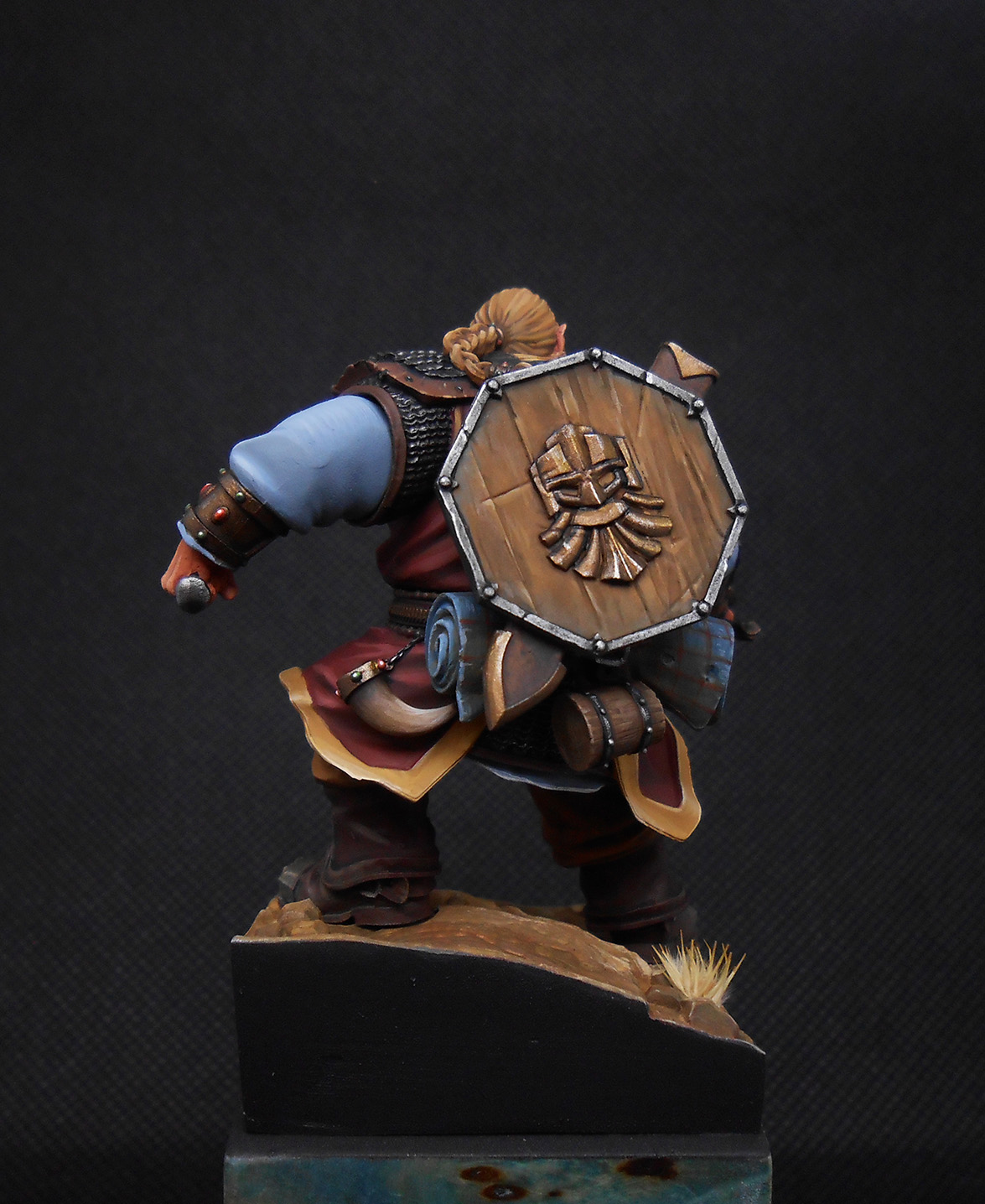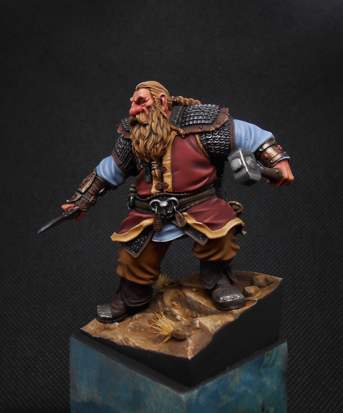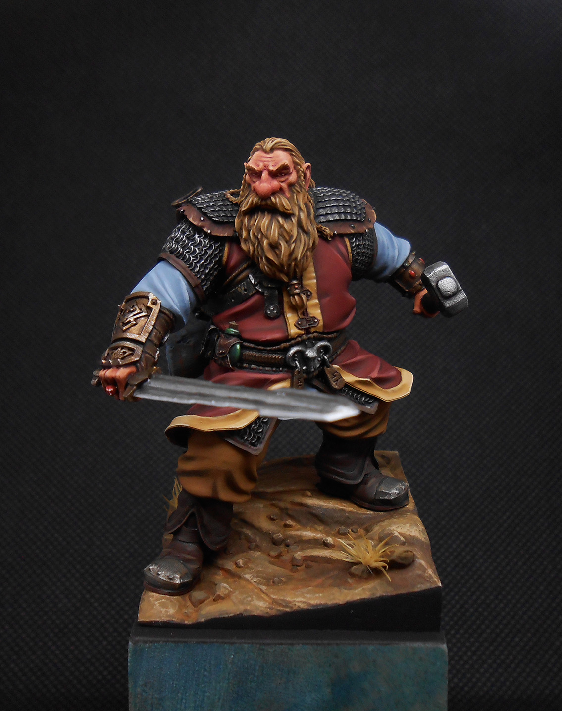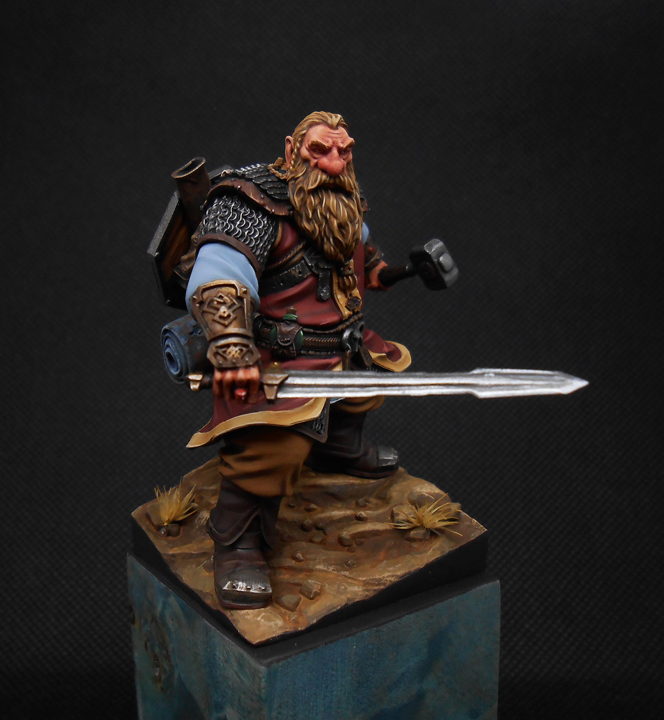 Гном с мечом и молотком. Материал миниатюры - смола, покрашена акрилом, подставка деревянная.