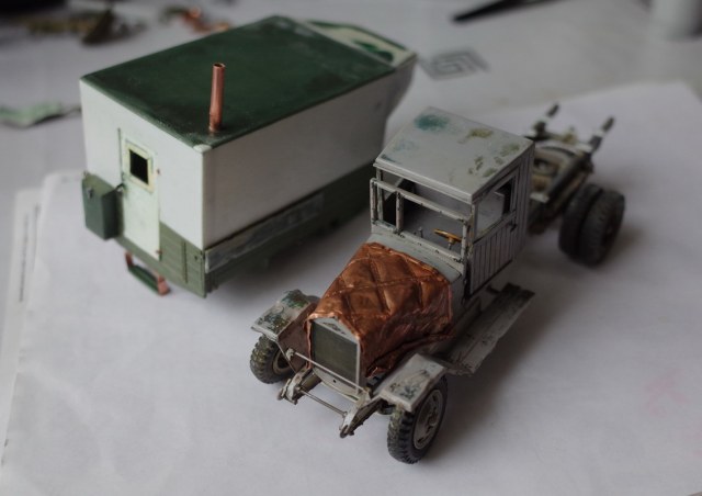 Делал лет 15-20 назад.До наших дней дожили обломки,решил реанимировать.Сделал из тонкого полистирола фургон.Из фольги утеплитель на капот.Обмазал грязью из строительной шпаклевки смешанной с пва.Покрасил акрилом Пасифик88,пачкал акварельными красками которые похитил у дочери.