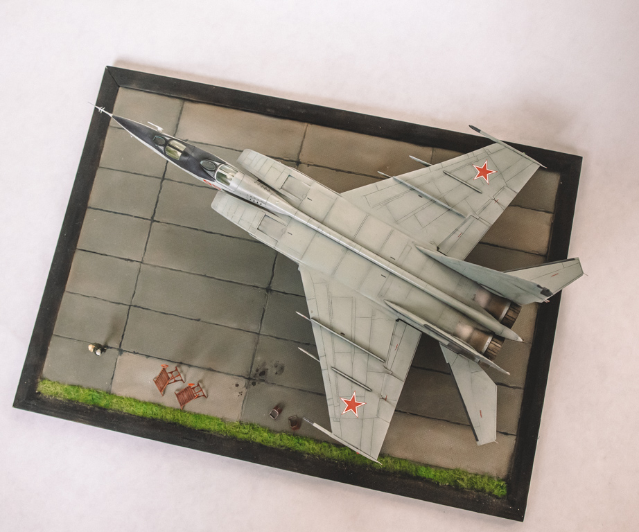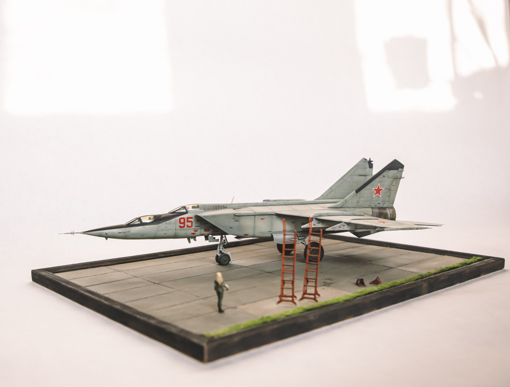Приветствую коллеги! С подвигло собрать данный самолет это дополнения, появившиеся к модели на ARMA MODELS. Плюс фигурка девушки. Сразу вспомнилось, что спарка МиГ-25 использовалась в коммерческих целях для "покатушек" за немалую сумму. Вот и решил изобразить нечто подобное. В кабинах пилот и пассажир. Девушка полетала, теперь очередь следующего. Из дополнений: ПВД от MASTERS, частично травление от Микродизайна, смола шасси и двигатели от ARMA. Окраска-грунт из баллончика, прешейдинг, акрил от TAMIYA, движки-металлики от AK. Нанес следы эксплуатации. Работой доволен. Теперь выставляю на Ваш суд