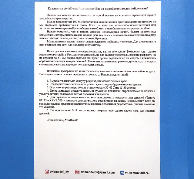 Внутри собственно декаль и два А4 листика с инструкцией.