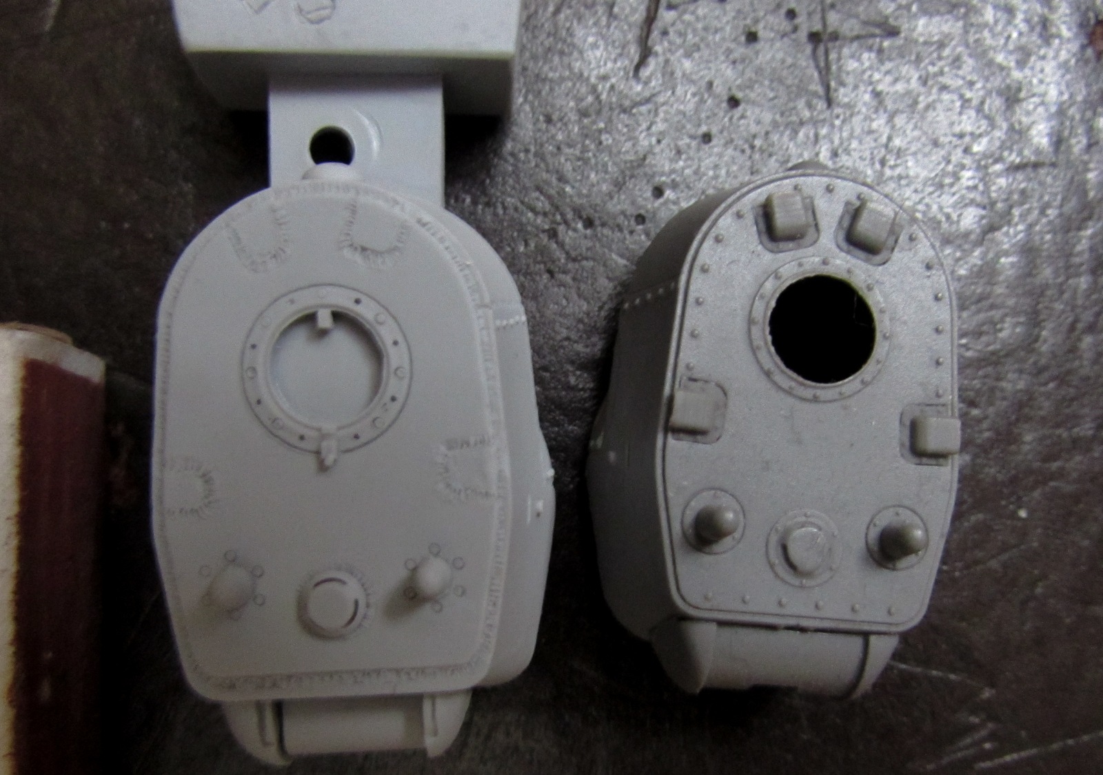 Особенно интересно посмотреть на этот набор в сравнении с аналогом от Григорова, и в данном моменте сравнение будет явно не в сторону последнего. Башня от Григорова отлита местами замыленно, не только имеет местами оплывшие грани деталей - но и немаленького размера недоливы, причем на обоих бортах башни. Причем это не единичный случай - я видел на просторах моделистских форумов еще, как минимум, две аналогичные жалобы. При этом стоимость набора от Григорова почти в два раза выше.