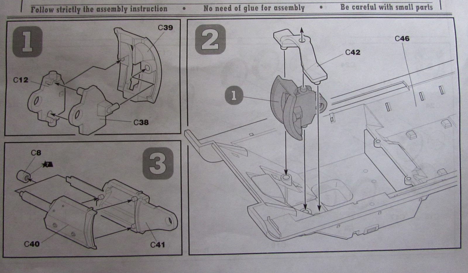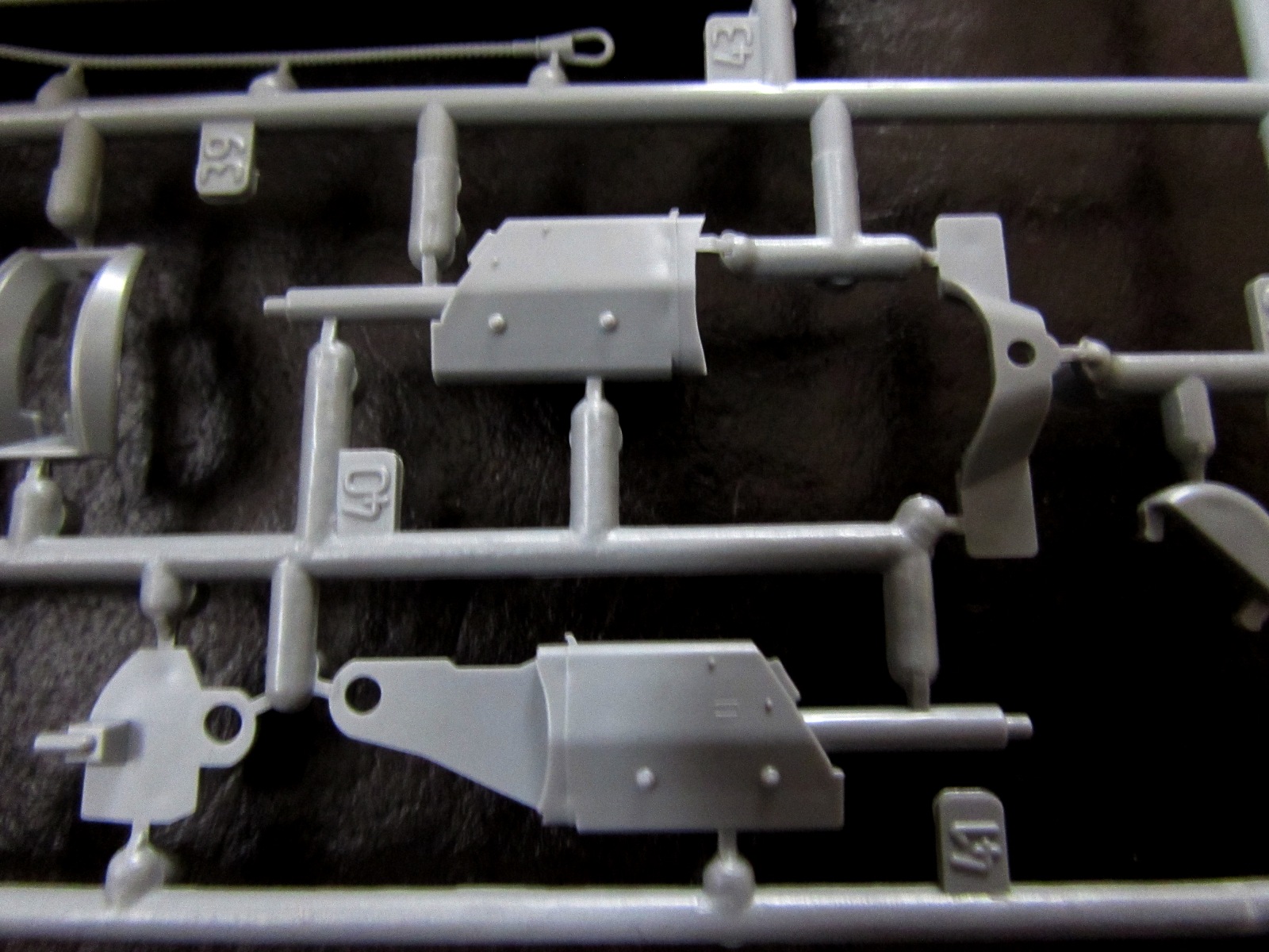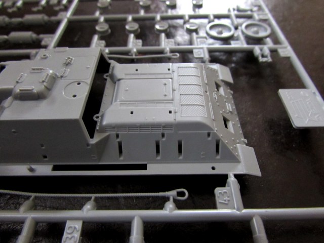 За редким исключением, отвратительная. Патрубки с двумя утяжинами каждый, оплывшие укладки шпор на траки и просто столбовой толщины поручни. Последнее, после более чем неплохого качества решений на ИС-ИСУ и даже Т-34-85, очень удивляет и огорчает. Не меньшее удивление вызывают и топливные баки, точнее, их крепление к модели. Сначала было подозрение, что это "издержки тестовой сборки" (которые в последнее время у фирмы просто огонь), но при ближайшем рассмотрении оказывается, что сами половинки баков отлиты так, что устанавливаются на модель, смотря горловинами в борт.