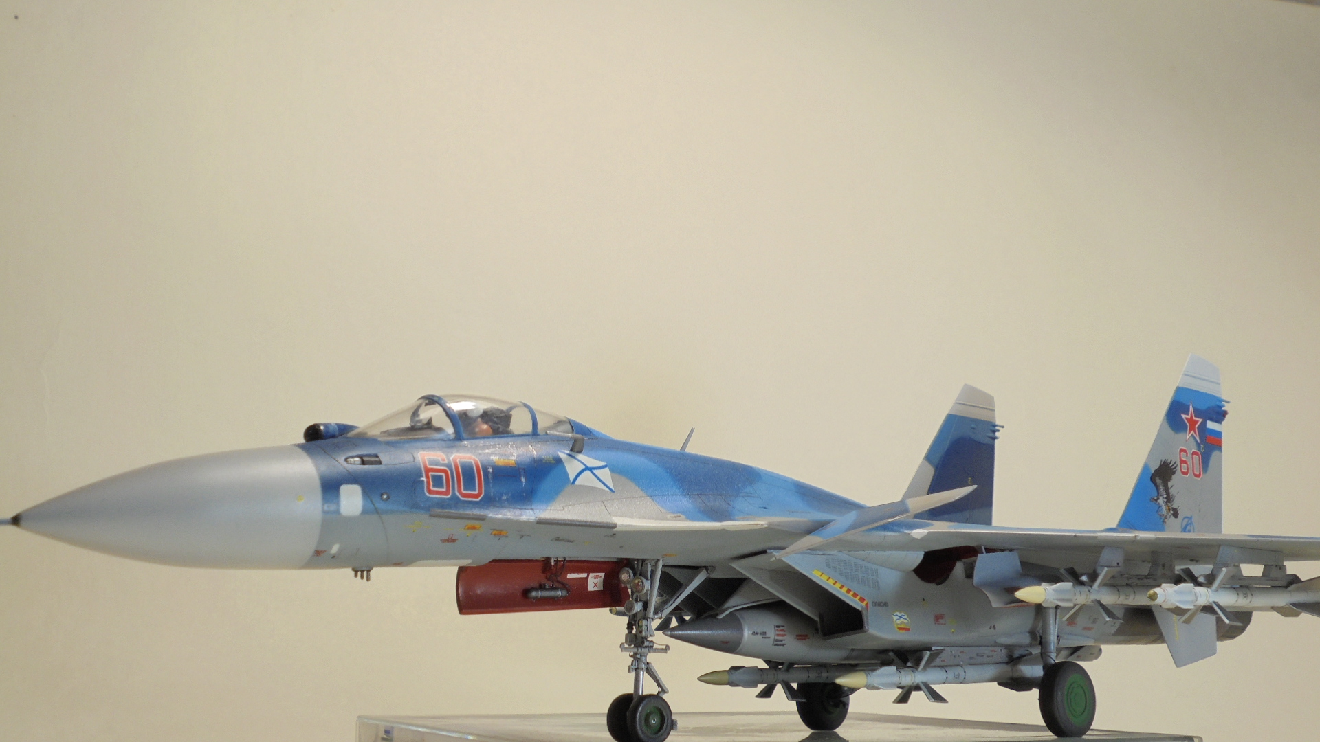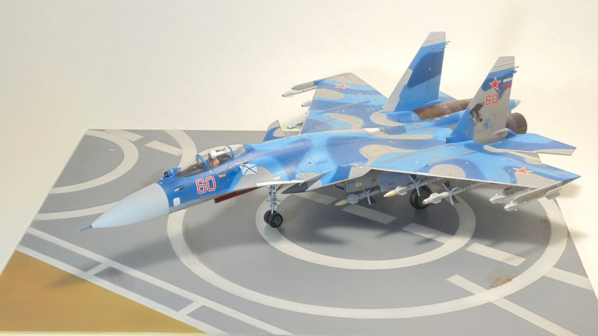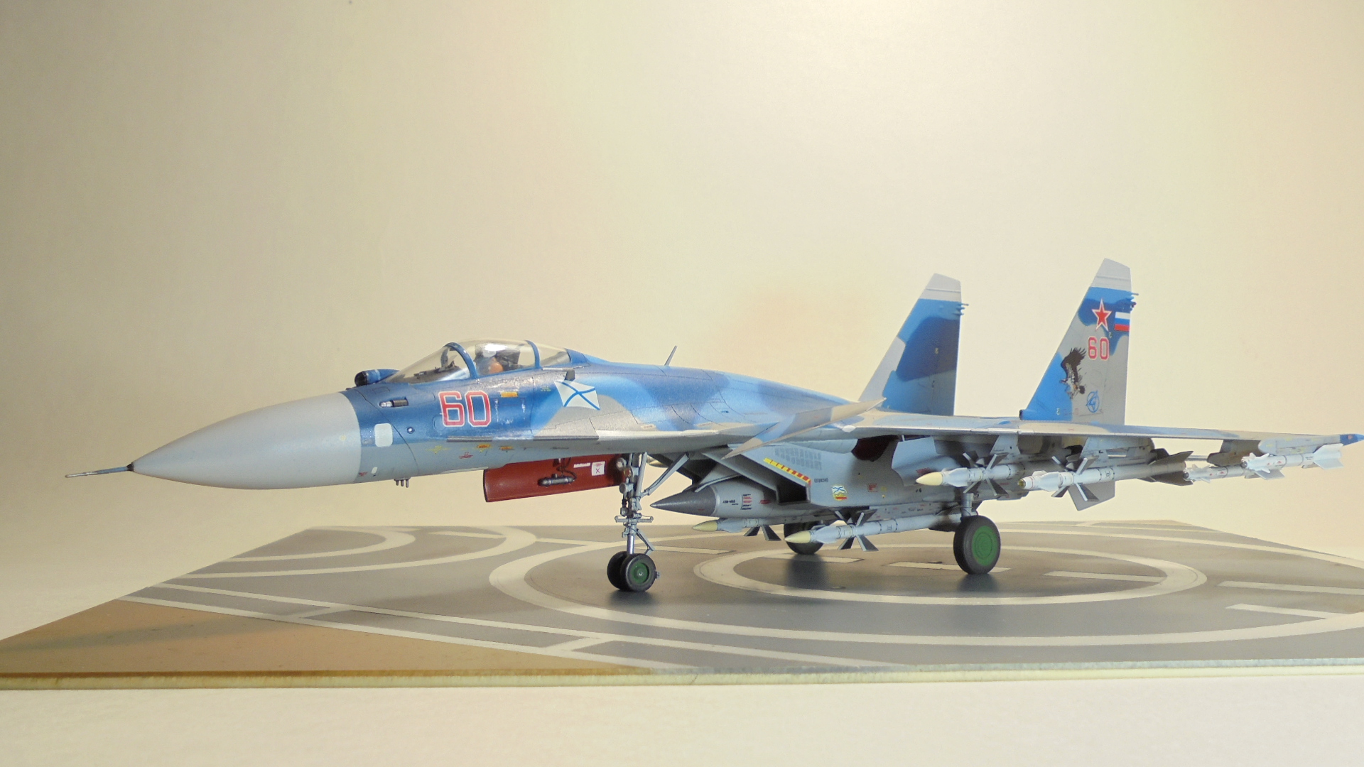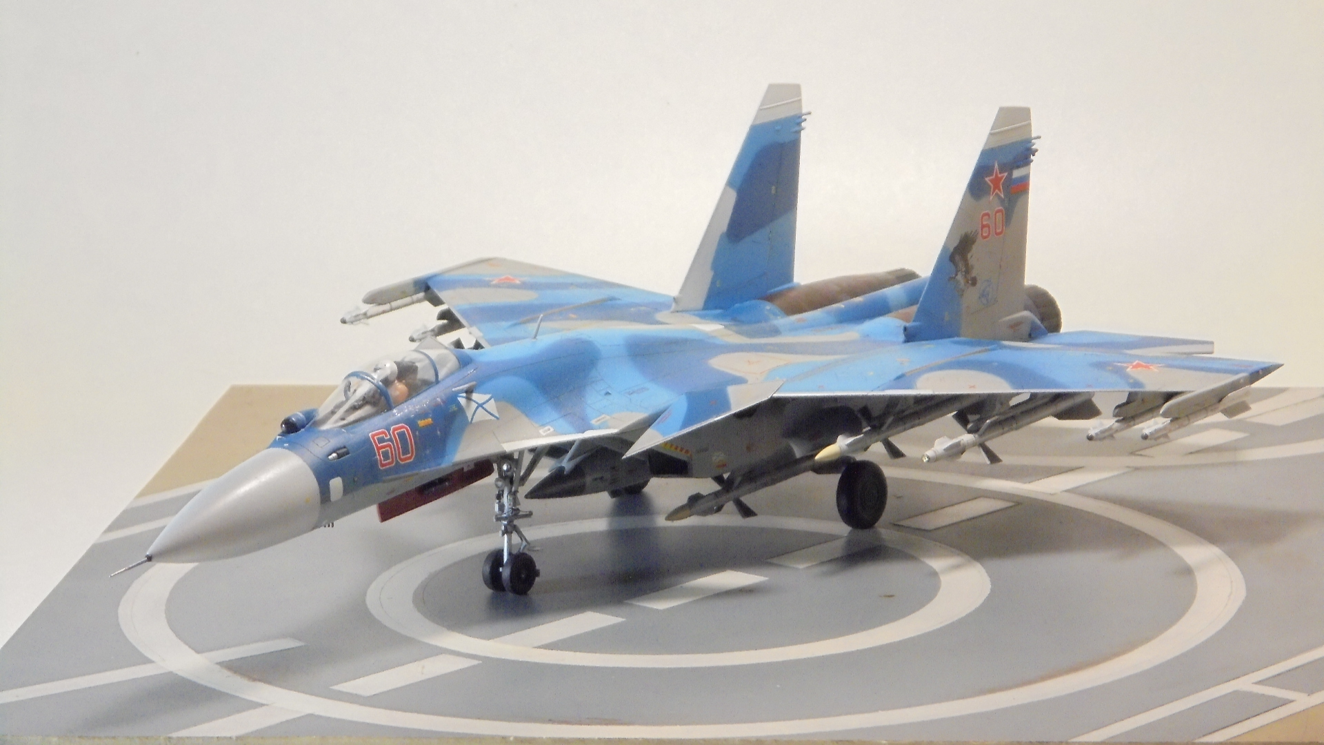 Доброго вечера.Представляю вашему вниманию модель Су-33 заводской шифр Т-10К; ранее известный как Су-27К. Собирал с минимальными доработками в кабине пилота подобие зеркал из фольги из плёнки ИЛС, проводка на стойках шасси,фары из страз и глаза у ракет Р-27ЭТ,пушка из мед ... иглы,хвостовой АНО .Красил нитро красками смешивал на глаз.КАМО красив и сложен рисовал дня два с помощью воскового пластилина и молярного скотча.Декаль попалась с брачком бортовые номера были смазаны пришлось искать другие и соображать борт 60. Смывка маслом.Пачкал совсем мало.Кусок Палубы из пластика делал очень давно для другой модели.Модель для своей цены конечно нормального качества со своими косяками в стыковке деталей,кое где не верная расшивка. Рассматривалась возможность подвески под самолёт ракеты Москит, что я и сделал ну и нарядил остальными ракетами как елку к Новому Году .Конечно такой подвес фантастика но на полке смотрится эффектно. Собрал как смог, конечно косяков хватает,результатом доволен. Приятного просмотра.