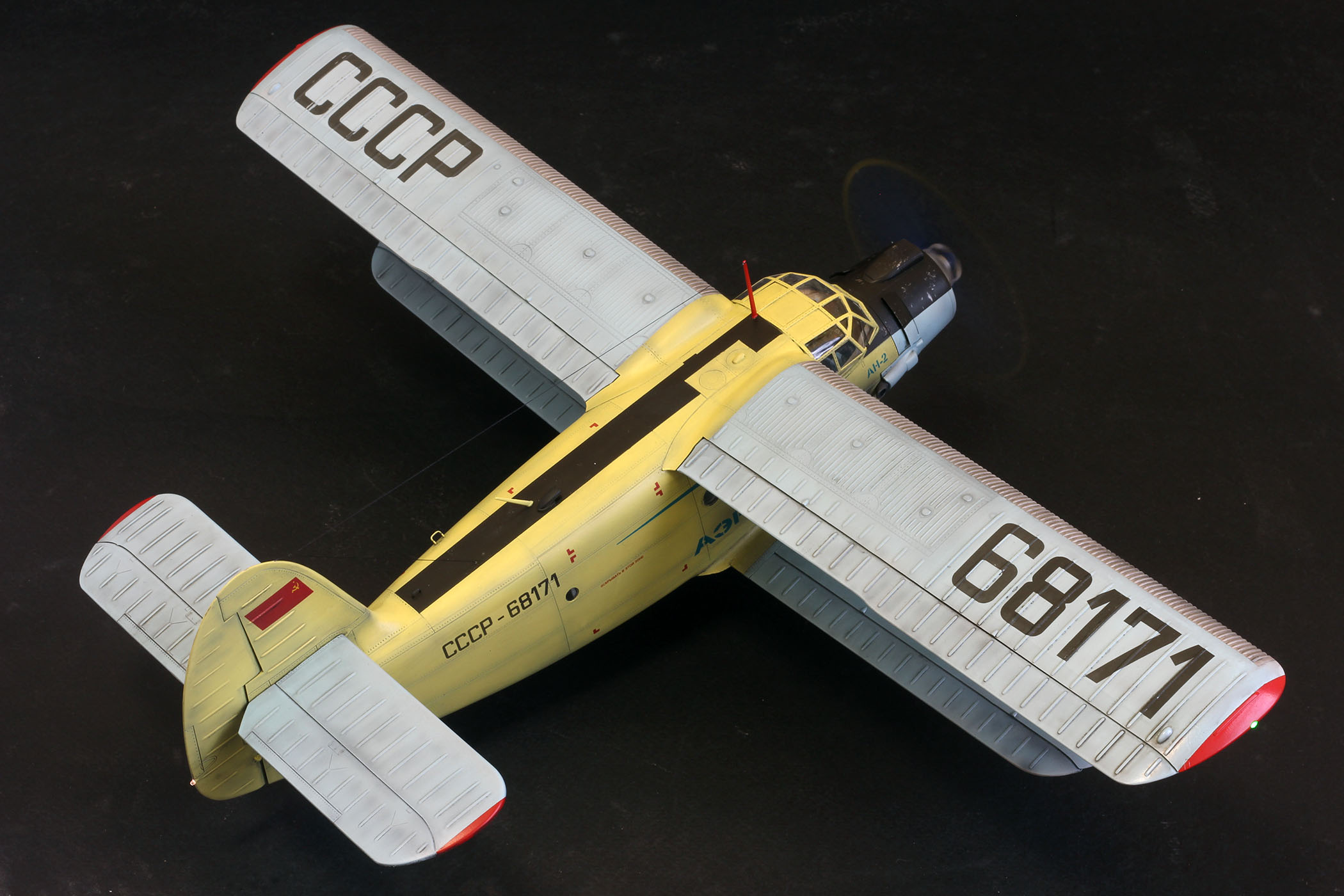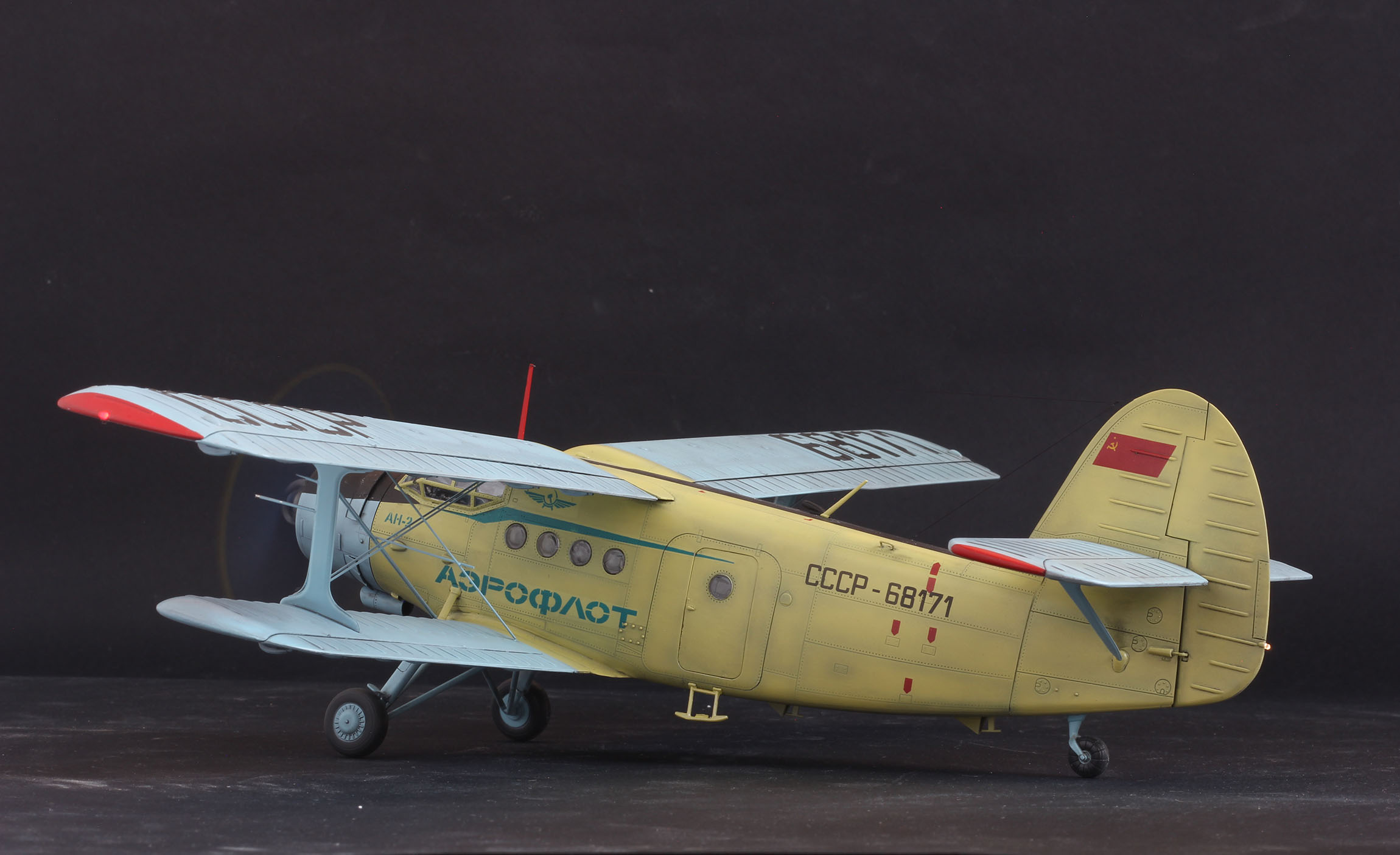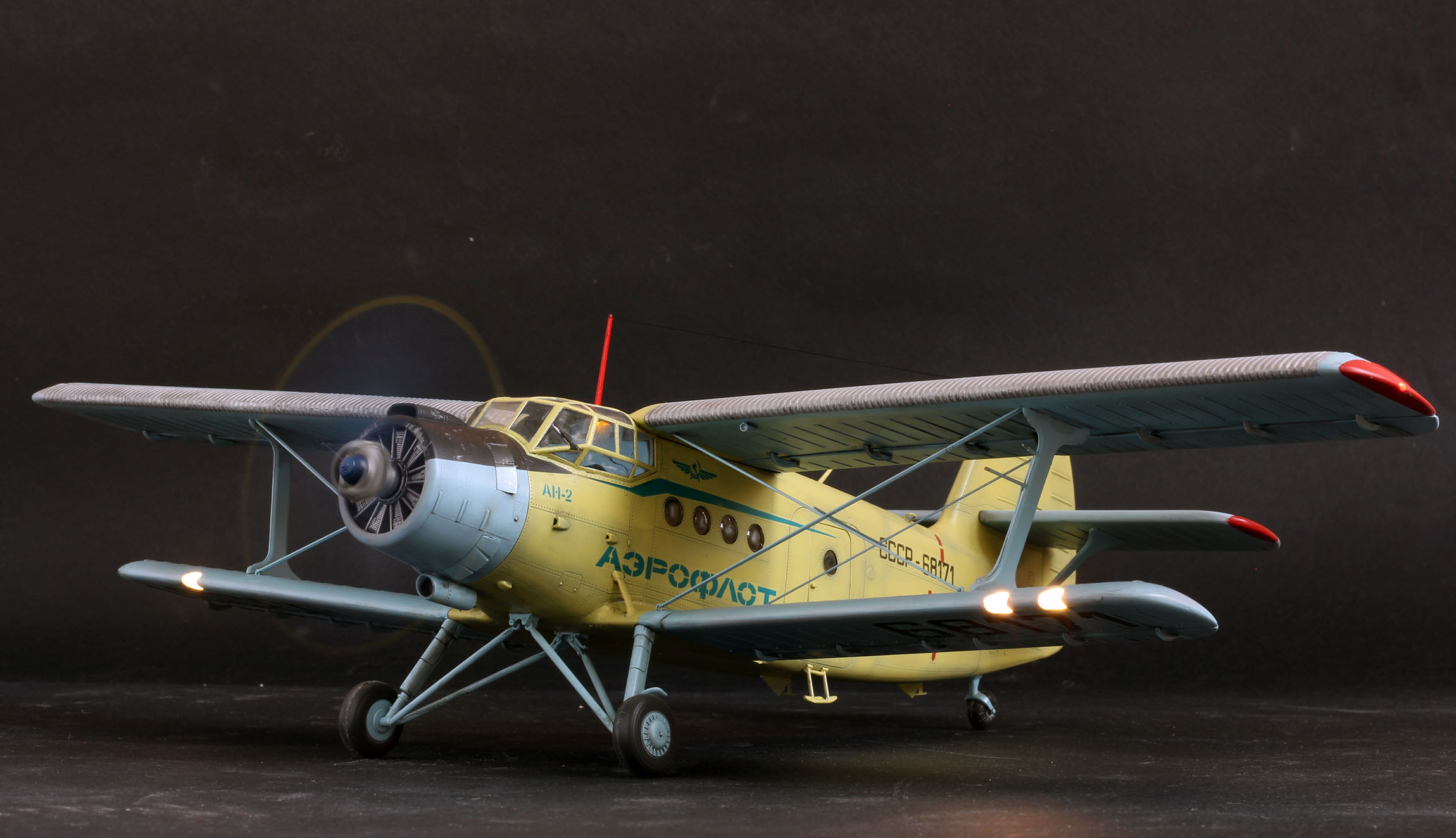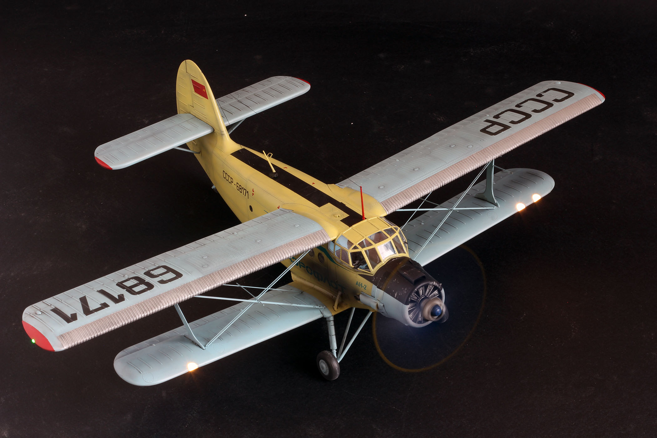 Ан2 от Хобби Босс из коробки, добавил лампочки и моторчик, в мат часть не лез. К конкретному прототипу привязки нет, некий собирательный образ. Так что гот ов к табуреткам.