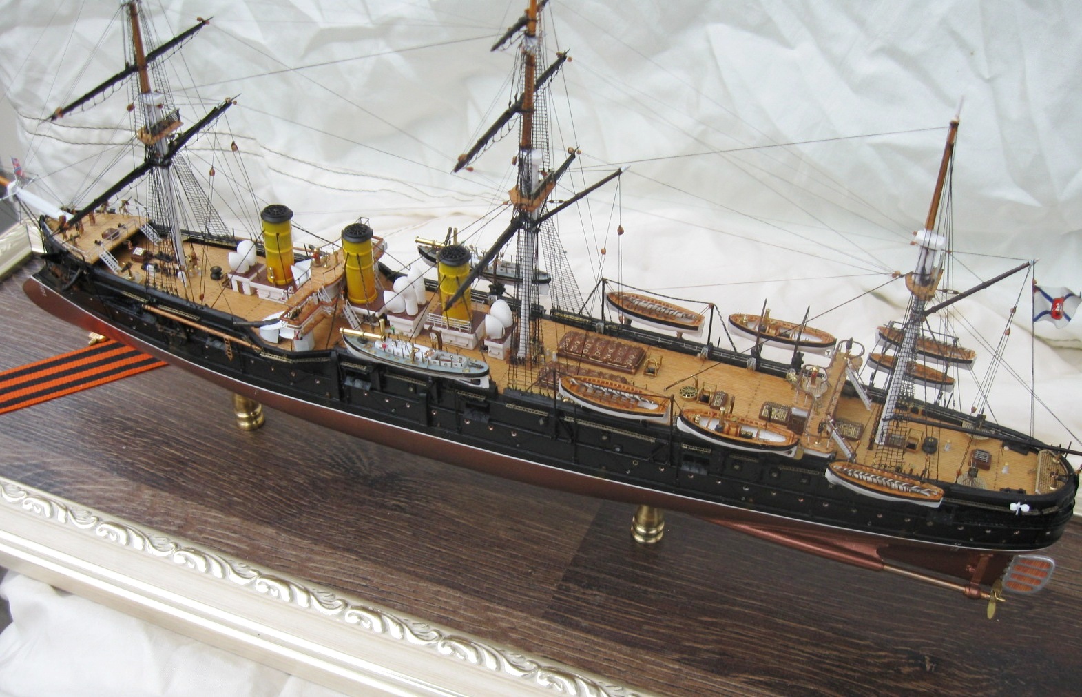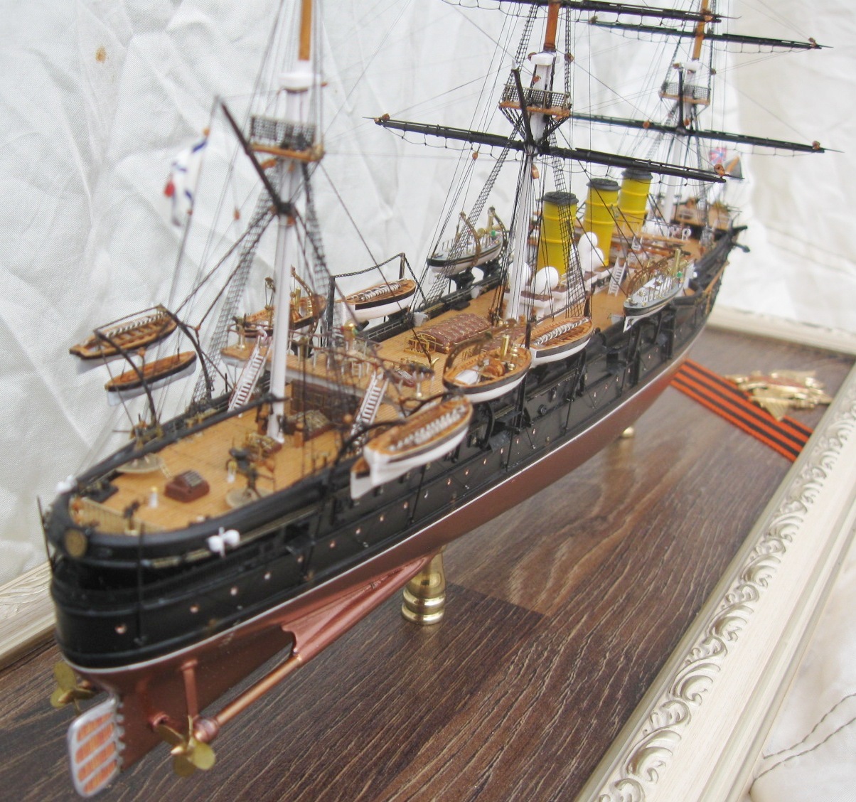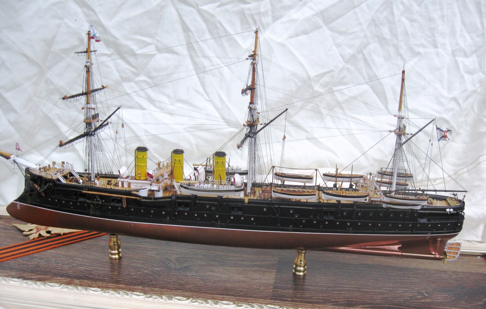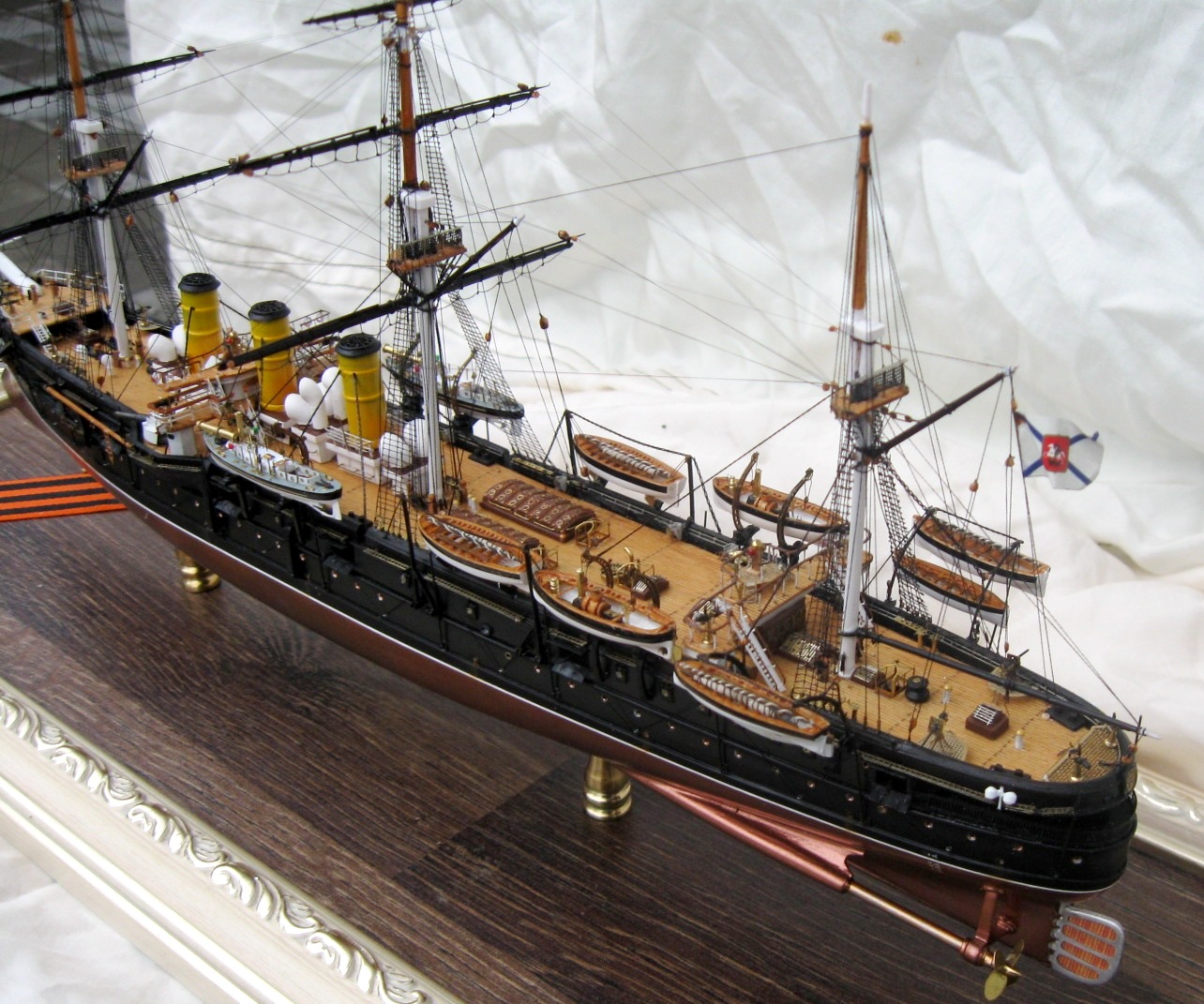 Модель была построена за 4 месяца. Корпус традиционно для меня их ПВХ пластика, палуба из шпона ольхи, шлюпки отлиты из литьевой смолы, для надстроек, световых люков и орудийных щитов использовал обычные жалюзи из алюминия 0,3мм , мне очень понравился этот материал, хорошо клеится, как пайка не оторвешь , легко обрабатывается и гнется. Палубы мостиков тоже делал из него предаварительно наклеив на него шпон. Трубы из фломастера, Мачты и реи на этот раз не из гвоздей ,а из бамбуковых палочек блоки из березовых зубочисток. Палубы шлюпки, стеньги мачт и блоки покрывалось средством для имитации легкой ржавчины вместо морилки. Окраска из баллончика нитрокрасками. Хочу выразить благодарность коллегам по форуму Игорю Тараканову за его энциклопедические знания, а также очень помогла сказка по постройке Памяти Азова Игоря Юрьевича. С нетерпением жду завершения его стройки.