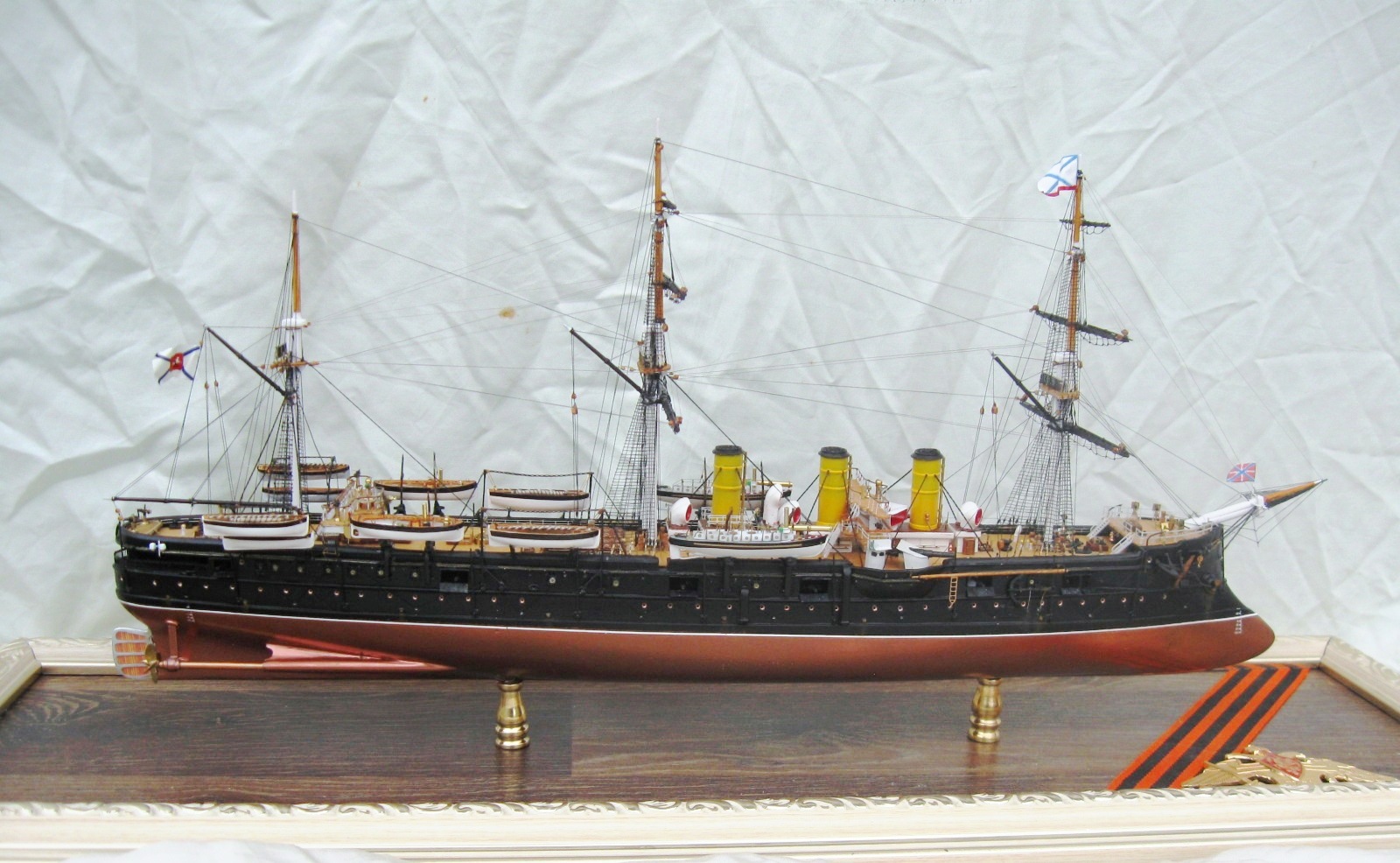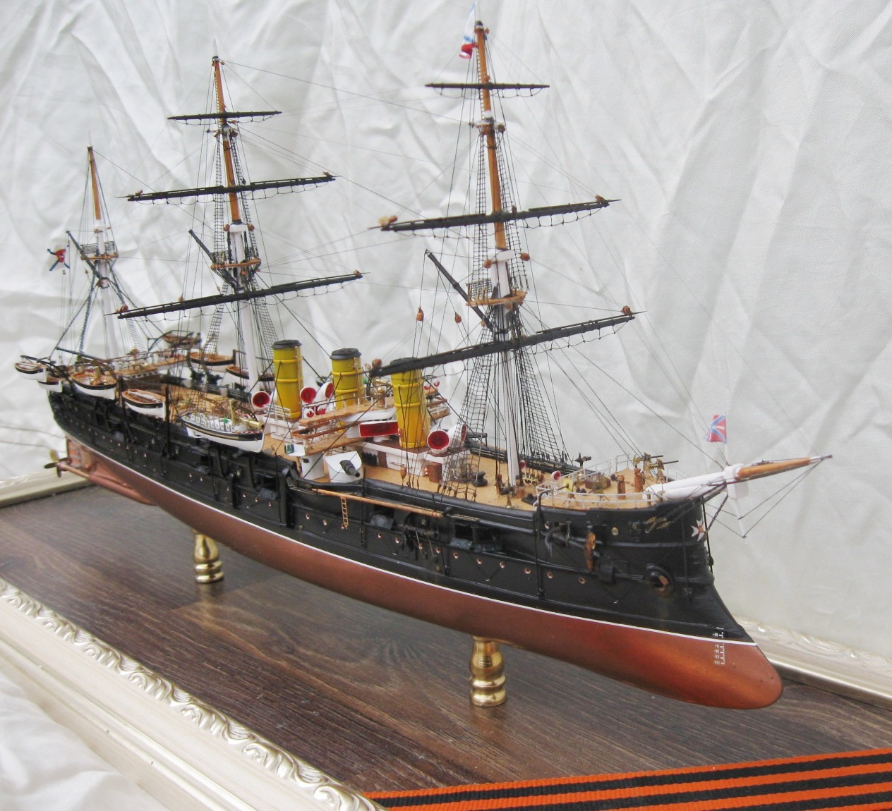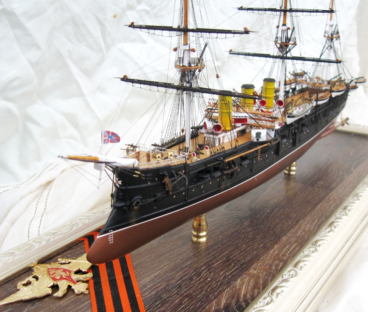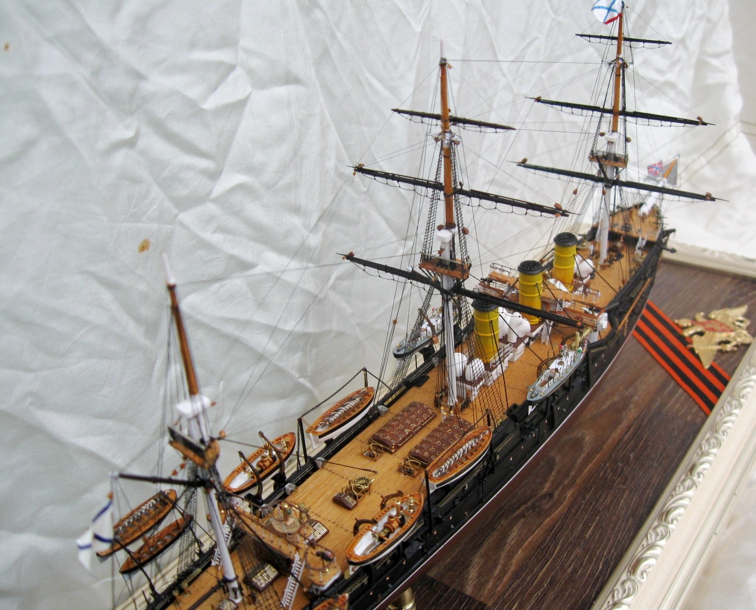 Модель была построена за 4 месяца. Корпус традиционно для меня их ПВХ пластика, палуба из шпона ольхи, шлюпки отлиты из литьевой смолы, для надстроек, световых люков и орудийных щитов использовал обычные жалюзи из алюминия 0,3мм , мне очень понравился этот материал, хорошо клеится, как пайка не оторвешь , легко обрабатывается и гнется. Палубы мостиков тоже делал из него предаварительно наклеив на него шпон. Трубы из фломастера, Мачты и реи на этот раз не из гвоздей ,а из бамбуковых палочек блоки из березовых зубочисток. Палубы шлюпки, стеньги мачт и блоки покрывалось средством для имитации легкой ржавчины вместо морилки. Окраска из баллончика нитрокрасками. Хочу выразить благодарность коллегам по форуму Игорю Тараканову за его энциклопедические знания, а также очень помогла сказка по постройке Памяти Азова Игоря Юрьевича. С нетерпением жду завершения его стройки.