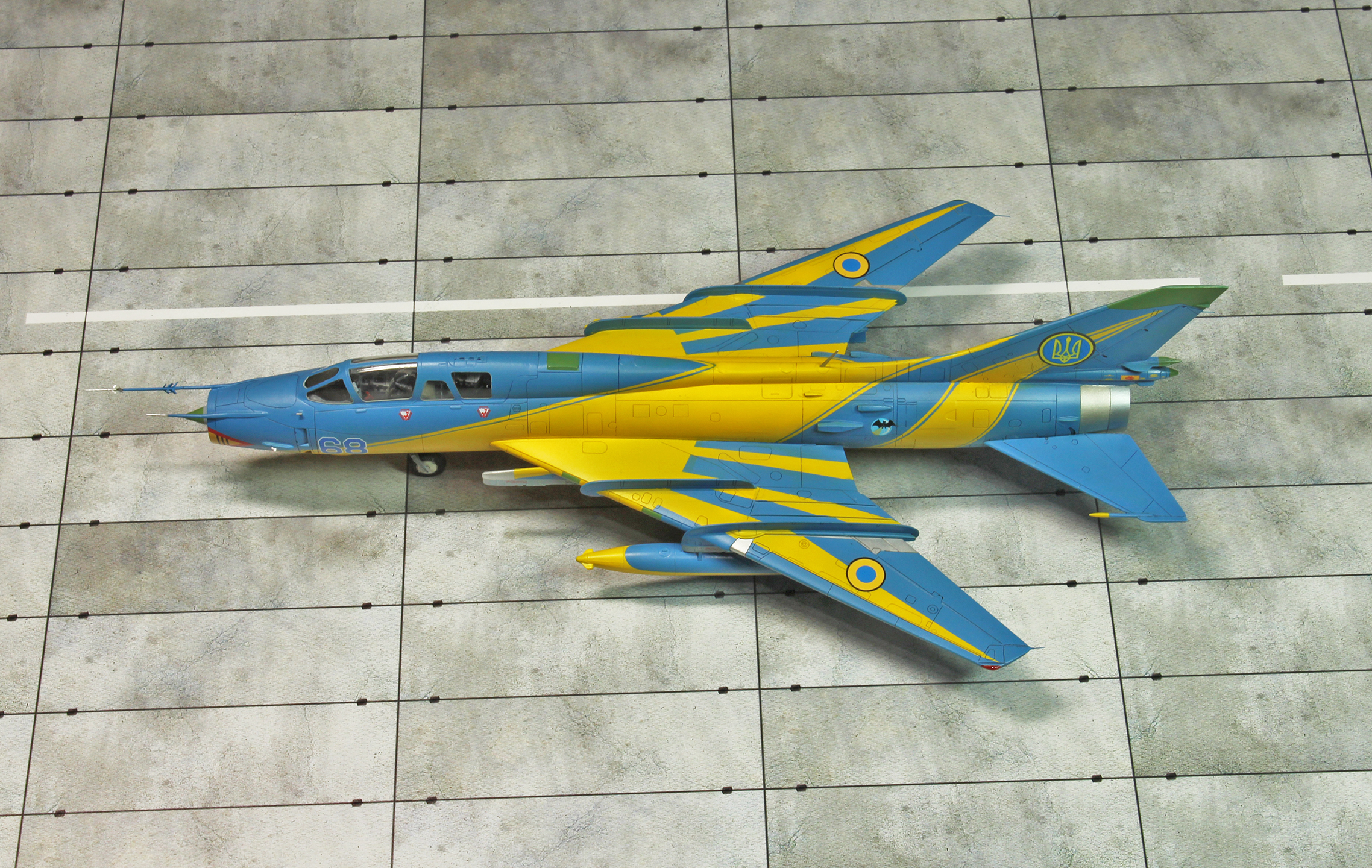 Желание окрасить модель в необычную "парадную" ливрею появилось сразу после того, как я наткнулся лишь на одну фотографию прототипа. Покопавшись в сети, я нашел еще несколько фотографий и принялся за дело. Получил интересный опыт. Результатом доволен, хотя если бы делал что-то такое же еще раз, пошел бы немного по другому пути. Должен указать, что глаза летающей мыши на пузе модели - чистая отсебятина. В реальности они должны быть в форме ромба синего цвета. На этапе покраски я о них полностью забыл. Трезуб на киле бутерброд из двух декалей и накрашенной черной подложки. Он слишком большой, но это вынужденное допущение. В запасах не было герба в синем круге меньшего размера. Бортовые номера на фюзеляже хорошо подошли как по размеру, так и по шрифту, правда на прототипе они еще дублируются на топливных баках, но увы, те что у меня есть, слишком большие. Технички на модели минимум по аналогии с прототипом. На фотографиях их просматривается минимум.