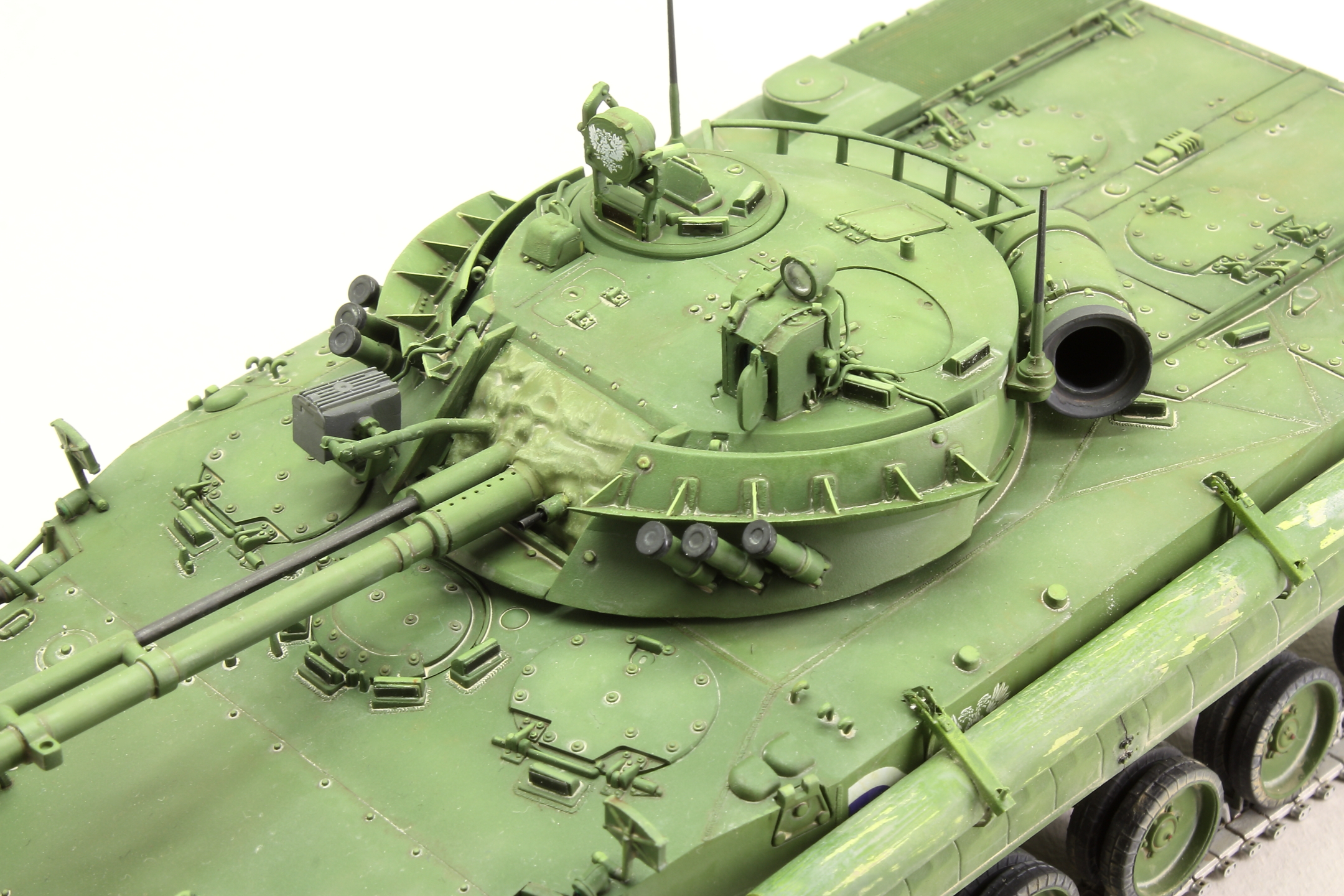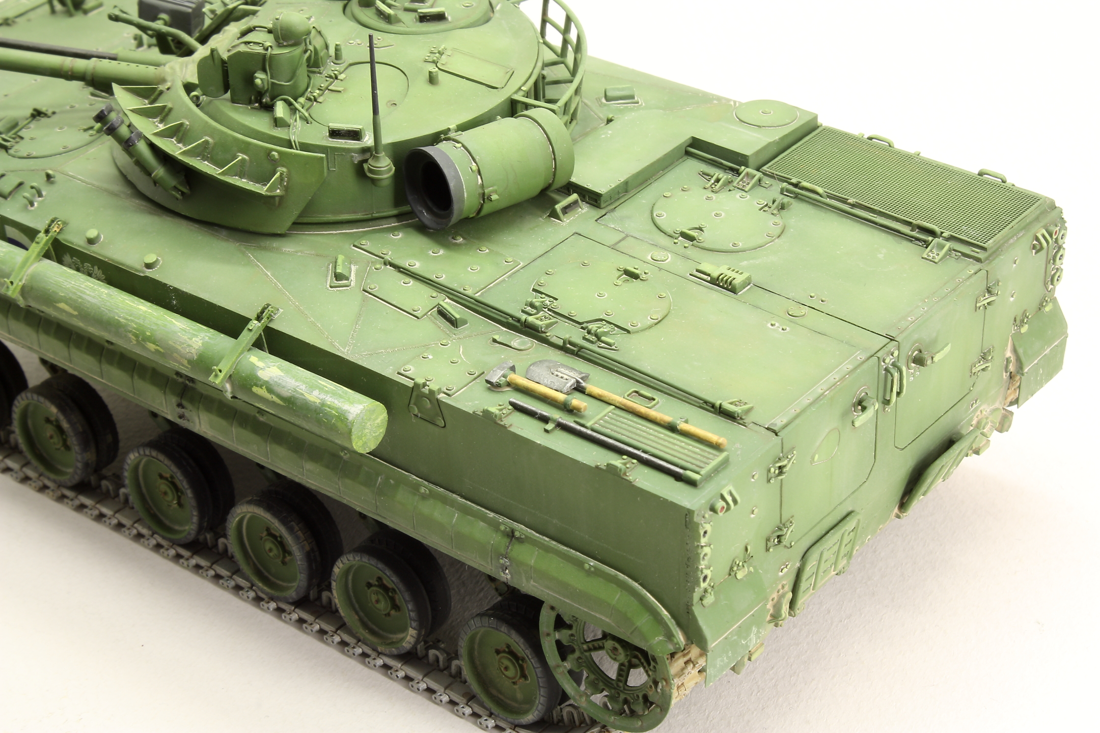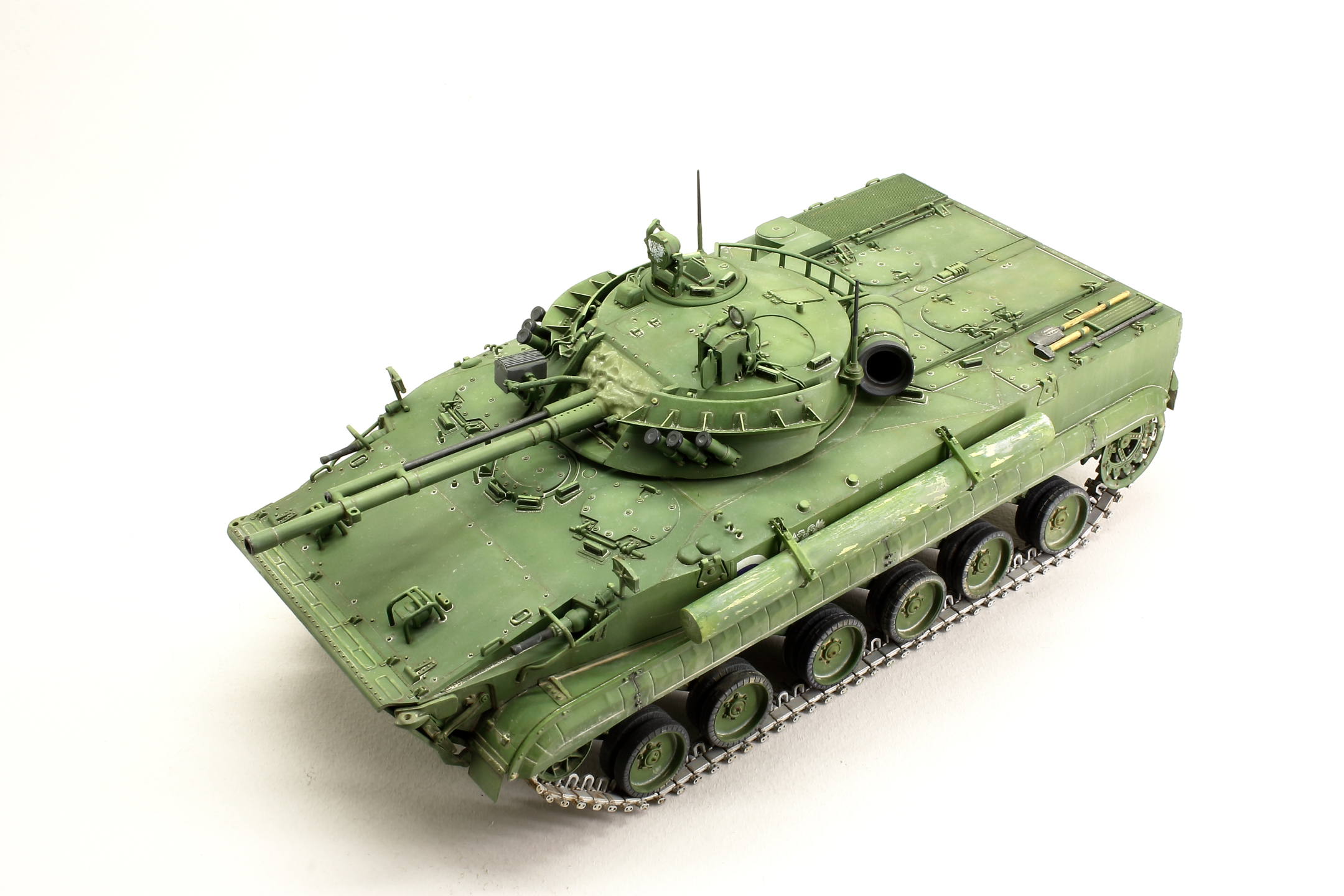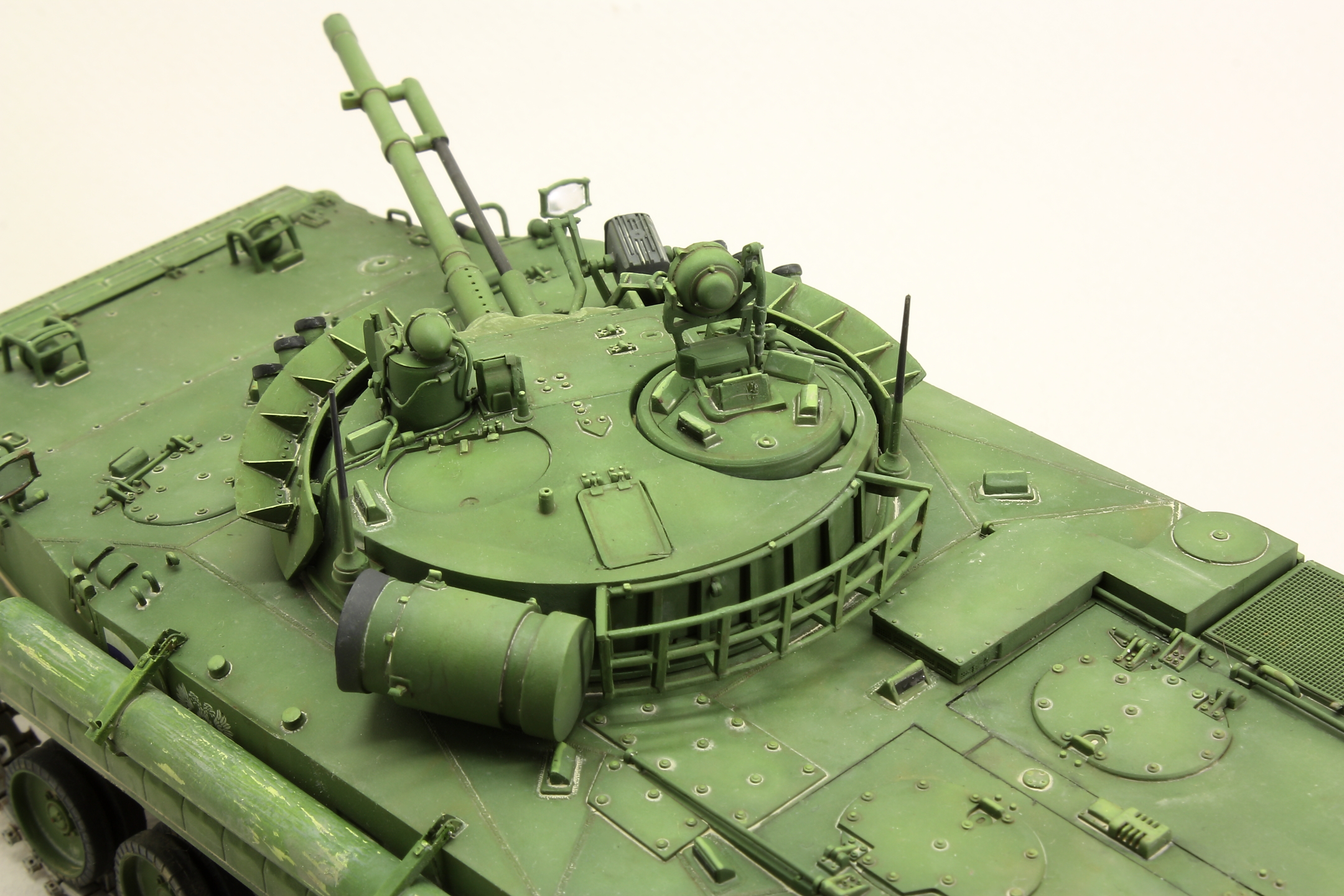 Доработок было немного: заменил слишком толстые ребра жесткости на тонкий листовой пластик, сделал проводку на башне, выкрасил отражатели молотовым (молотов очень понравился), доработал смотровые приборы, заменил спаренный пулемет на точеный.