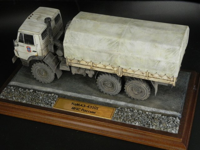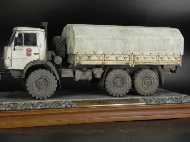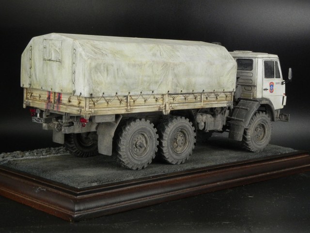 Я использовал травлёнку от "Минродизайна" и колёса "Miniarm". Тент взял от КаМАЗа "Звезды". На удивление, подошёл один в один. Только пришлось перенести отверстия для шнуровки. Для иммитации самой шнуровки использовал мононить. Именно под таким названием эта нить продаётся в "Леонардо". Легко красится, не ворсится. В общем, идеально подошлп для моих целей. В качестве прототипа взял машину МЧС. Фотографий таких КаМАЗов разной степени испачканности полно в сети. Очень мне понравились разные оттенки "белого" на кабине, кухове и тенте. Их и попытался воспроизвести.
