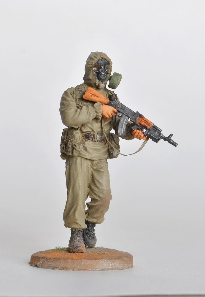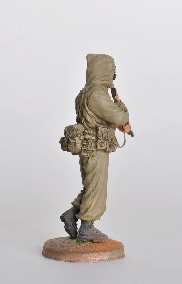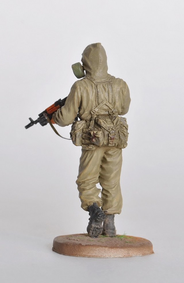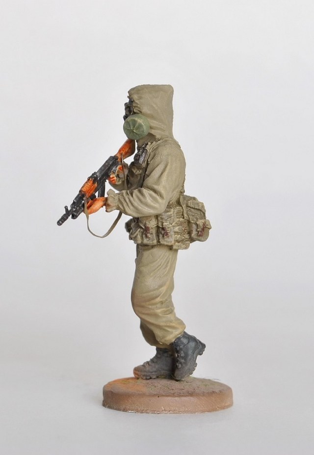 Я сначала решил, что боец в защитном костюме Л-1, но более внимательно изучив вопрос, понял, что это обычный ХБ. От себя добавил только ремень к АК, окраска акрил Тамия и Акан.