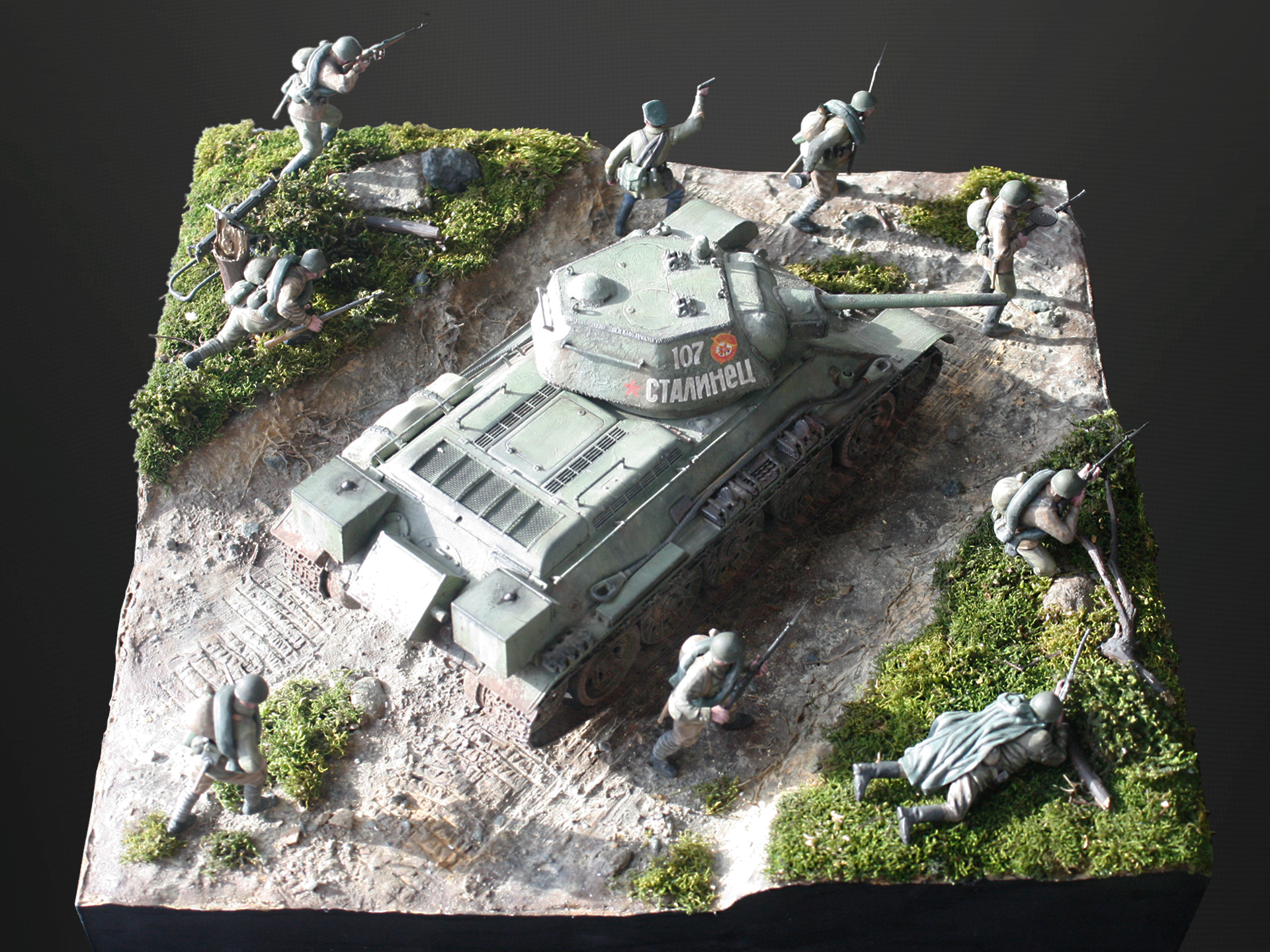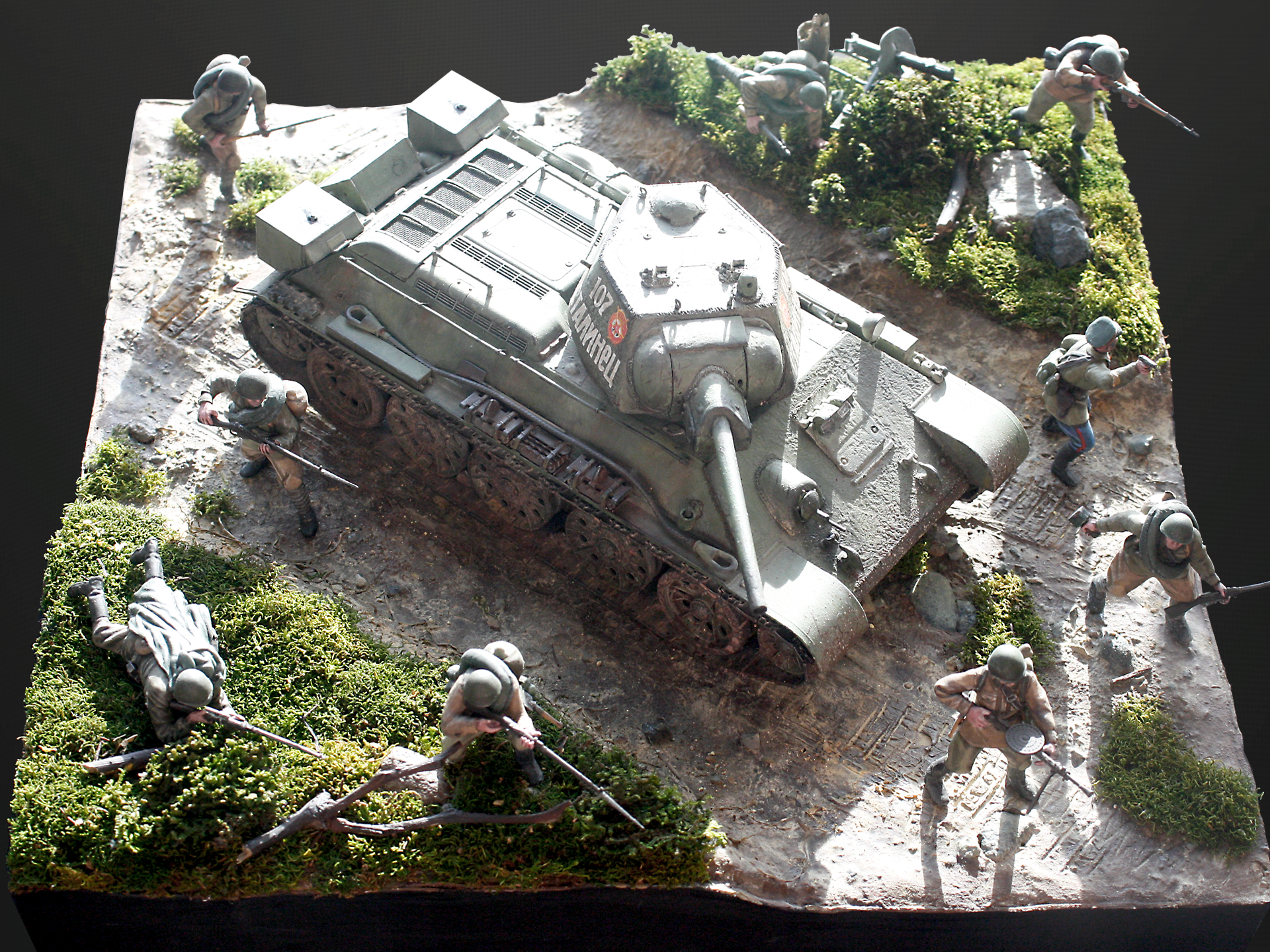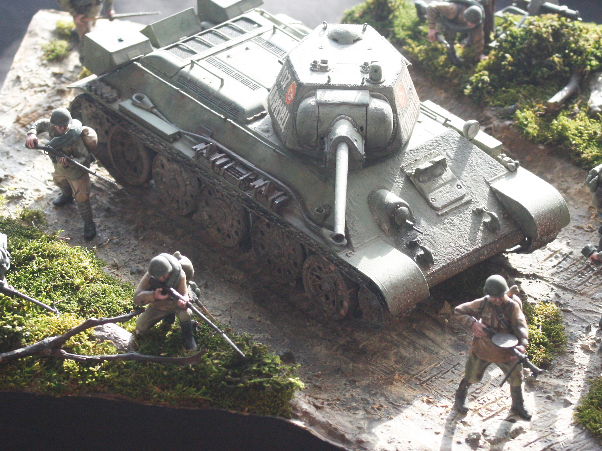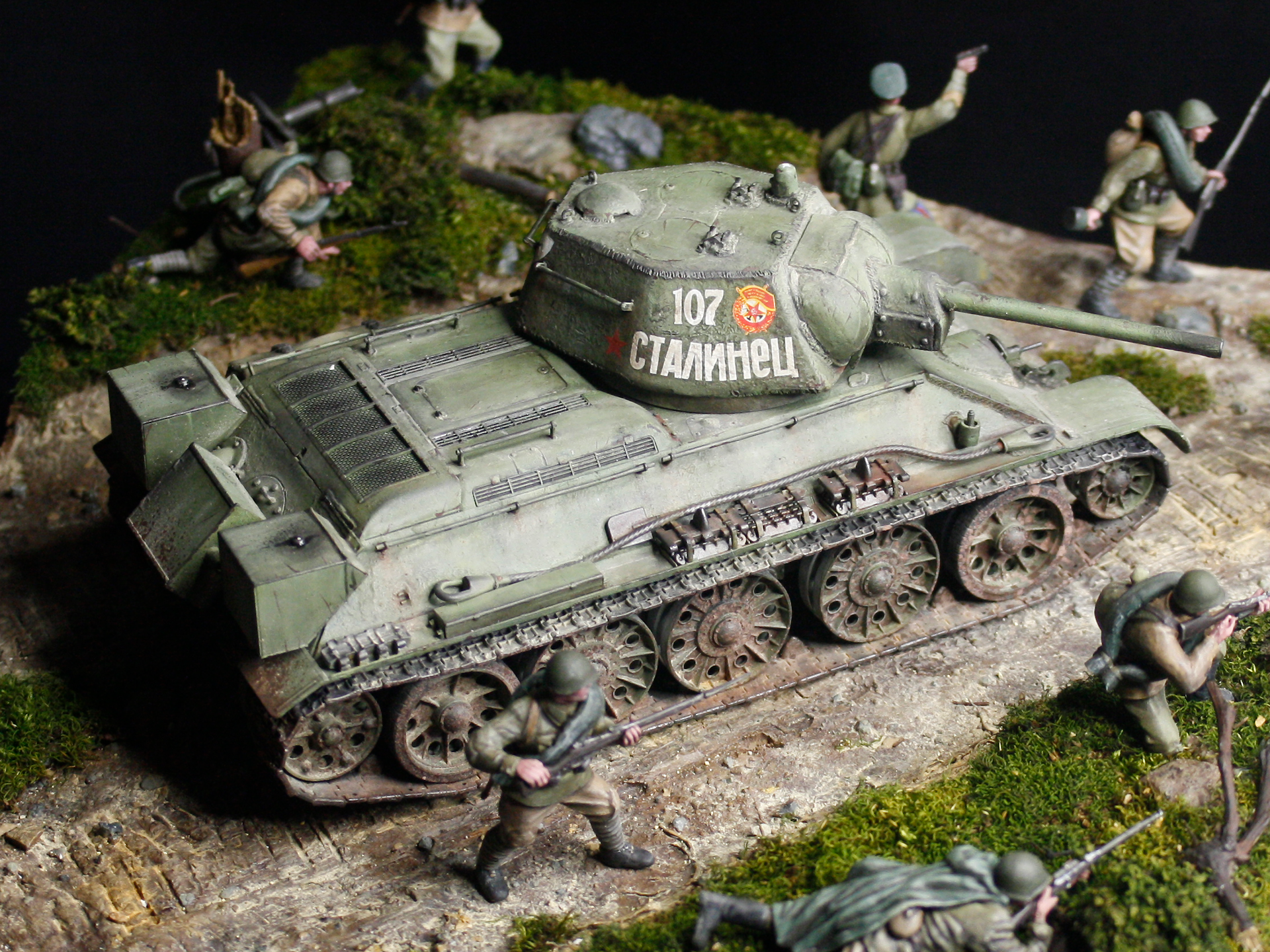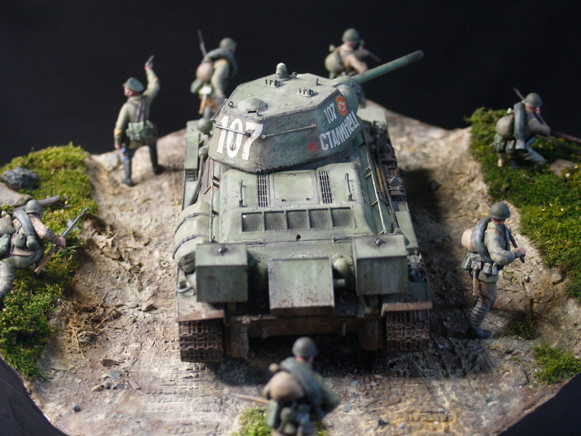 Танк: Т-34/76, обр. 1942 г. от "Звезды" - отличный свежий набор, собирается легко и приятно. Из доработок: фактура брони, немного поцарапал и состарил. В остальном вся моделька "из коробки".
