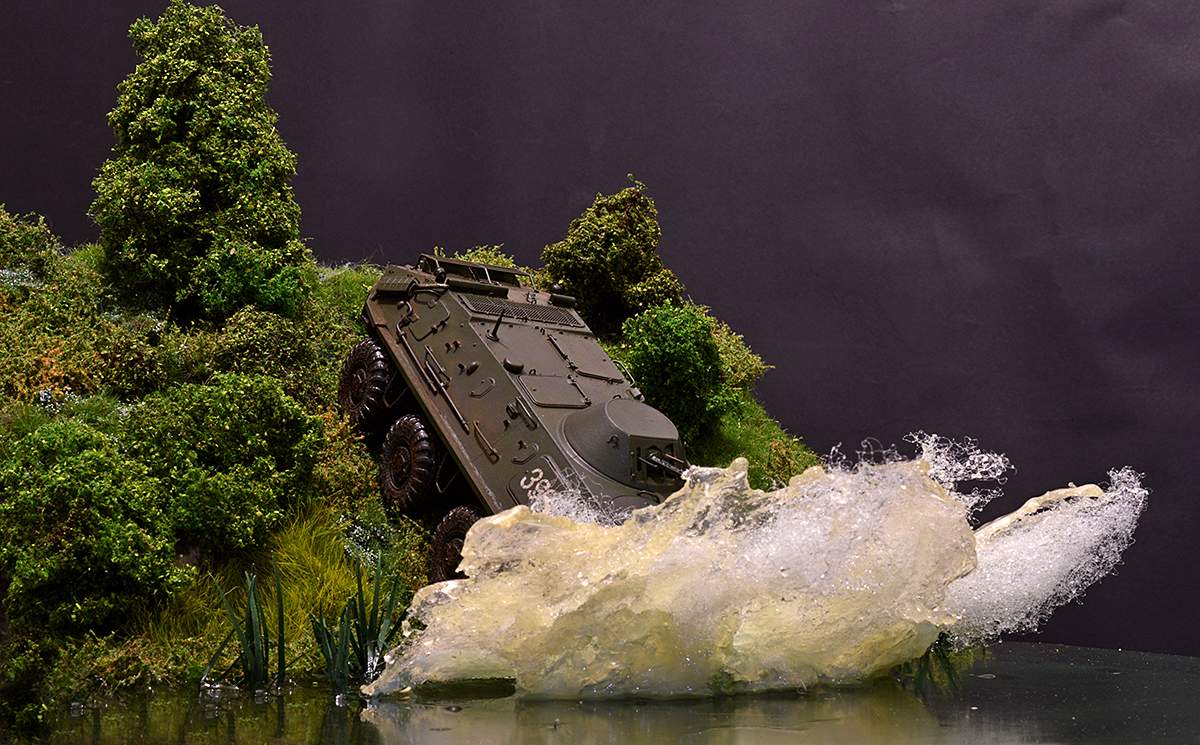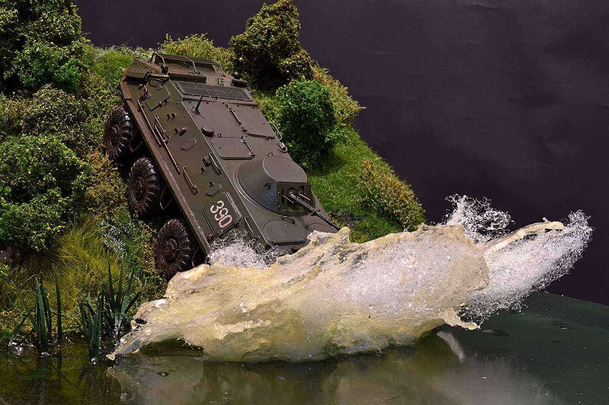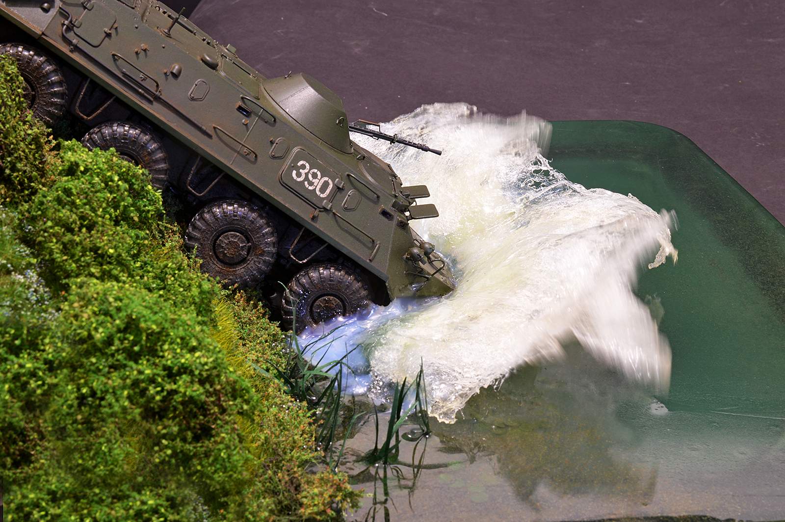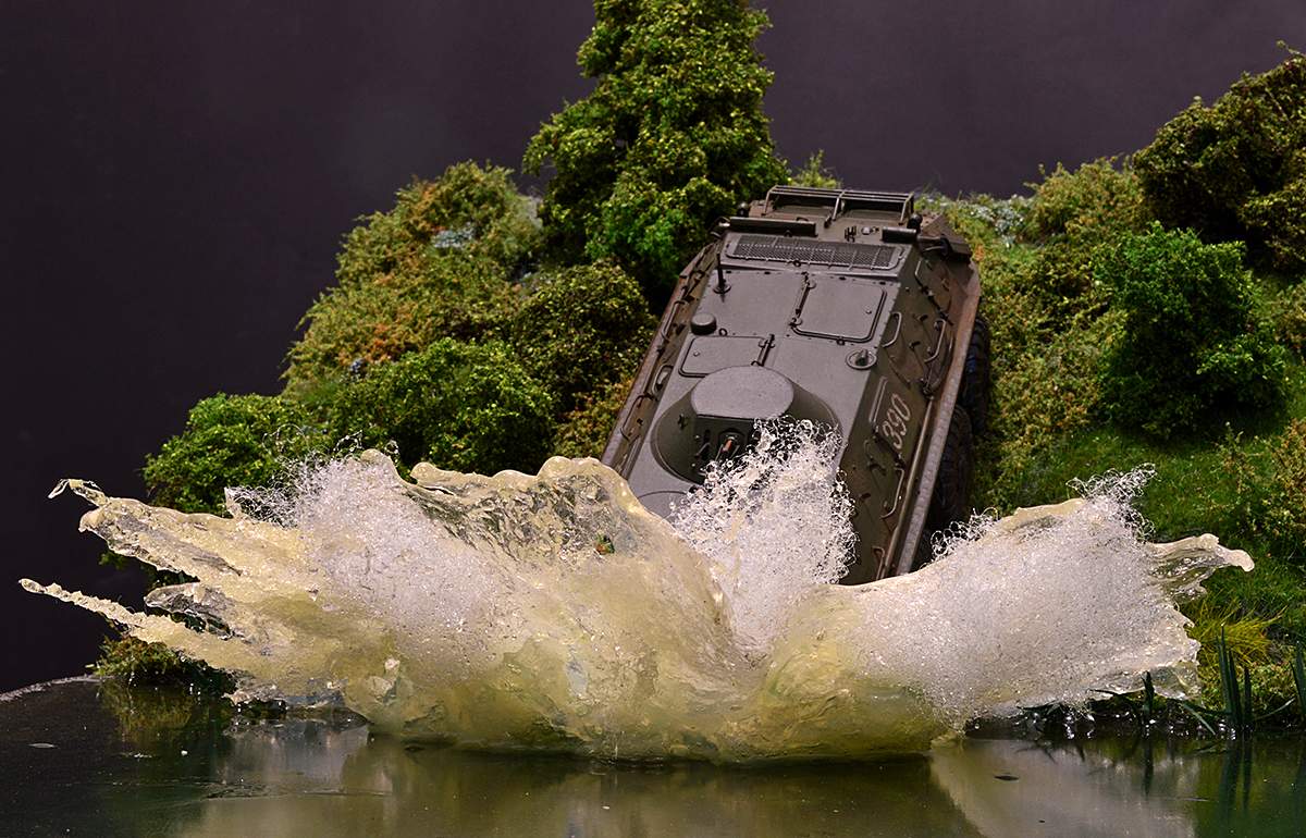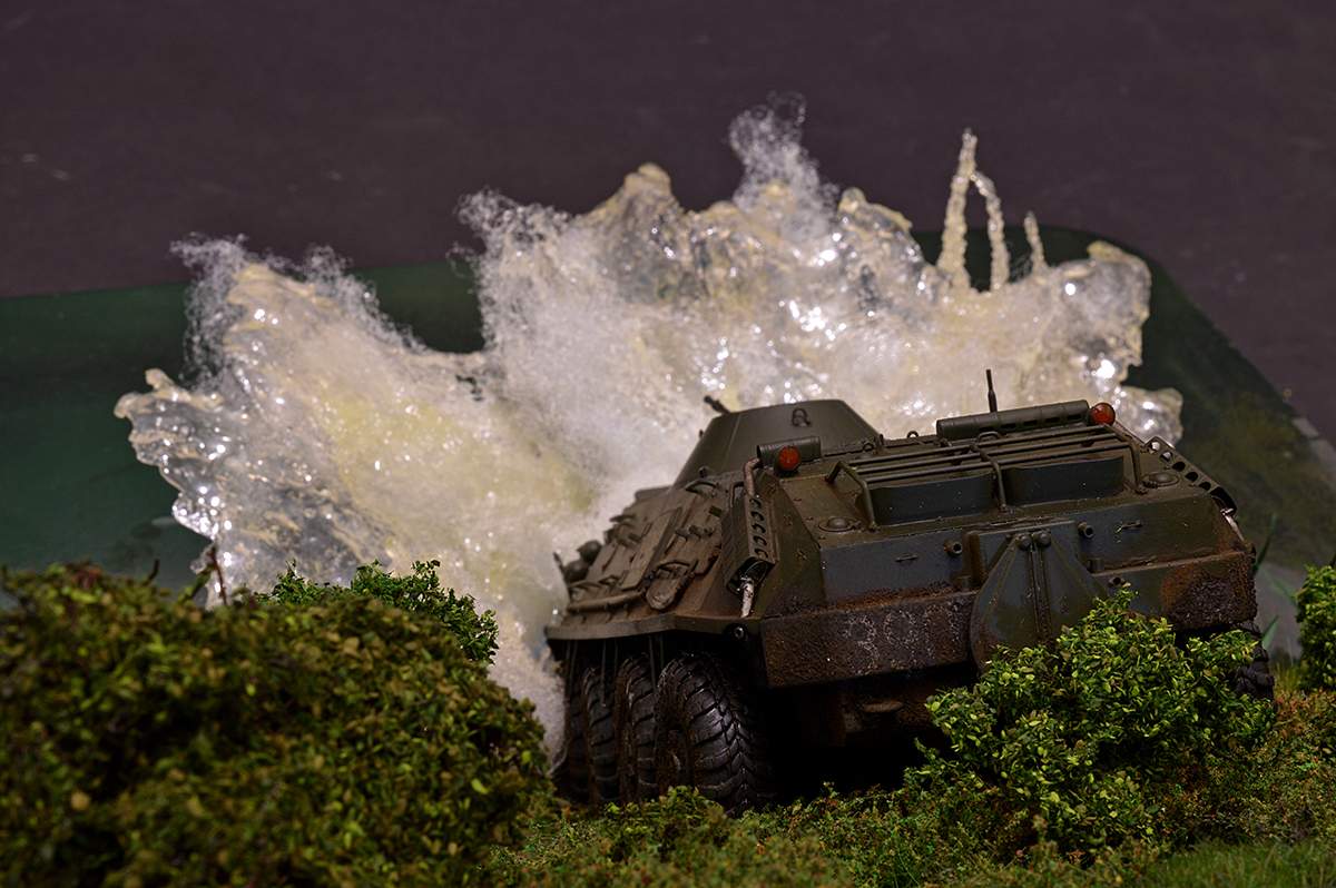 Отличная идея, Гена! Берег с растительностью замечательный. А вот БТР слишком чистенько выглядит. Игрушечно. Какой то везеринг на броню от бешенной погони по грязным дорогам требуется. Для первого опыта создания всплеска неплохо, но можно лучше. Фото спецэффекты хорошо. Но только для публикации на сайте. А работа выглядит в статике. Поэтому правильнее усилить эффект другими дополнительными методами создания пены и брызг, которые от камеры не будут зависеть. Даю ссылку на стройку, где мастер работает над всплеском от БТР https://diorama.ru/forum/viewtopic.php?f=11&t=19655&start=40 . Более лучшей работы я не встречал.