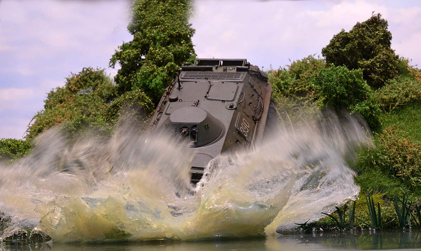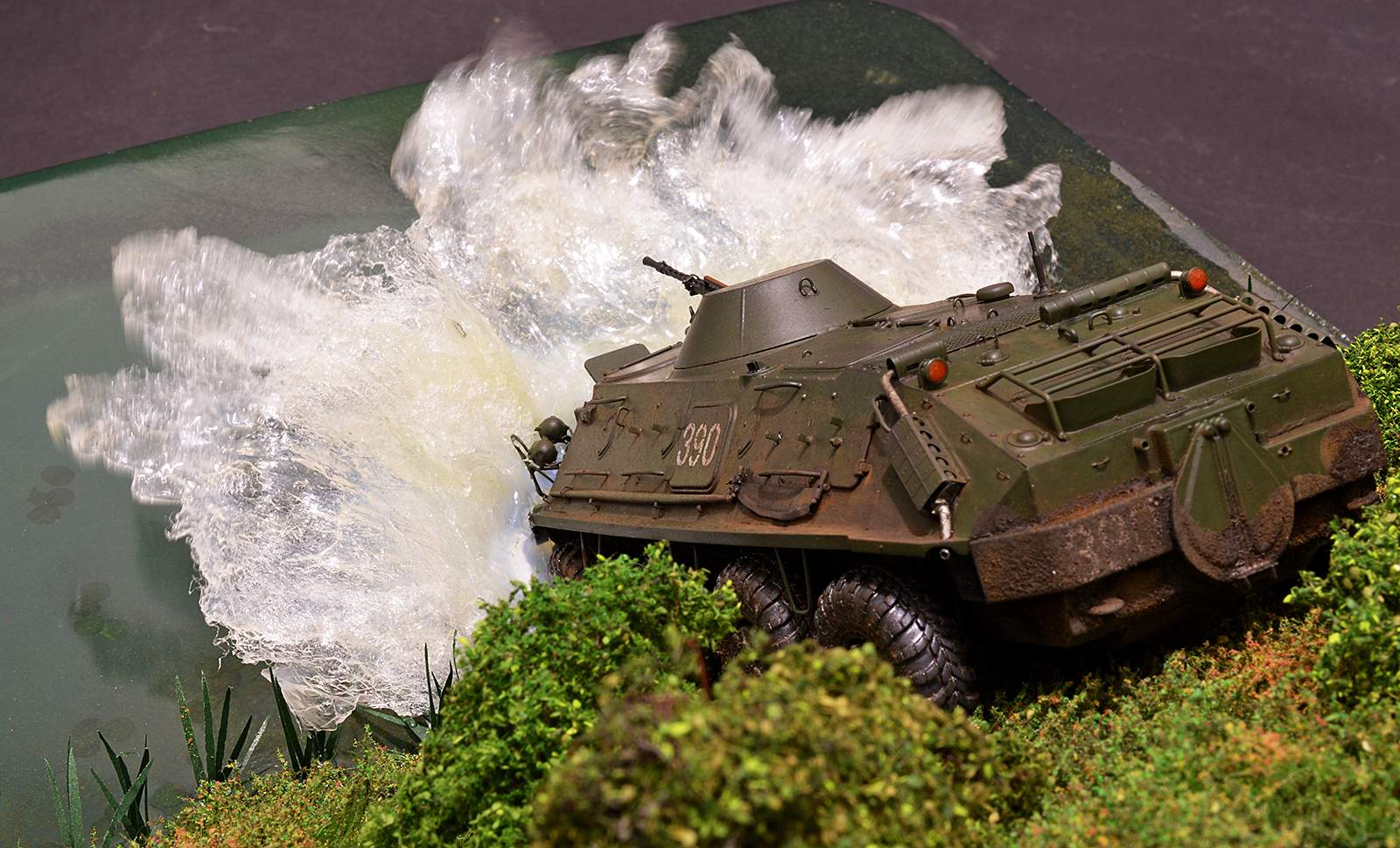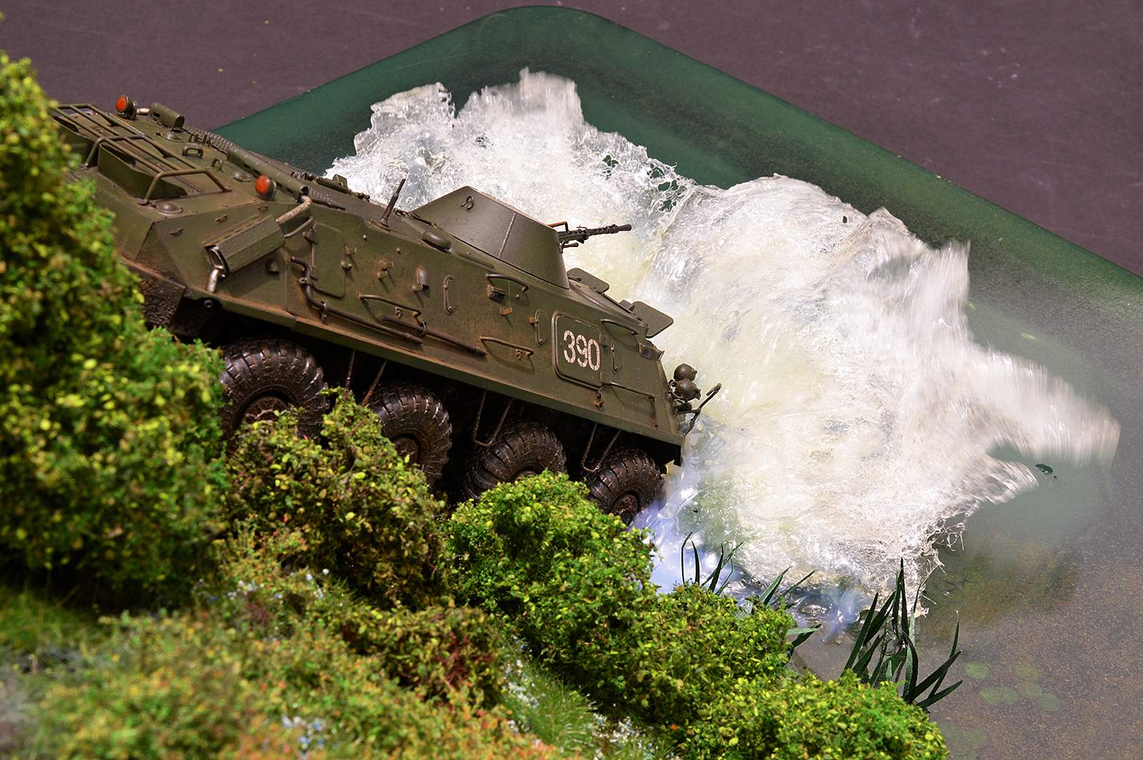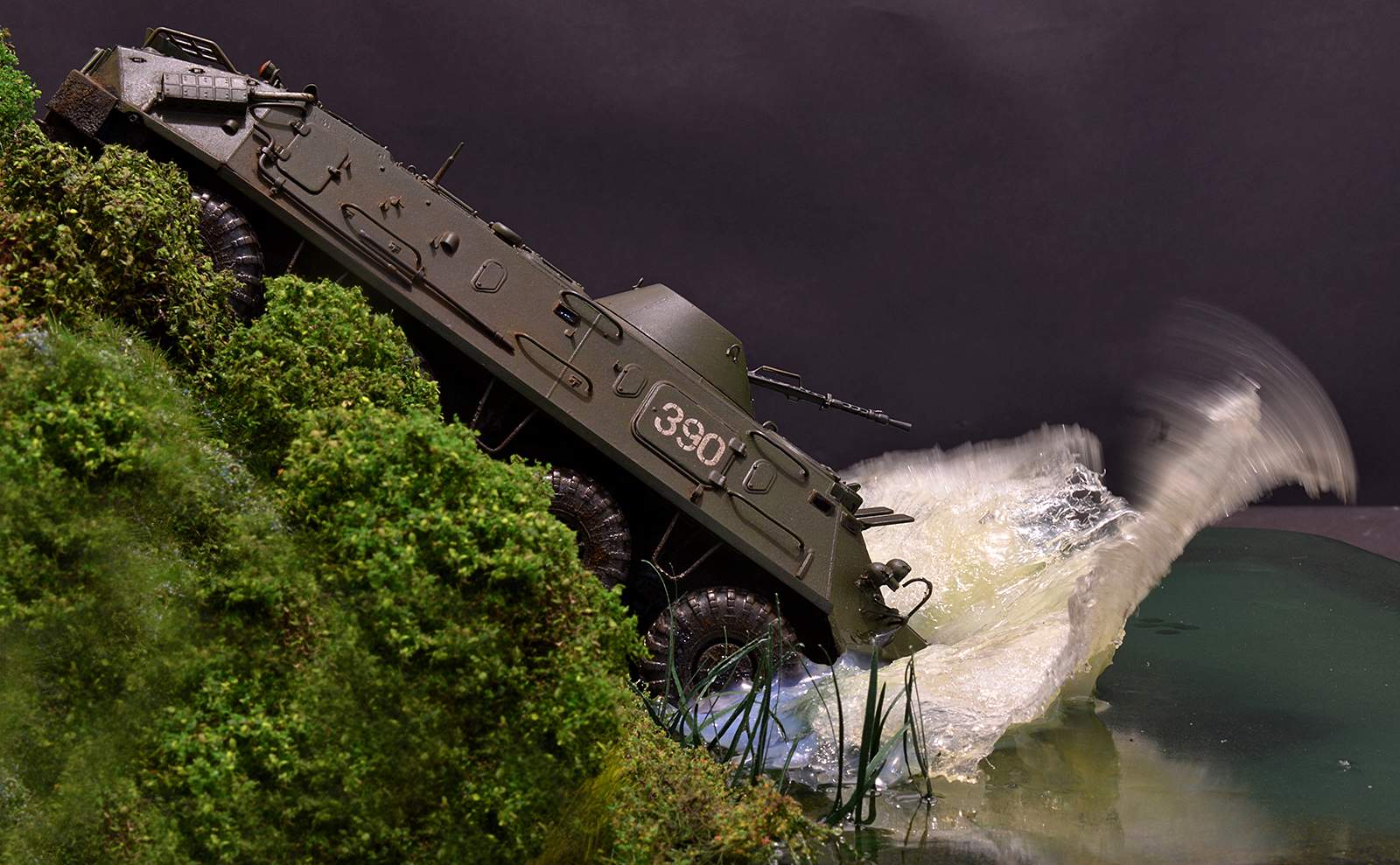 Отличная идея, Гена! Берег с растительностью замечательный. А вот БТР слишком чистенько выглядит. Игрушечно. Какой то везеринг на броню от бешенной погони по грязным дорогам требуется. Для первого опыта создания всплеска неплохо, но можно лучше. Фото спецэффекты хорошо. Но только для публикации на сайте. А работа выглядит в статике. Поэтому правильнее усилить эффект другими дополнительными методами создания пены и брызг, которые от камеры не будут зависеть. Даю ссылку на стройку, где мастер работает над всплеском от БТР https://diorama.ru/forum/viewtopic.php?f=11&t=19655&start=40 . Более лучшей работы я не встречал.