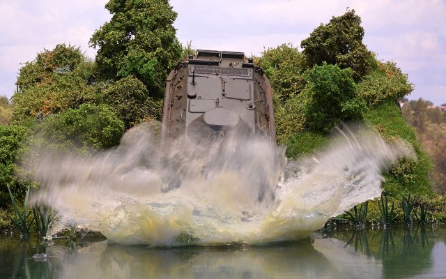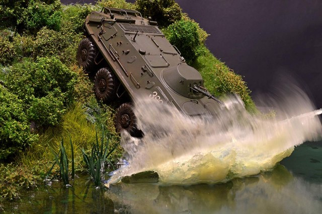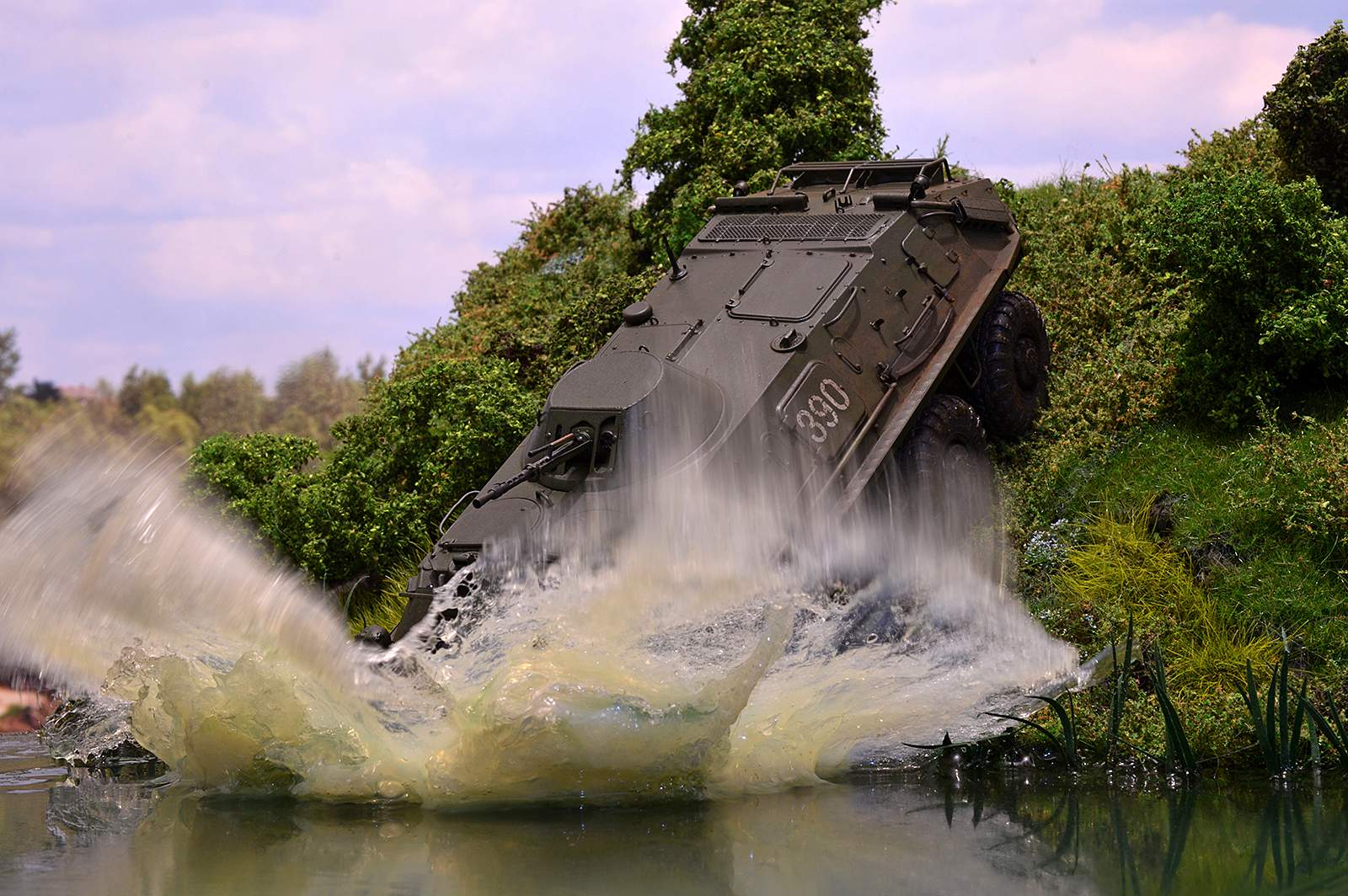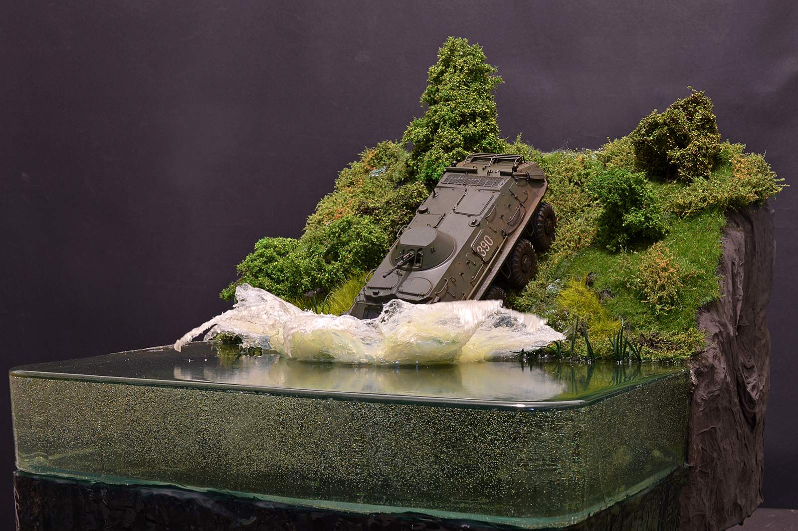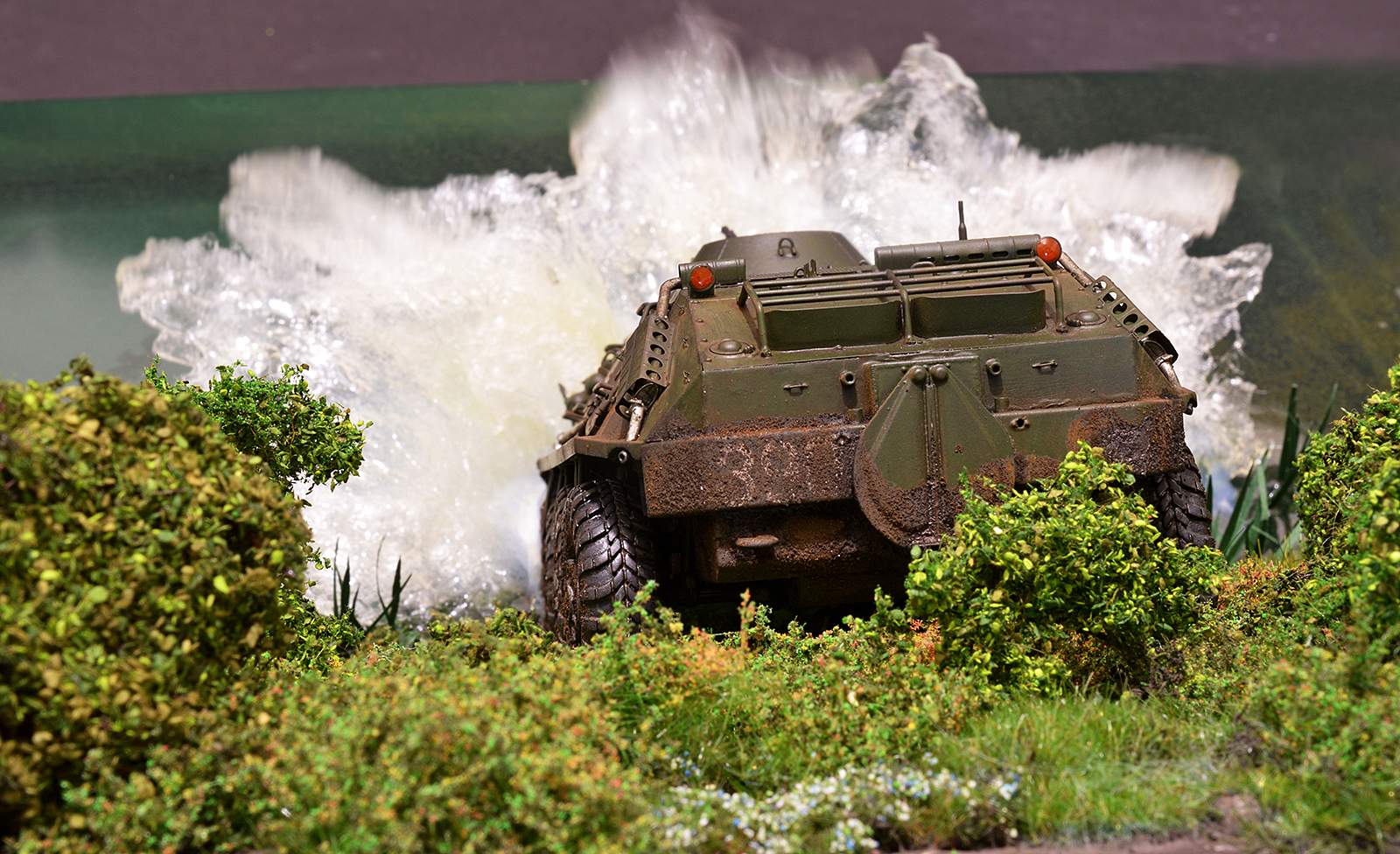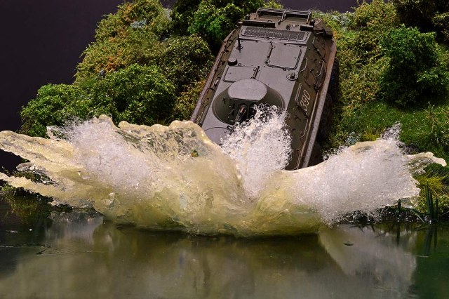Отличная идея, Гена! Берег с растительностью замечательный. А вот БТР слишком чистенько выглядит. Игрушечно. Какой то везеринг на броню от бешенной погони по грязным дорогам требуется. Для первого опыта создания всплеска неплохо, но можно лучше. Фото спецэффекты хорошо. Но только для публикации на сайте. А работа выглядит в статике. Поэтому правильнее усилить эффект другими дополнительными методами создания пены и брызг, которые от камеры не будут зависеть. Даю ссылку на стройку, где мастер работает над всплеском от БТР https://diorama.ru/forum/viewtopic.php?f=11&t=19655&start=40 . Более лучшей работы я не встречал.