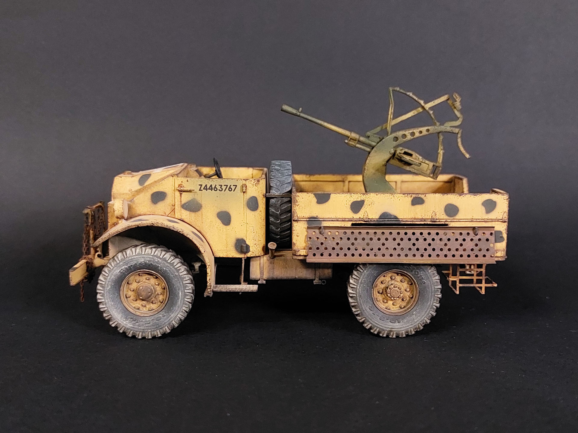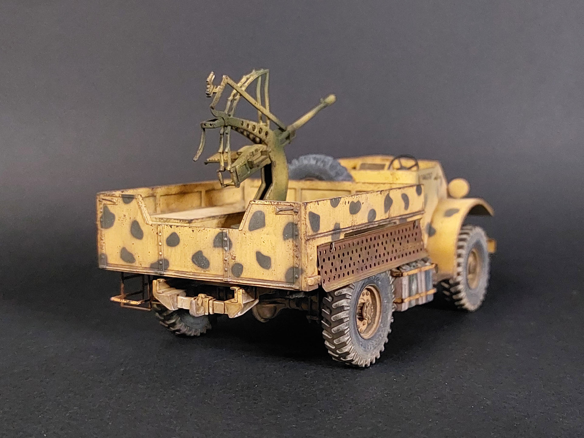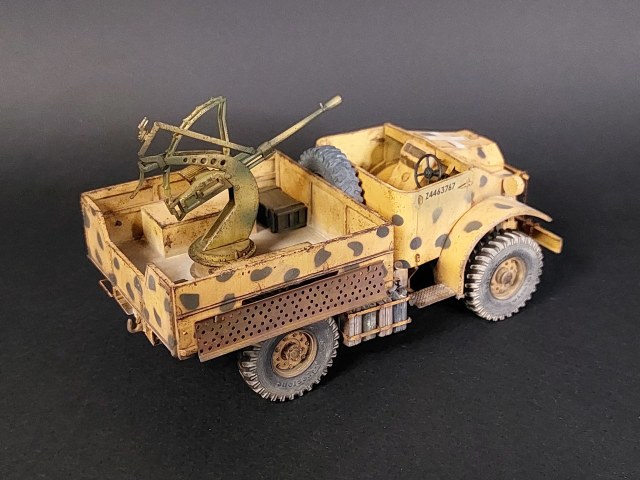 Собирается модель достаточно неплохо. Однако особенно внимательно следует склеивать кабину, чтобы не нарушить ее сложную геометрию. Иначе возникнут проблемы при посадке кабины на раму. В процессе стройки родные колеса были заменены смолой того же производителя, а ствол зенитки на металлический от Aber. По задумке это британский грузовик захваченный итальянцами в Северной Африке и переделанный в ган трак путем установки в кузове орудия Breda (mod.1939). Отсюда британский камуфляж, состоящий из базы (British Sand Yellow) и черных пятен, и зенитная установка, окрашенная в итальянские цвета.
